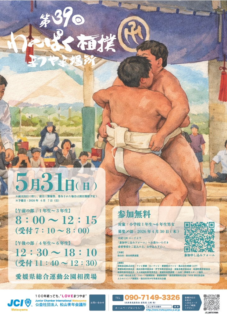 活動・ 事業報告 ひと・まちが輝ける未来を作るために 私たちは取り組んでいます。 View More 事業 2026年4月1日(水) 第39回わんぱく相撲まつやま場所〜心にいつもわんぱくピース〜 報告 2026年4月1日(水) 第1回通常総会 例会 2026年3月21日(土) 3月例会 第2エリア合同公式訪問例会~我々が世界を近づける~ 例会 2026年2月27日(金) 2月例会「語ろう、拡げよう、私たちのJC~JCってやっぱり大事だね~」 事業例会 2026年2月11日(水) 1月例会 賀詞交歓会 事業報告 2026年2月8日(日) 松山春まつり(お城まつり)特設ページ開設のお知らせ