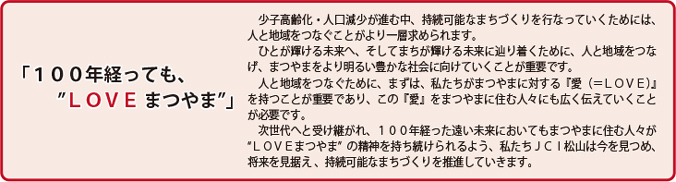人と地域をつなぐために、まずは、私たちがまつやまに対する『愛(=LOVE)』を持つことが重要であり、この『愛』をまつやまに住む人々にも広く伝えていくことが必要です。