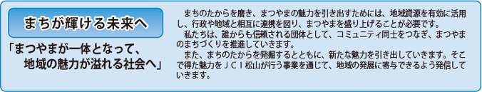 次世代へと受け継がれ、100年経った遠い未来においてもまつやまに住む人々が“LOVEまつやま”の精神を持ち続けられるよう、私たちJCI松山は今を見つめ、将来を見据え、持続可能なまちづくりを推進していきます。