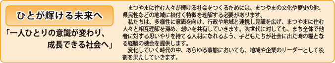 ひとが輝ける未来へ、そしてまちが輝ける未来に辿り着くために、人と地域をつなげ、まつやまをより明るい豊かな社会に向けていくことが重要です。