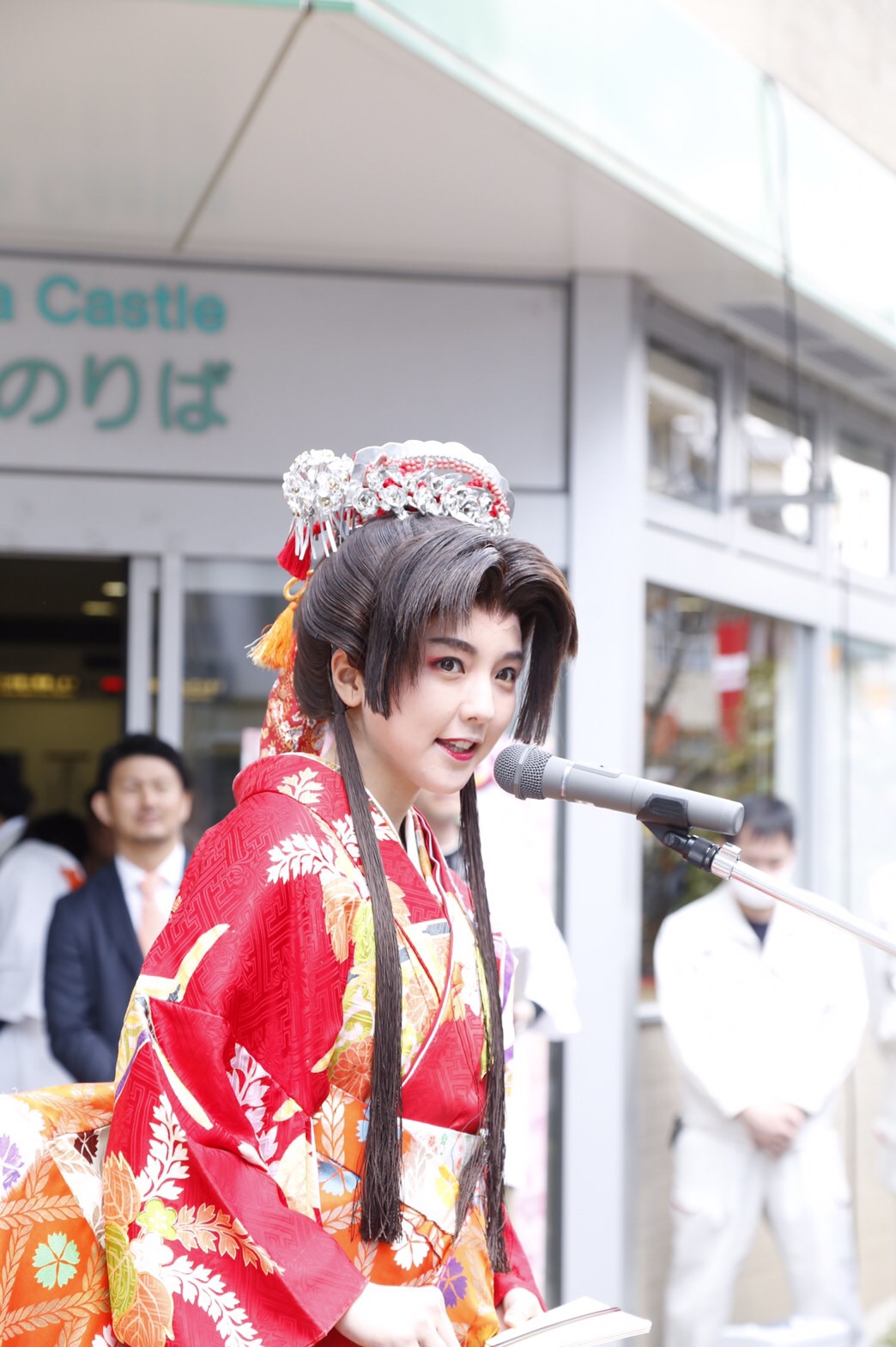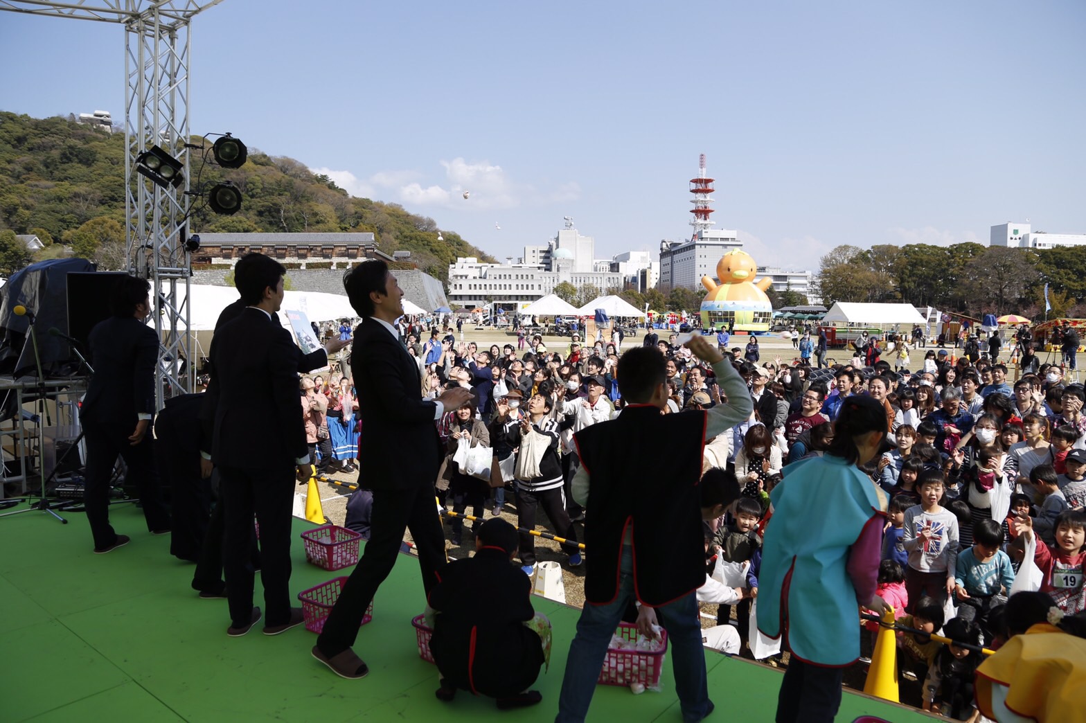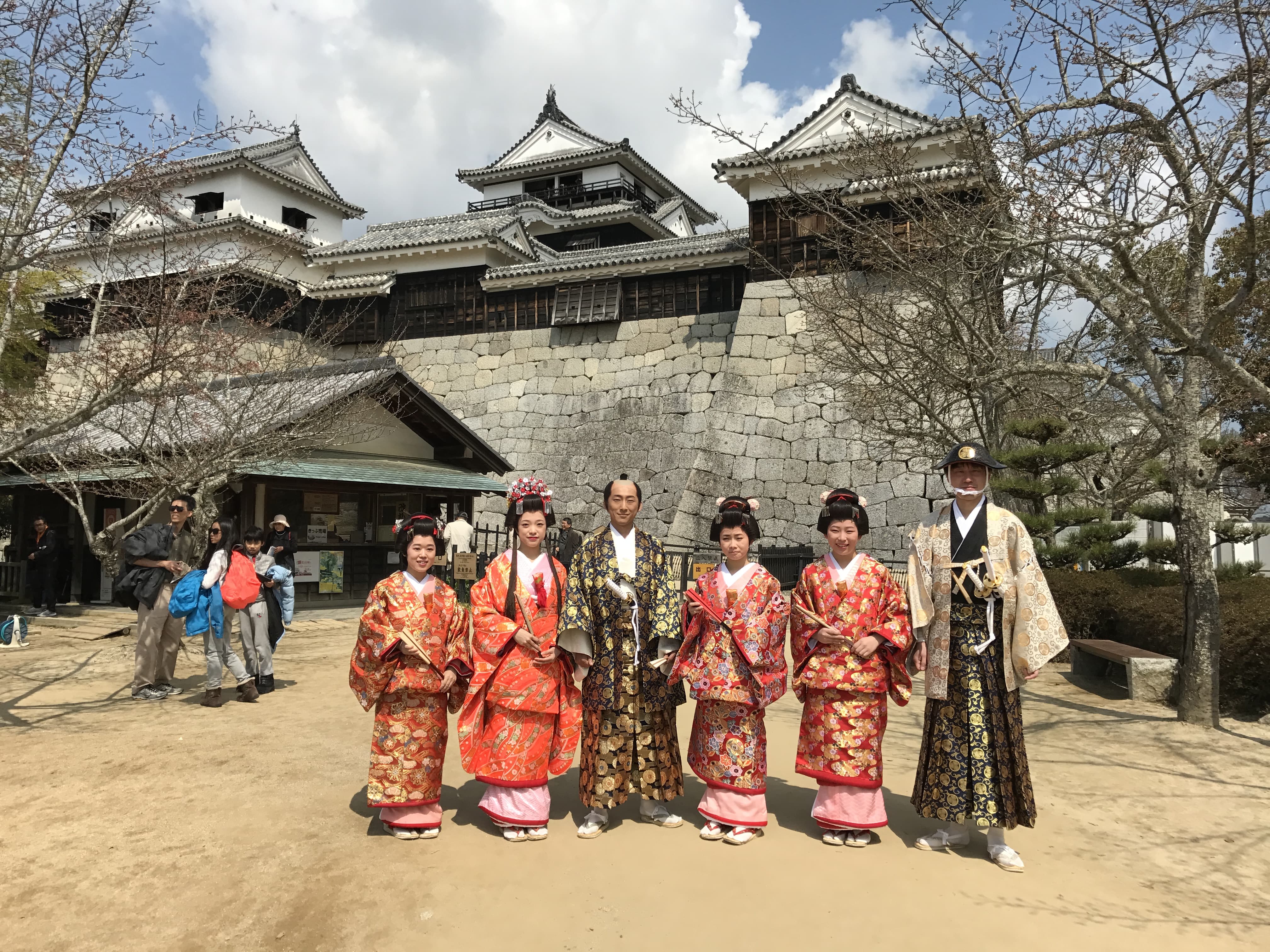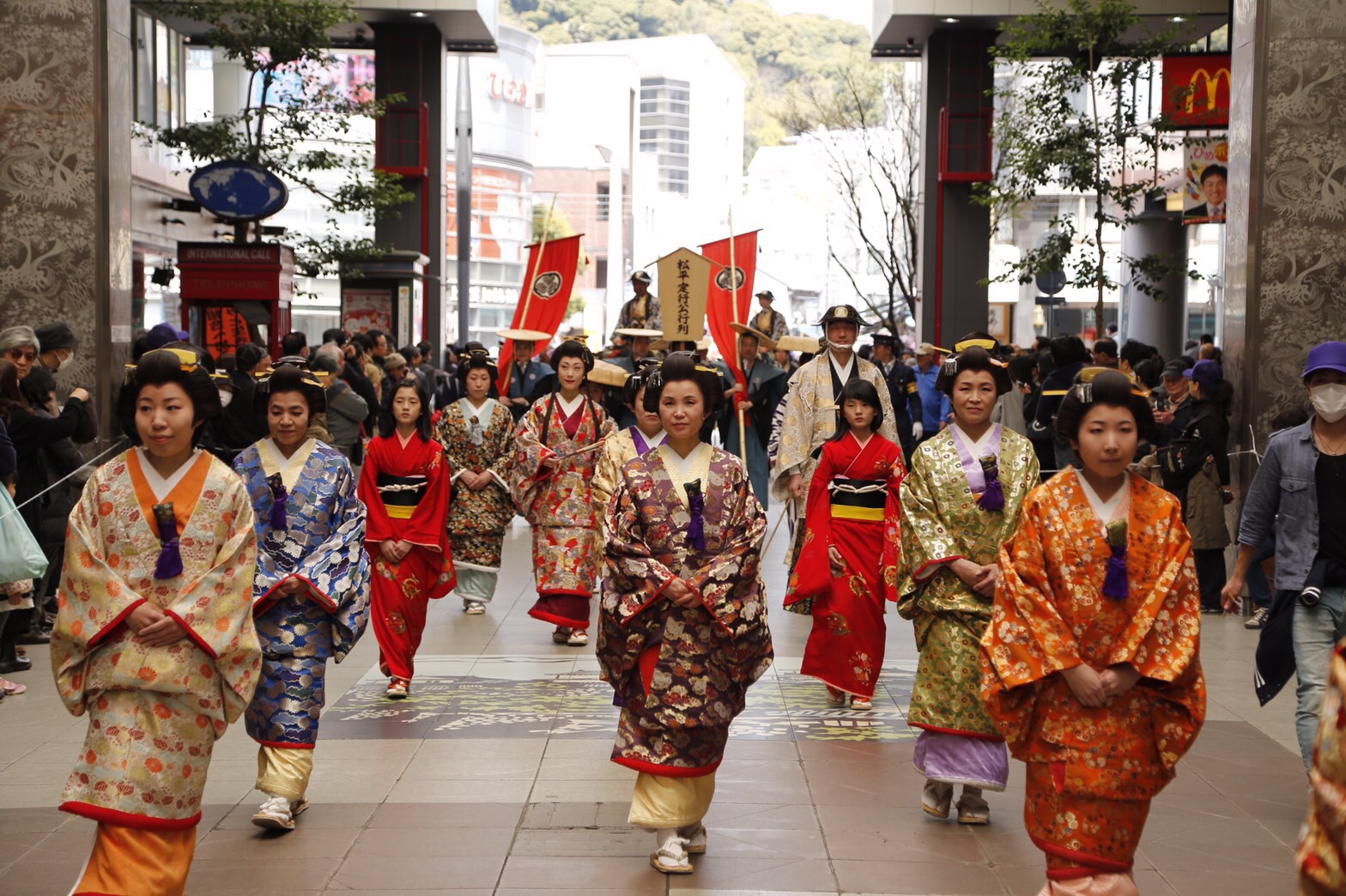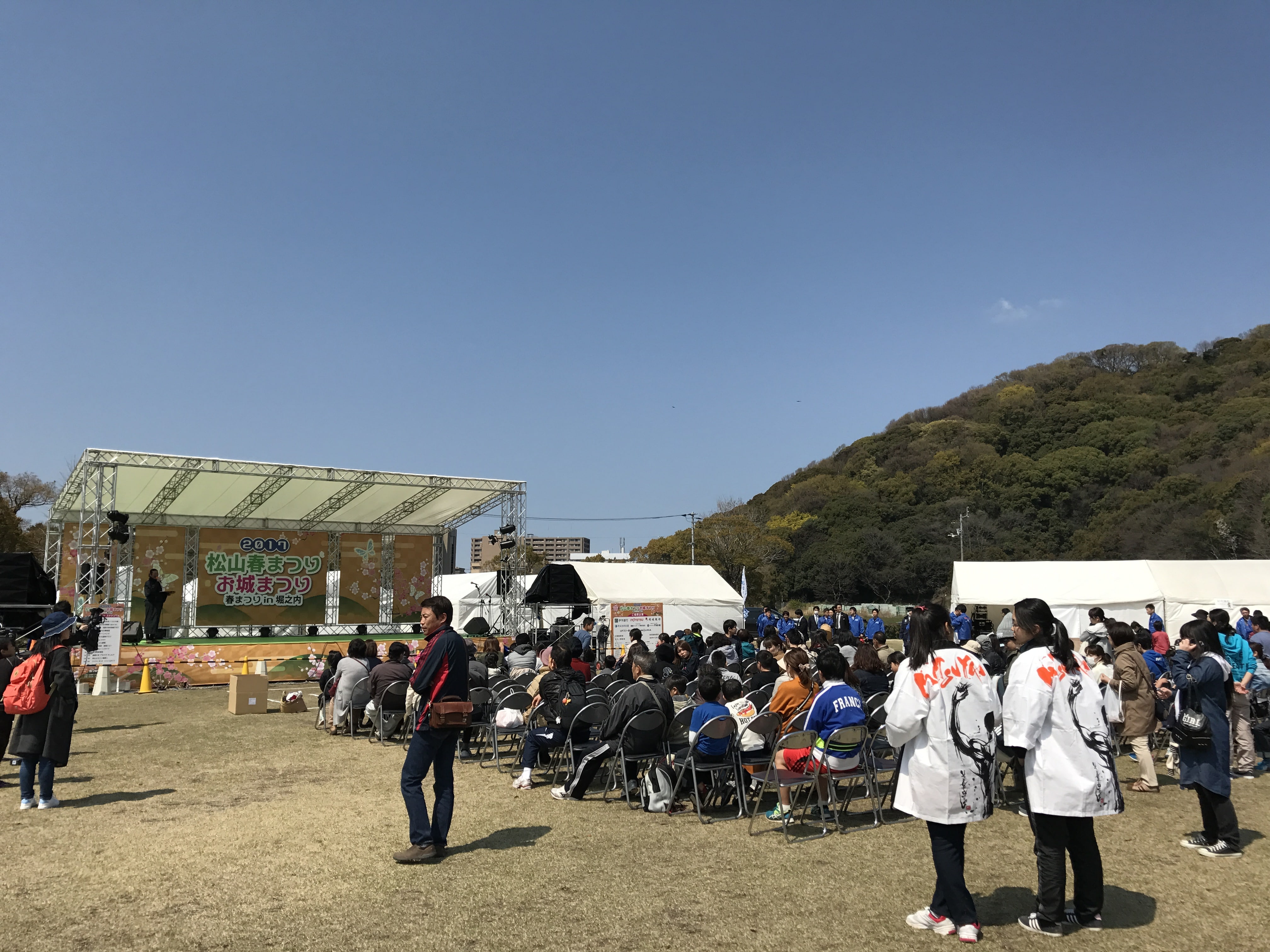 2017年4月2日(日) 平成29年 開催50年記念 松山春まつり(お城まつり) 開催50年の節目の年。今年の松山春まつり(お城まつり)は、松山市ロープウェイ通り・大街道・千舟町通りと、城山公園(堀之内地区)やすらぎ広場で、4月1日・2日の2日間、華々しく開催されました。 毎年恒例の大名武者行列には、お姫様役として女優の真野恵里菜さんをお招きし、甲冑を身にまとった勇ましい武者や江戸時代の大奥を思わせる美しい着物を着た市民と共に、松山の街を絢爛豪華に練り歩きました。 また、城山公園(堀之内地区)やすらぎ広場では、小学生によるチャンバラ大会を初めて催したり、様々なアーティストを招いたステージイベントなど、来場者を飽きさせない事業が展開されました。