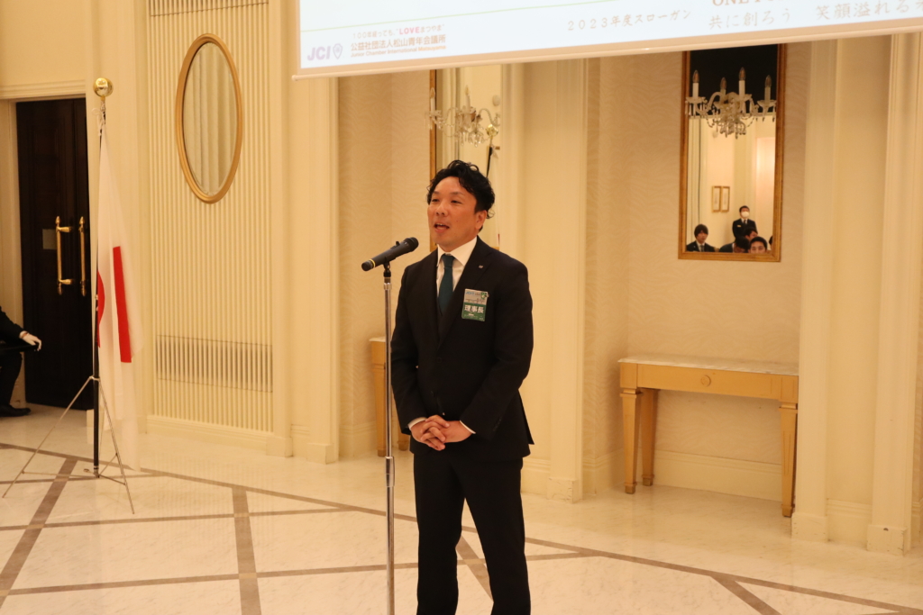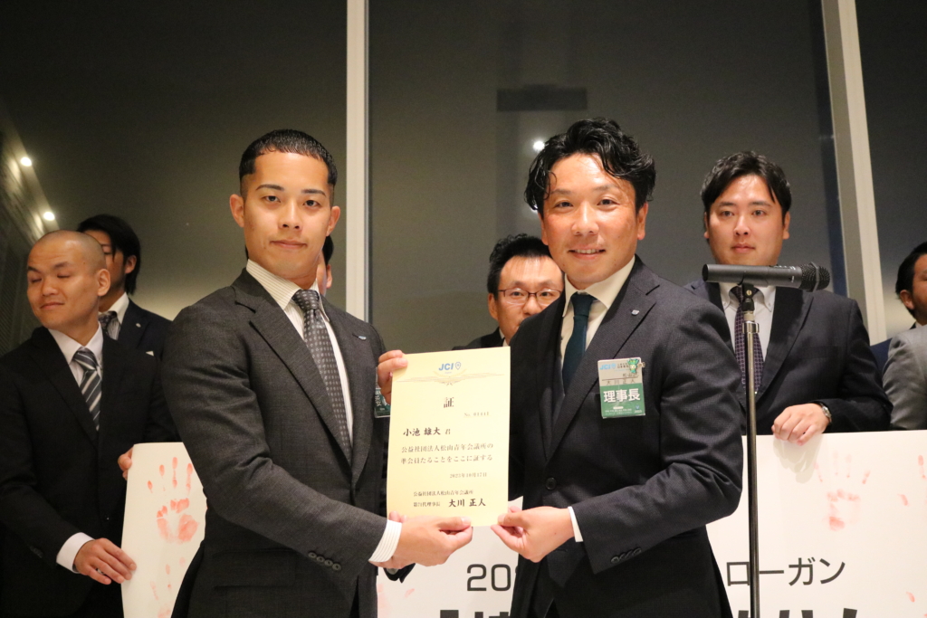 2023年10月19日(木) 10月例会「新入会員入会式・新正会員証授与式」 2023年10月17日(火)ベイサイド迎賓館松山にて10月例会「新入会員入会式・新正会員証授与式」が開催されました。 新入会員入会式では、新入会員がチャペルにてスローガンの発表やバナーへの手形押しを行い、メンバー全員で新入会員の入会を祝いました。 また、新正会員証授与式では、屋外のプールサイドにて新正会員が青年会議所活動への意気込みを表明するとともに、委員長から激励のことばをもらいました。メンバーがひとつとなり、これからの青年会議所活動が益々活発に行われる契機となる例会となりました。 皆様も松山青年会議所の活動へ参加してみませんか? 松山青年会議所への入会お待ちしております。
