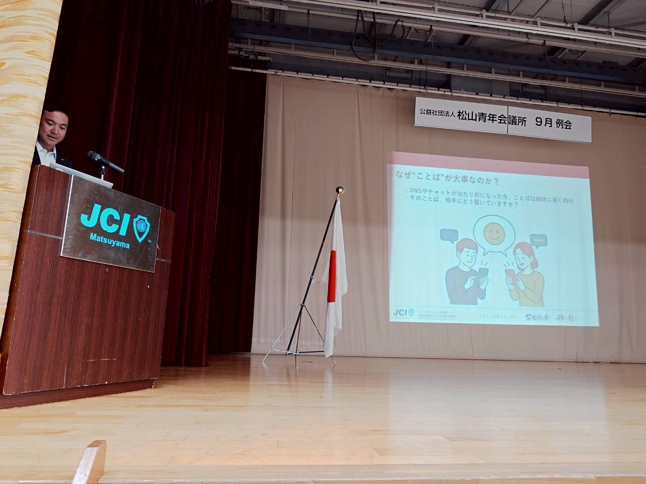 まっとる犬!とのコラボでことばのちからの浸透と松山JCイメージを拡散していきます。 日常の中で発する一言が、人との関係や社会にどう作用するかを体感する例会となりました。