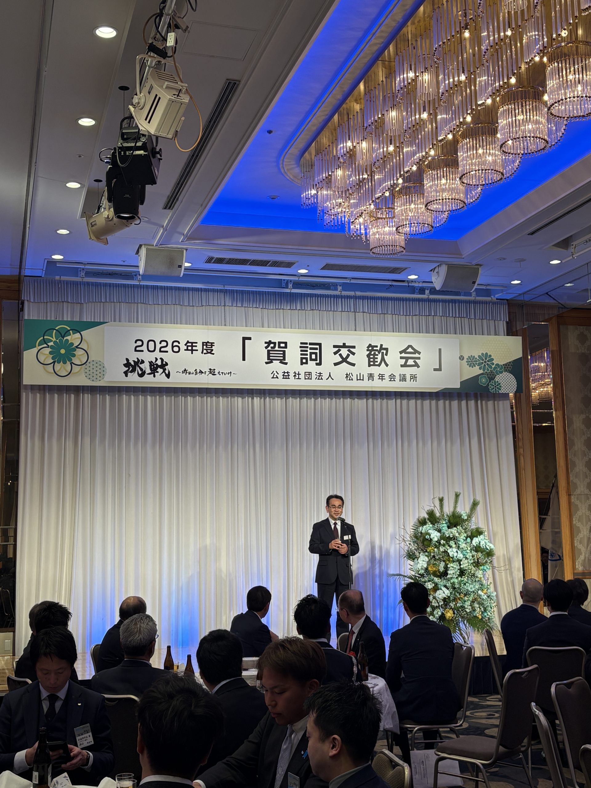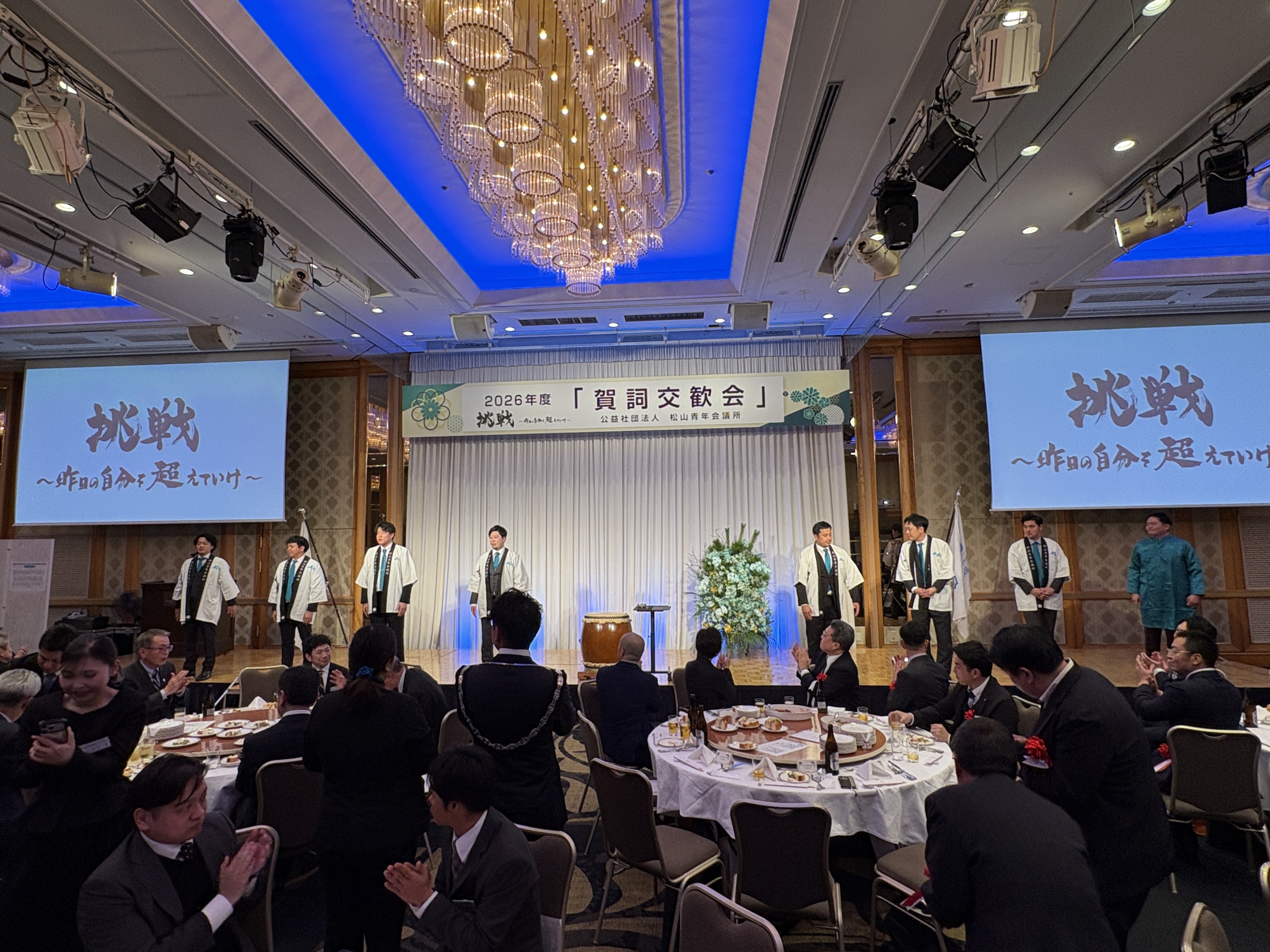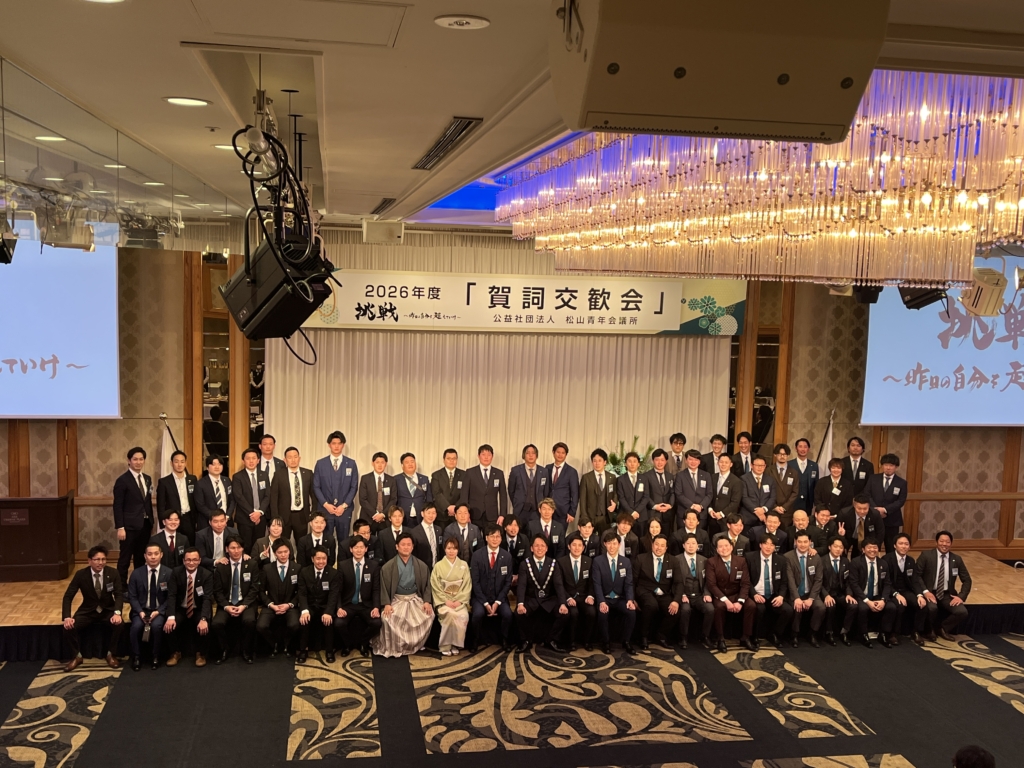 1/20(火)1月例会「賀詞交歓会」がANAクラウンプラザホテル松山にて開催されました。当日は愛媛県知事 中村時広様をはじめ来賓の方々、また県内外から駆けつけていただいた各地会員会議所の皆さま、そして松山青年会議所シニアクラブの皆さまなど多くの方々にご参加していただきました。