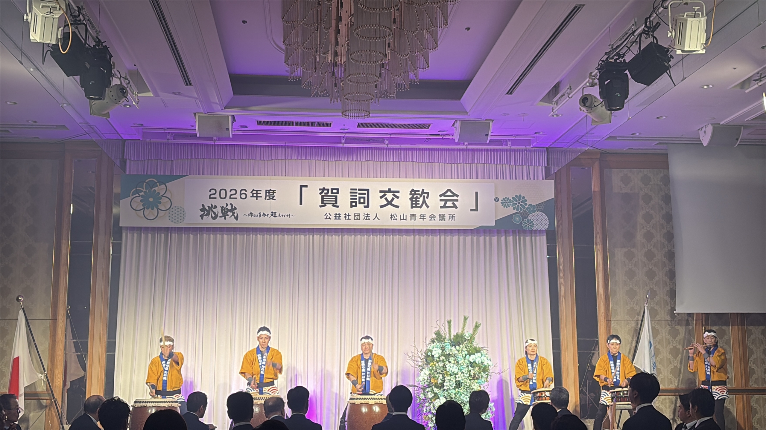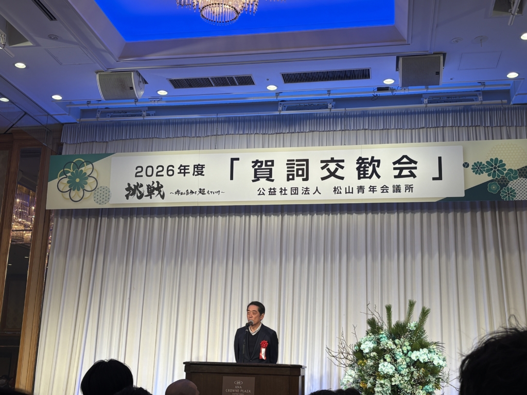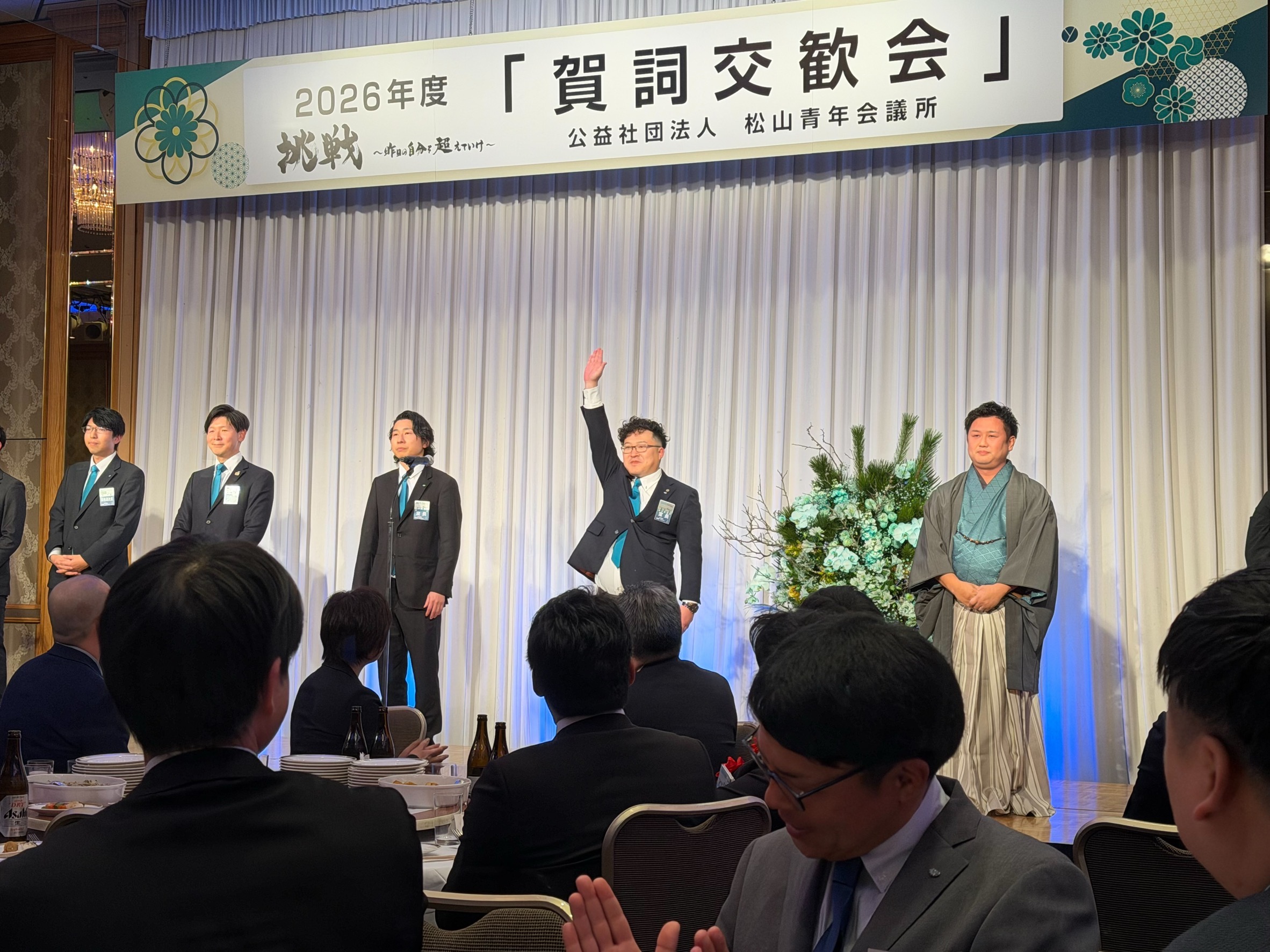 1/20(火)1月例会「賀詞交歓会」がANAクラウンプラザホテル松山にて開催されました。当日は愛媛県知事 中村時広様をはじめ来賓の方々、また県内外から駆けつけていただいた各地会員会議所の皆さま、そして松山青年会議所シニアクラブの皆さまなど多くの方々にご参加していただきました。