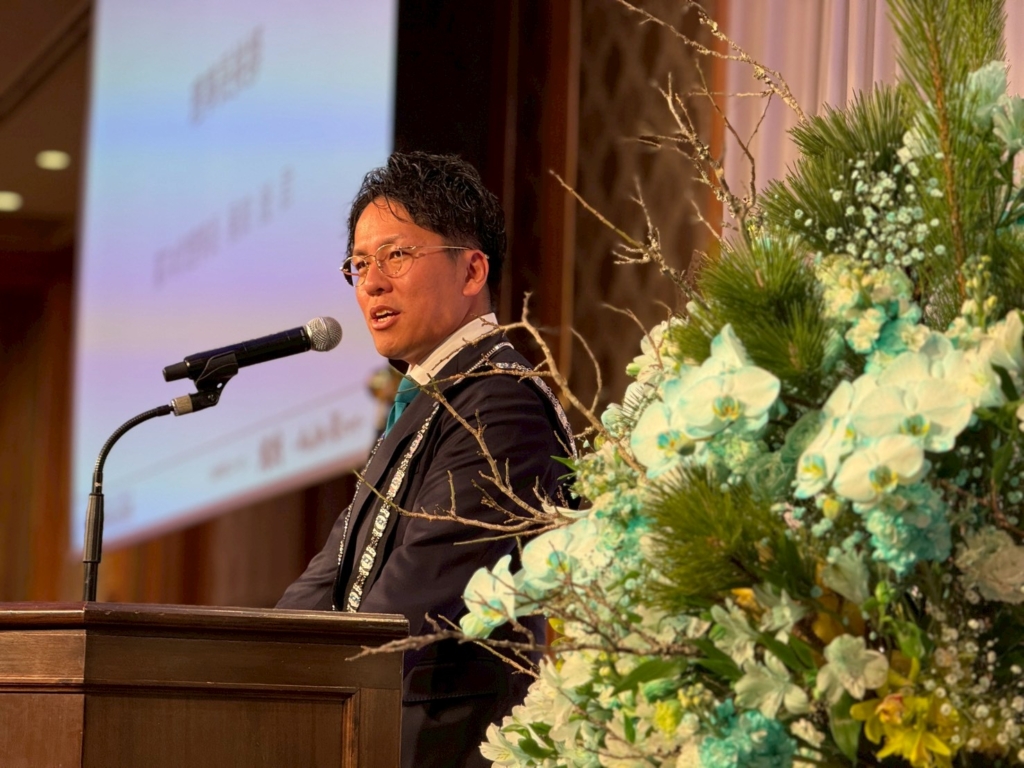 水軍太鼓のオープニングパフォーマンスで賀詞交歓会が始まり、理事長挨拶の後、ご来賓を代表して愛媛県知事 中村時広様からご祝辞をいただきました。その後、松山青年会議所シニアクラブ 前崎会長の乾杯の挨拶をもって歓談が始まりました。