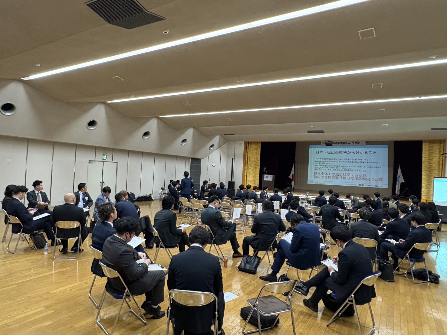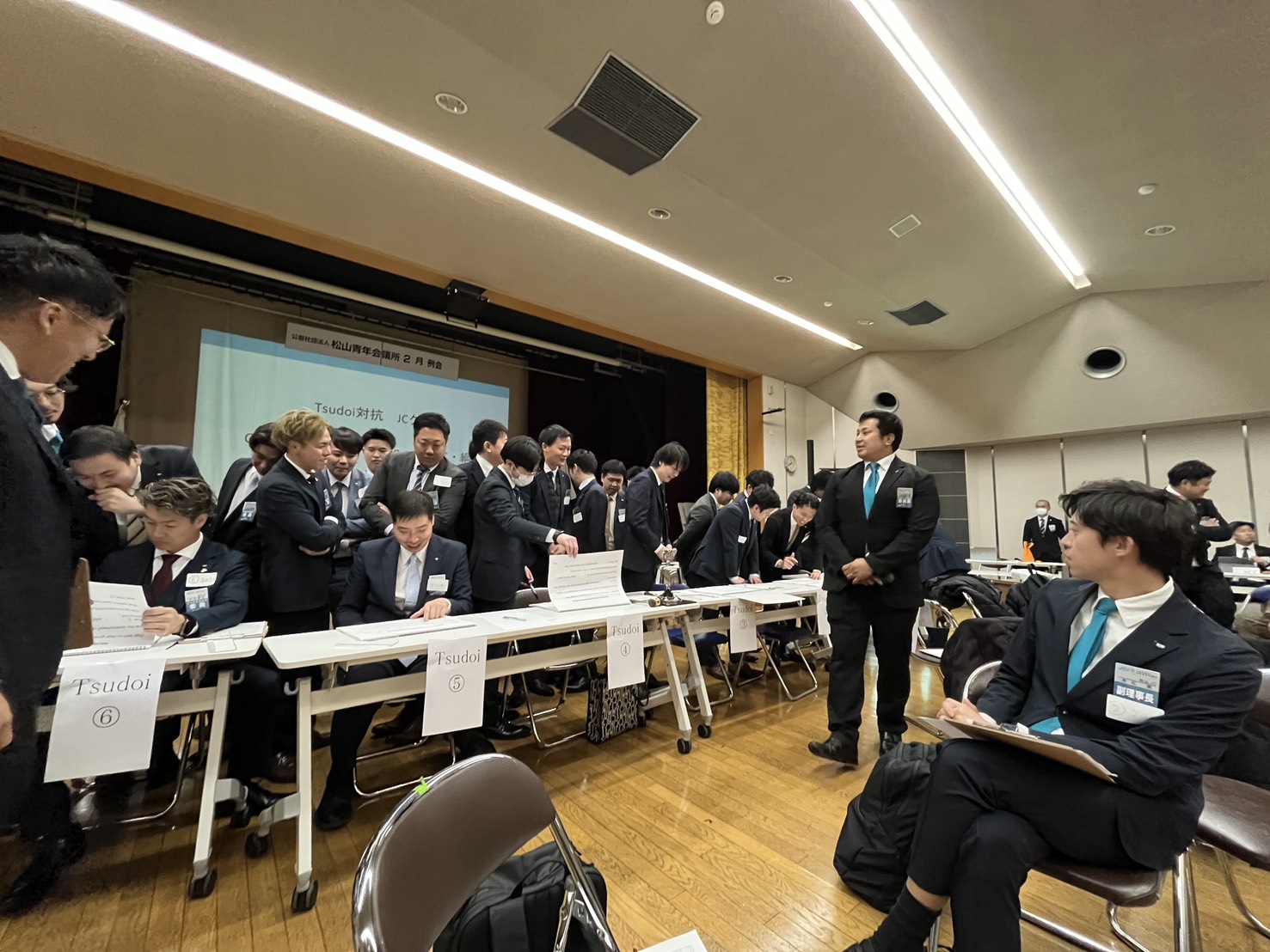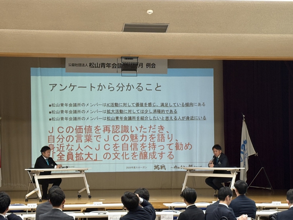 2月17日(火)松山市青少年センターにて2月例会「語ろう、拡げよう、私たちのJC~JCってやっぱり大事だね~」が開催されました。同志拡大委員会による開催でメンバーに対しての拡大活動の推進を掲げました。