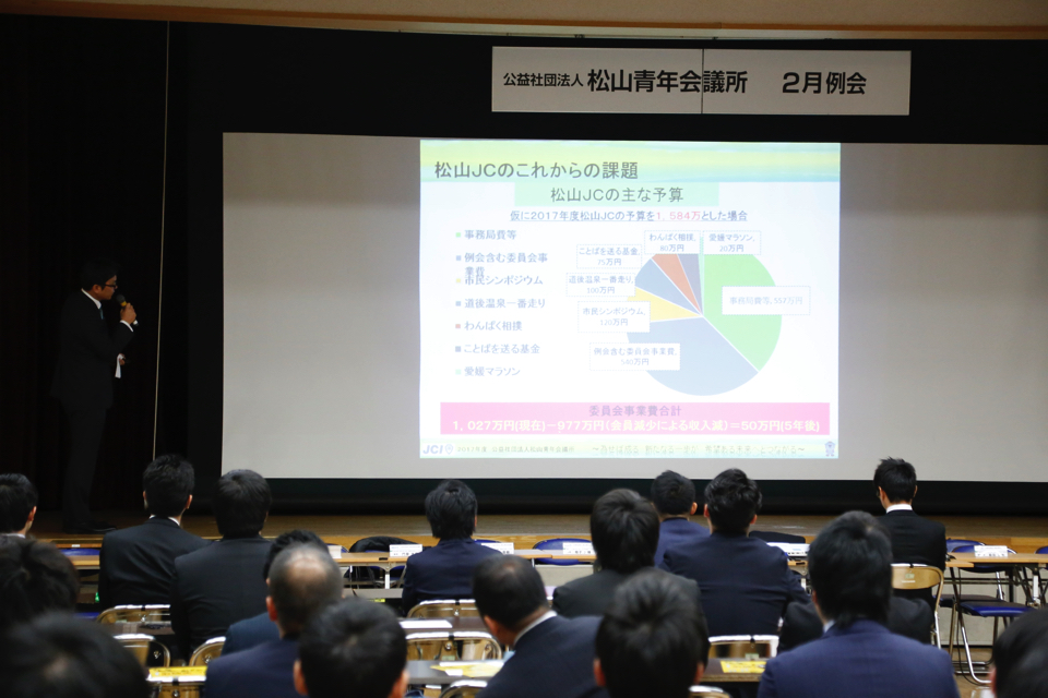 2017年2月21日(火) 2月例会「チャレンジスピリットAGAIN〜松山JCの未来を切り拓くのはオレたちだ!〜」 会員拡大をテーマに開催された2月例会。まず初めに行われた小泉歴代理事長による熱のこもった講演では、JC活動の意義や楽しさなどをお話しいただきました。そしてそのあと行われた「3分間スピーチ」では、「新入会員の入会後のフォロー」について、各委員会のメンバーがユニークな演出も交えて発表しました。 更なる会員拡大に向けて… 「松山JCの未来を切り拓くのはオレたちだ! 」