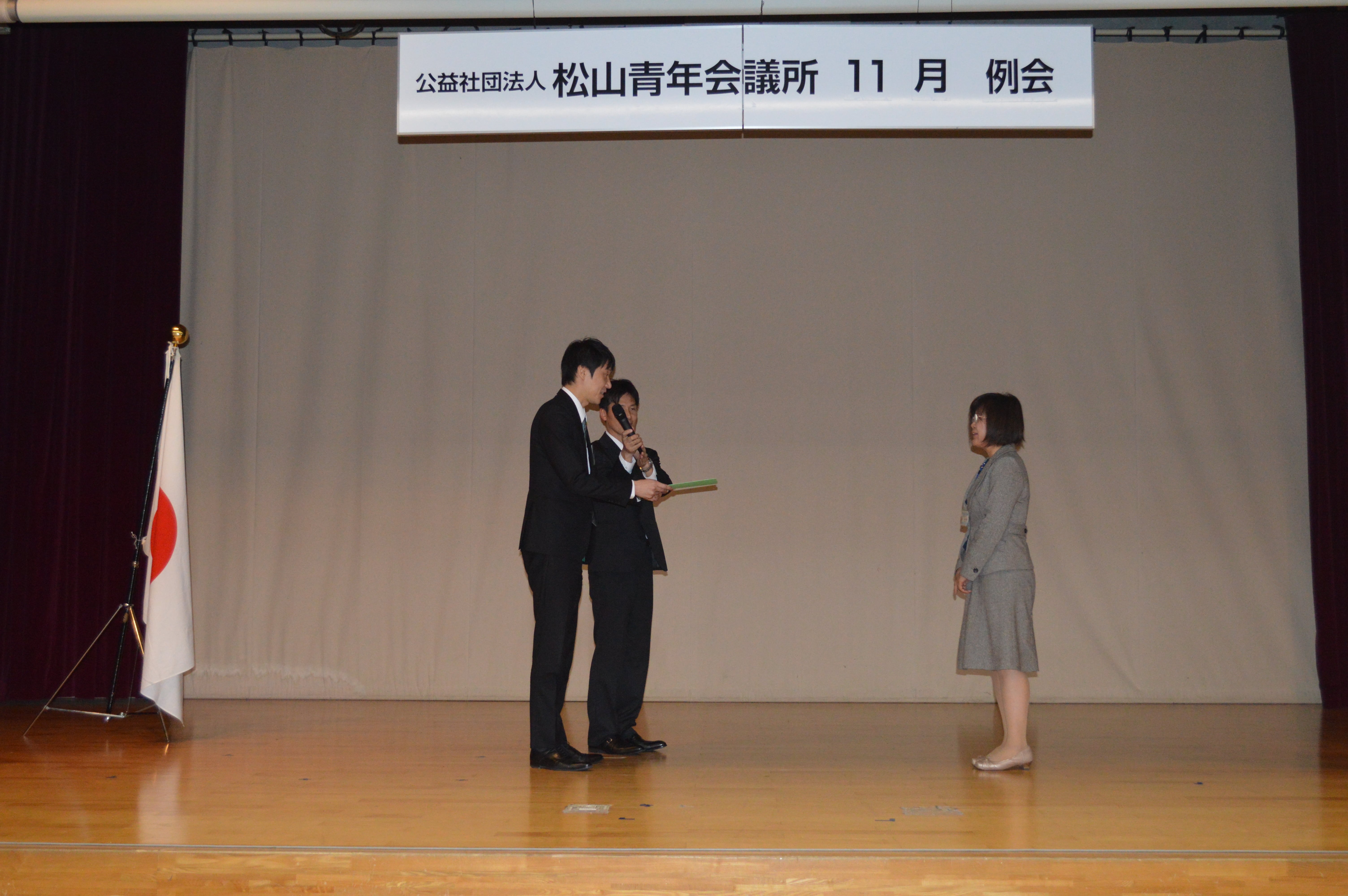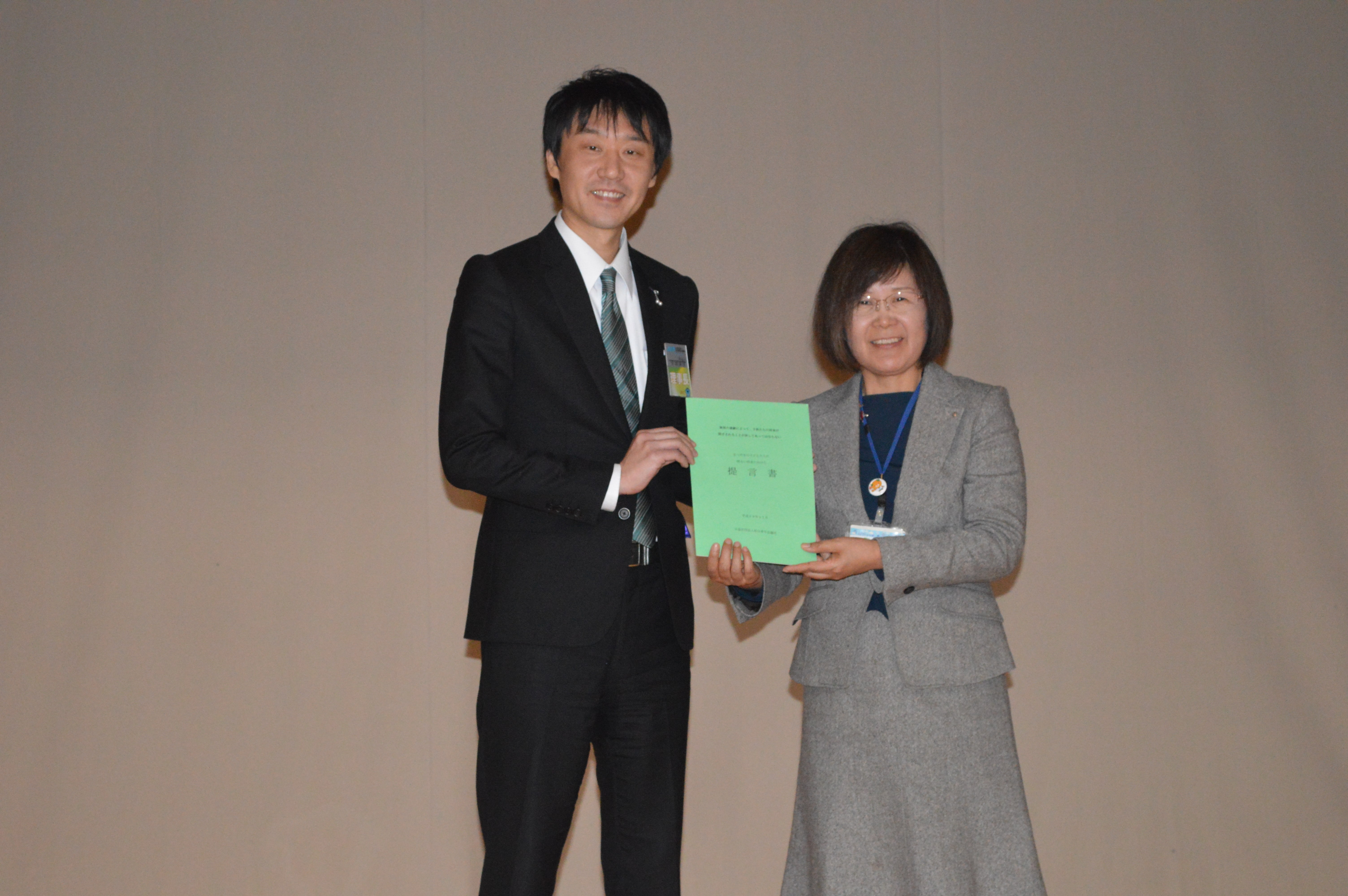2017年11月21日(火) 11月例会「まつやまの子どもたちの明るい将来に向けた提言書」 11月例会では、「まつやまの子どもたちの明るい将来に向けた提言書」の発表が行われました。まつやままちづくり特別会議の皆さまが、「子どもたちの未来に対して、JCとして何ができるのか」、1年間かけてリサーチ、研究した成果を十二分に感じることができました。また、例会には、子どもを取り巻く諸問題について、日々取り組んでいらっしゃる行政や関係諸団体の方もご参加いただきました。我々が地域の子どもたちに出来ることは、人それぞれあると思いますが、地域の大人がスクラムを組んで取り組んでいくことが大事だと感じました。