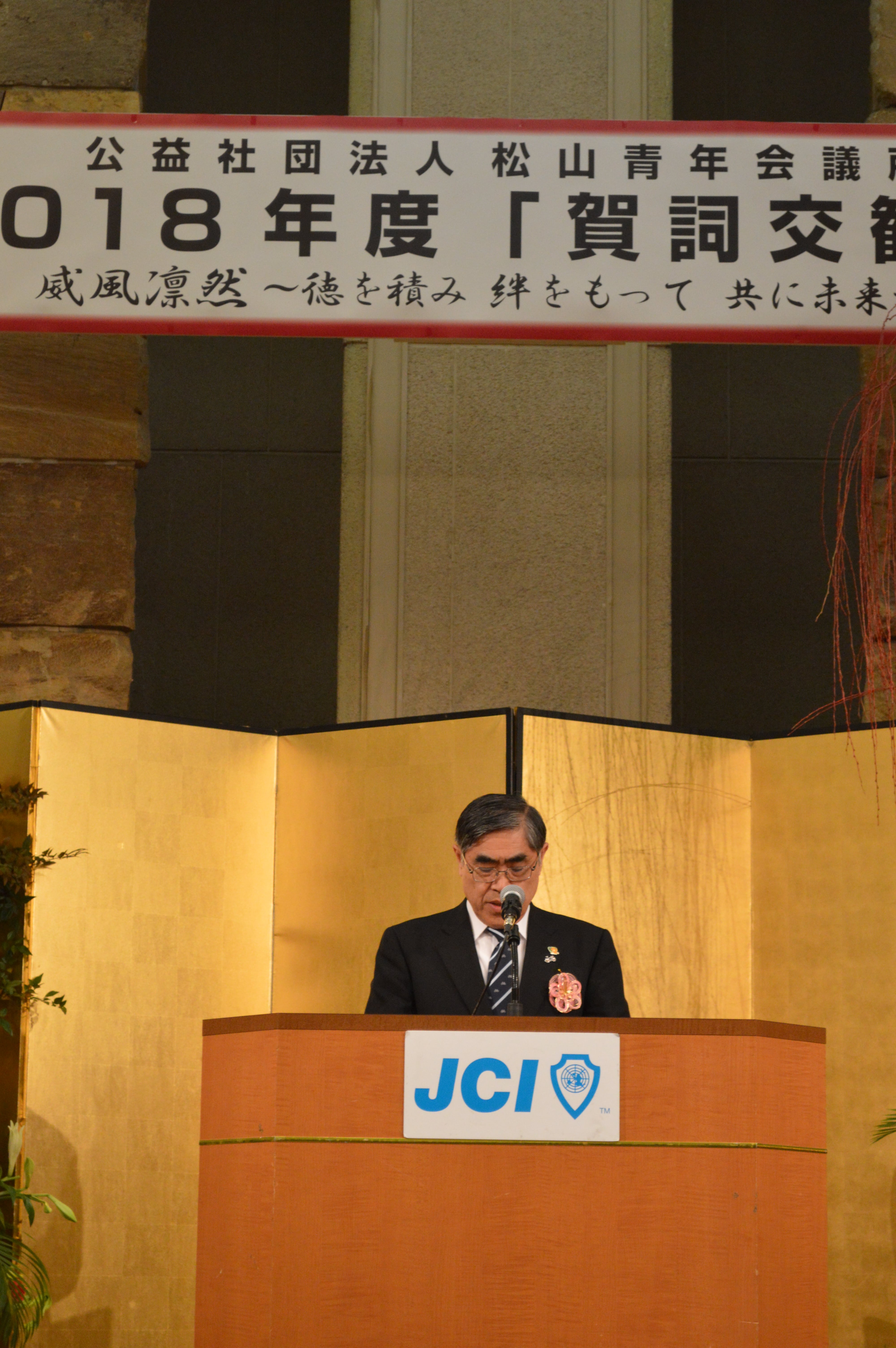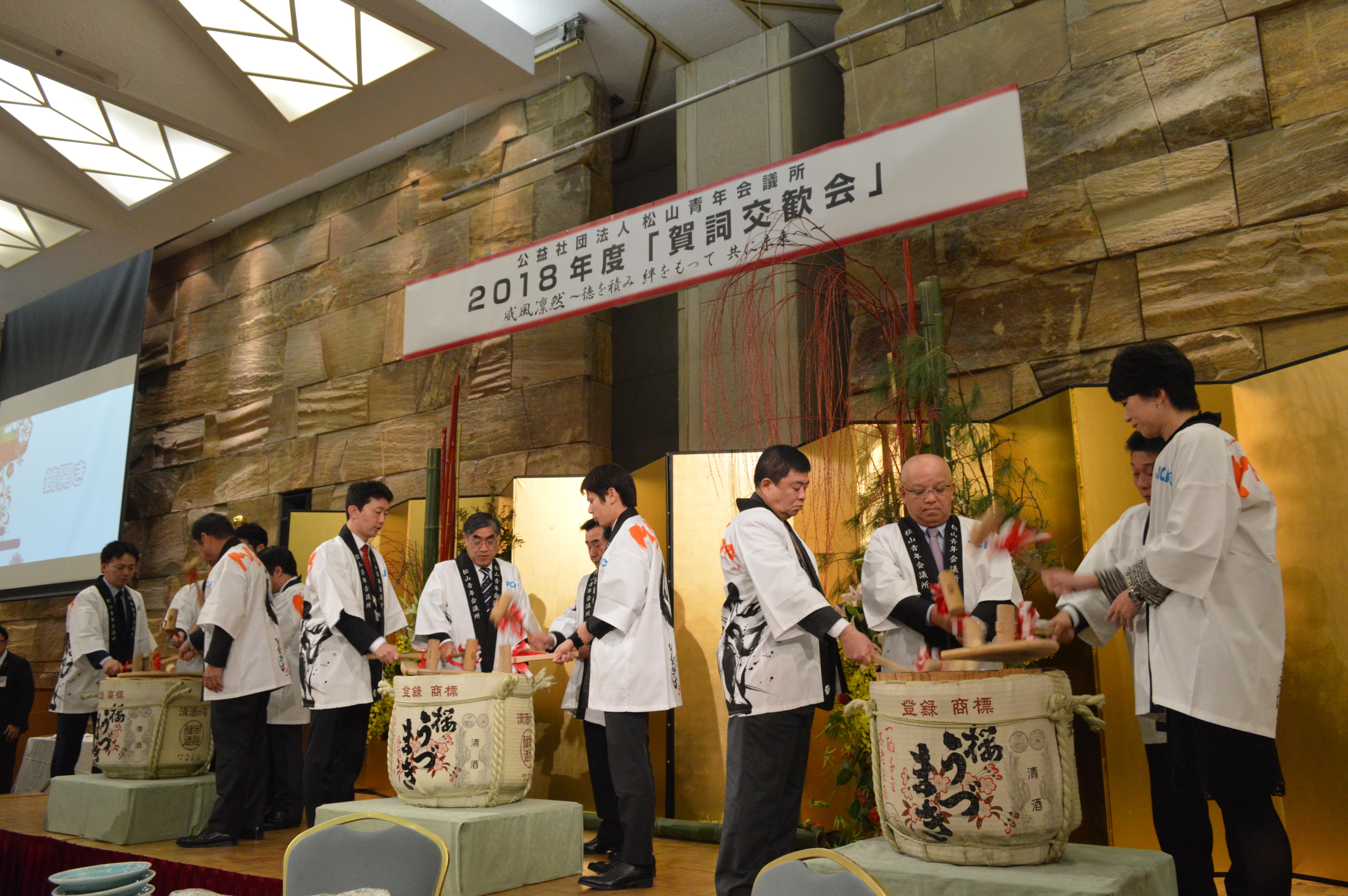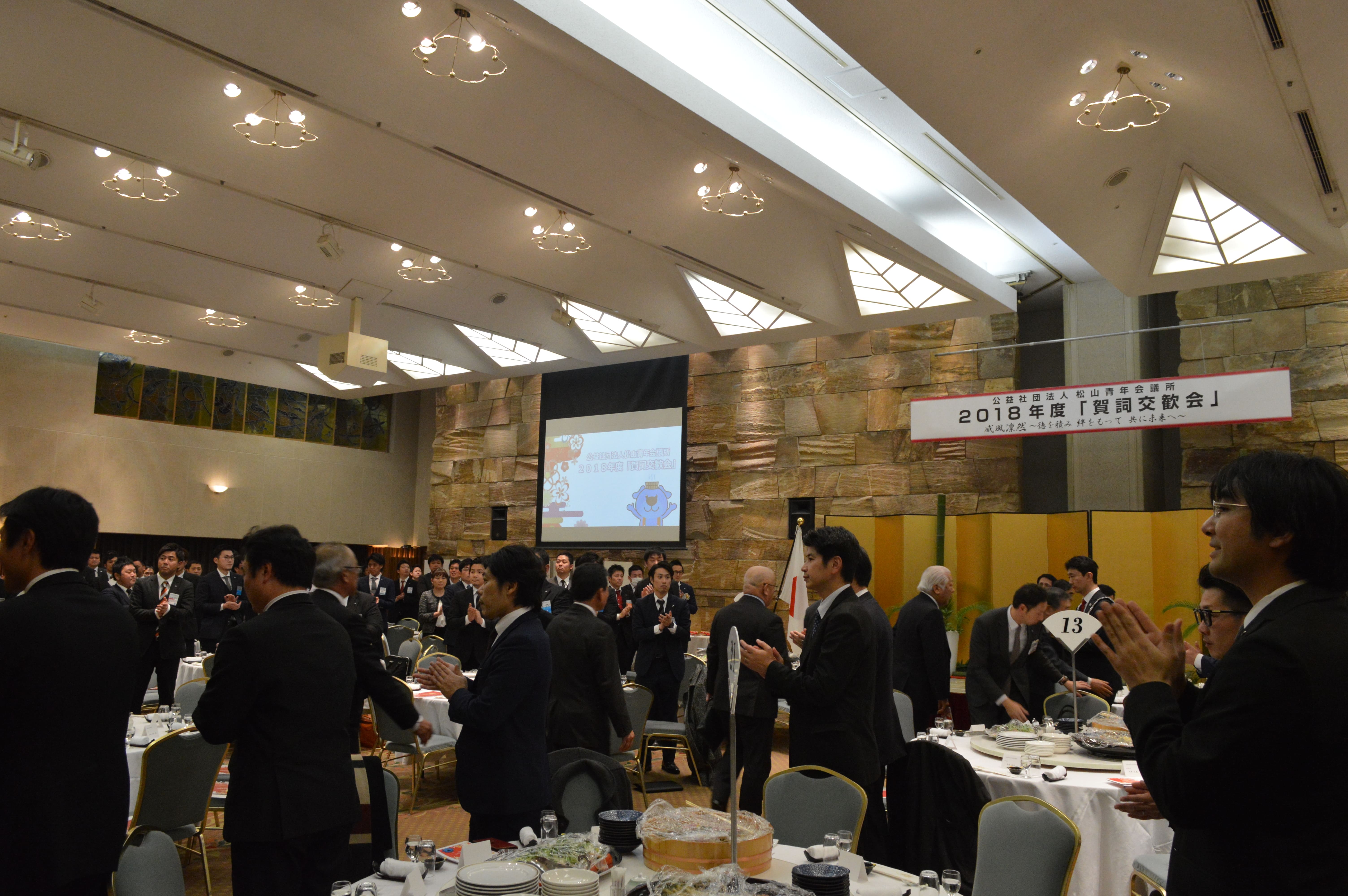 2018年度松山青年会議所の賀詞交歓会は、松山青年会議所シニアクラブ先輩諸兄をはじめ、遠くは青森八戸市、四国の各地域の青年会議所理事長・メンバー、関係諸団体の方々にもお越しいただき、盛大に開催されました。