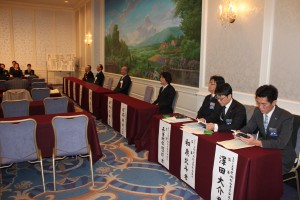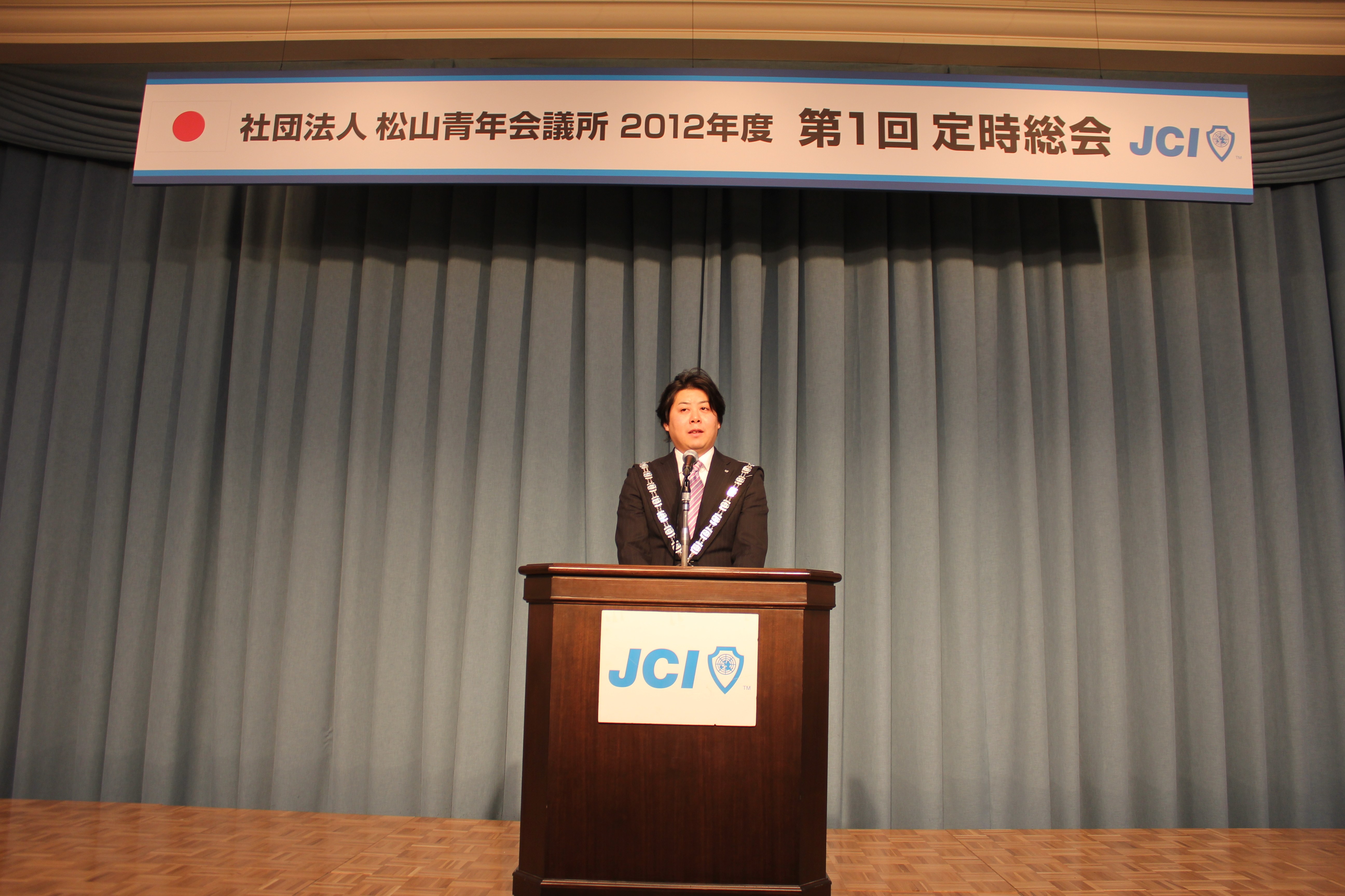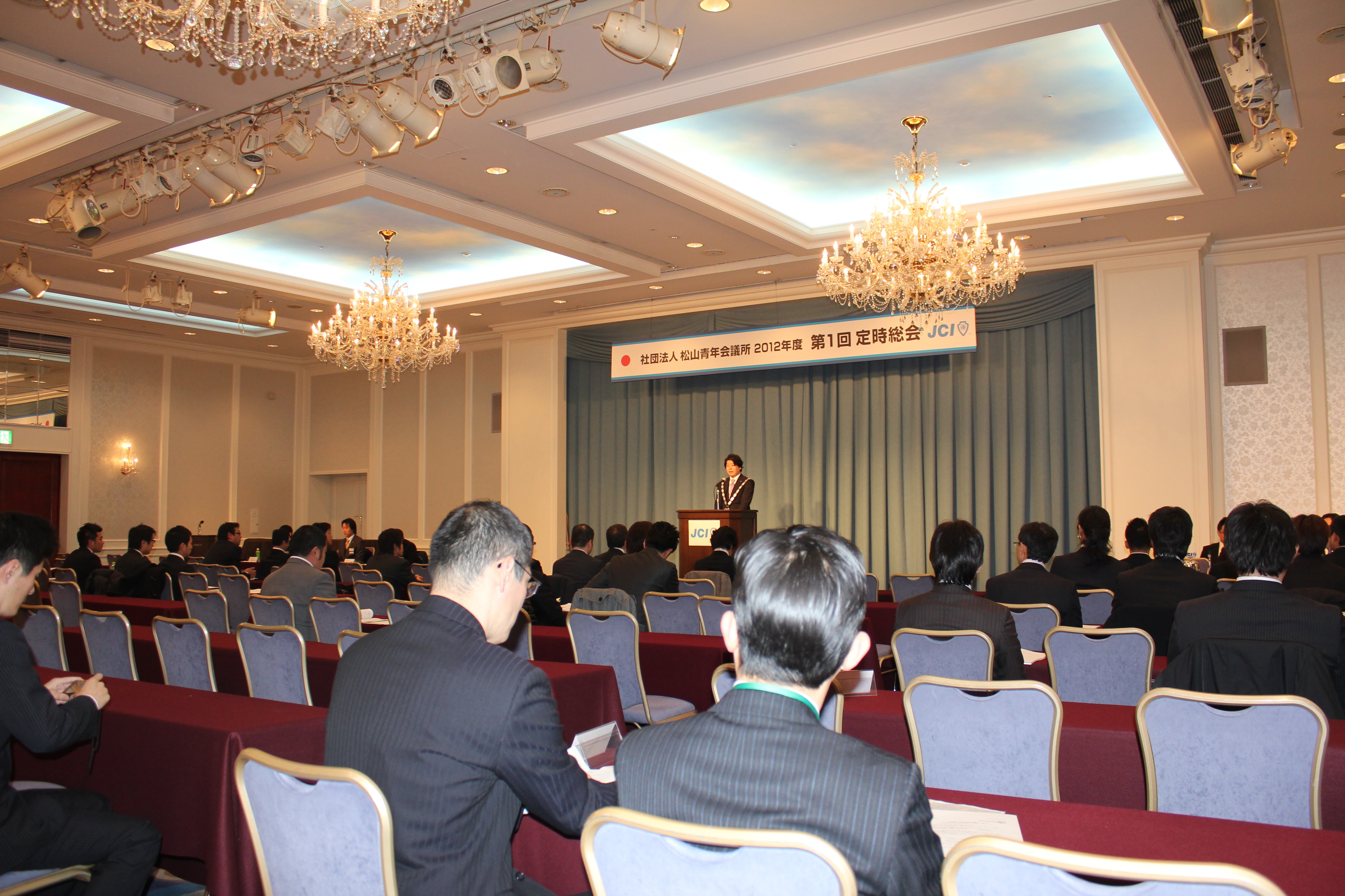 2012年1月17日(火)17時より松山全日空ホテル南館2階サファイアルームにて社団法人松山青年会議所の2012年度第1回定時総会にが開催されました。帽子理事長の挨拶のあと来賓の方々より祝辞を頂戴しました。その後定款により帽子理事長が議長に指名され定足数の確認後、議事録作成者及び署名者の指名と議案の採択が行われました。議案は3議案あり、2011年度の事業報告承認に関する件と2011年度の決算承認に関する件と2012年度の修正予算承認に関する件でした。非常にスムーズな審議で3議案全てが可決され予定より早い閉会となりました。当日早くから準備をされた総務渉外委員会のメンバーと総会に参加された皆様お疲れ様でございました。