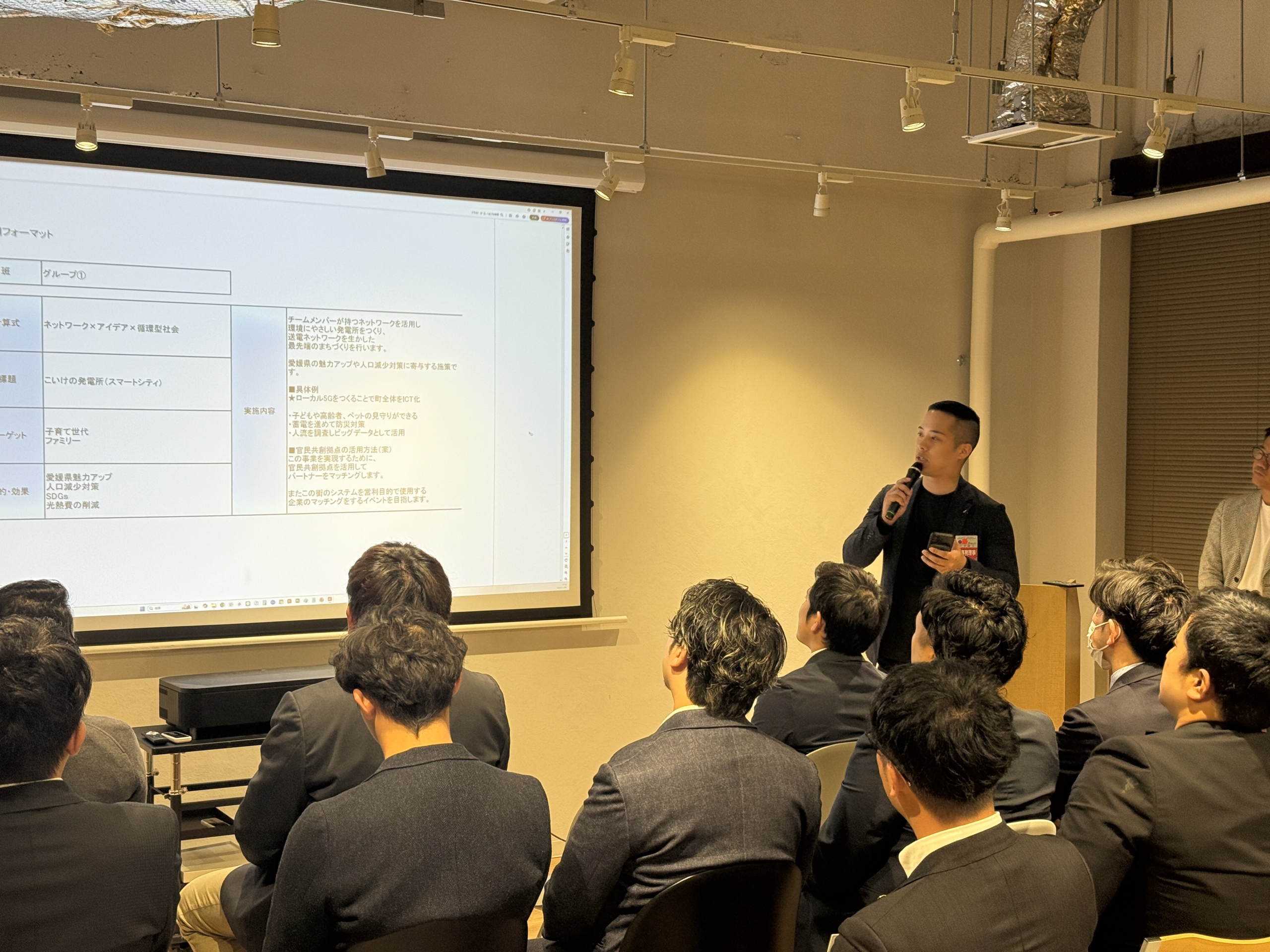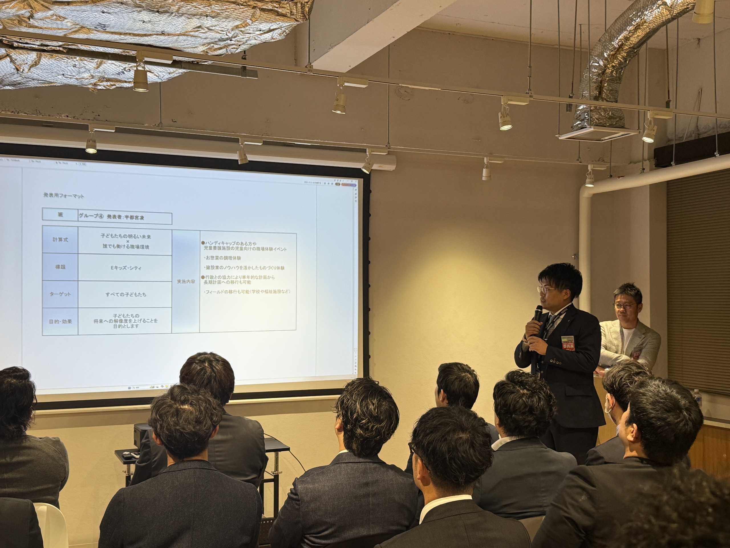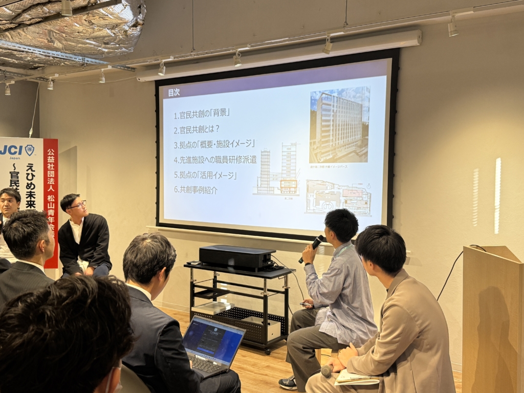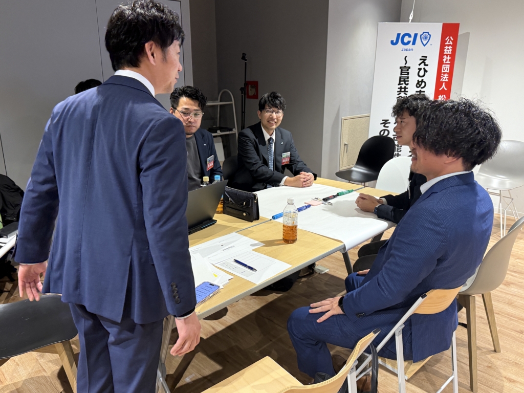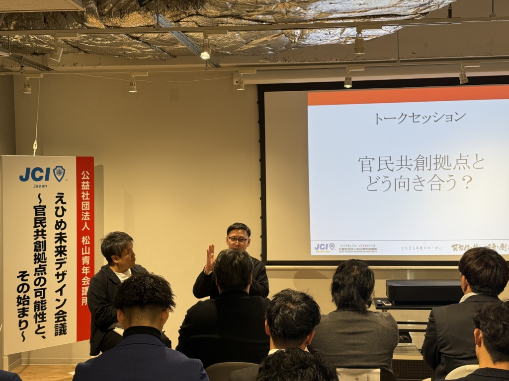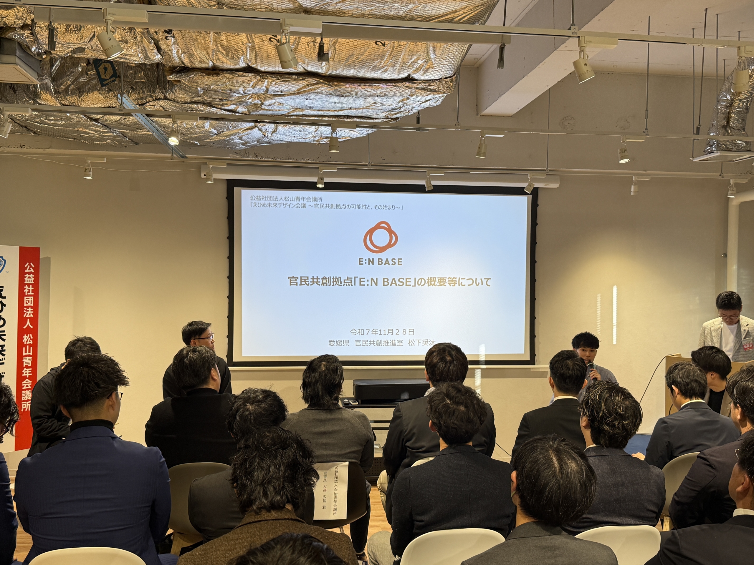 2025年11月28日(金) えひめ未来デザイン会議~官民共創拠点の可能性と、その始まり~ 11月28日、愛媛県庁トライアングルベースにて、松山青年会議所と愛媛県が共催する「えひめ未来デザイン会議」が開催されました。 本事業は、2026年に開設予定の「官民共創拠点 E:N BASE」を理解するとともに、行政とJCメンバーが共に地域課題の解決や拠点の活用方法について議論を深めました。 第一部では、民間・行政それぞれの立場から講師3名によるトークセッションが行われ、第二部では6グループに分かれたディスカッションを実施。各企業の強みを掛け合わせた事業の可能性を発表しました。 参加者の多様な視点を反映した提言内容は、今後の拠点運営への貴重な示唆となることが期待されます。