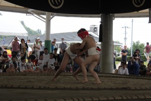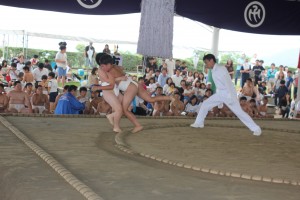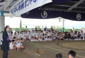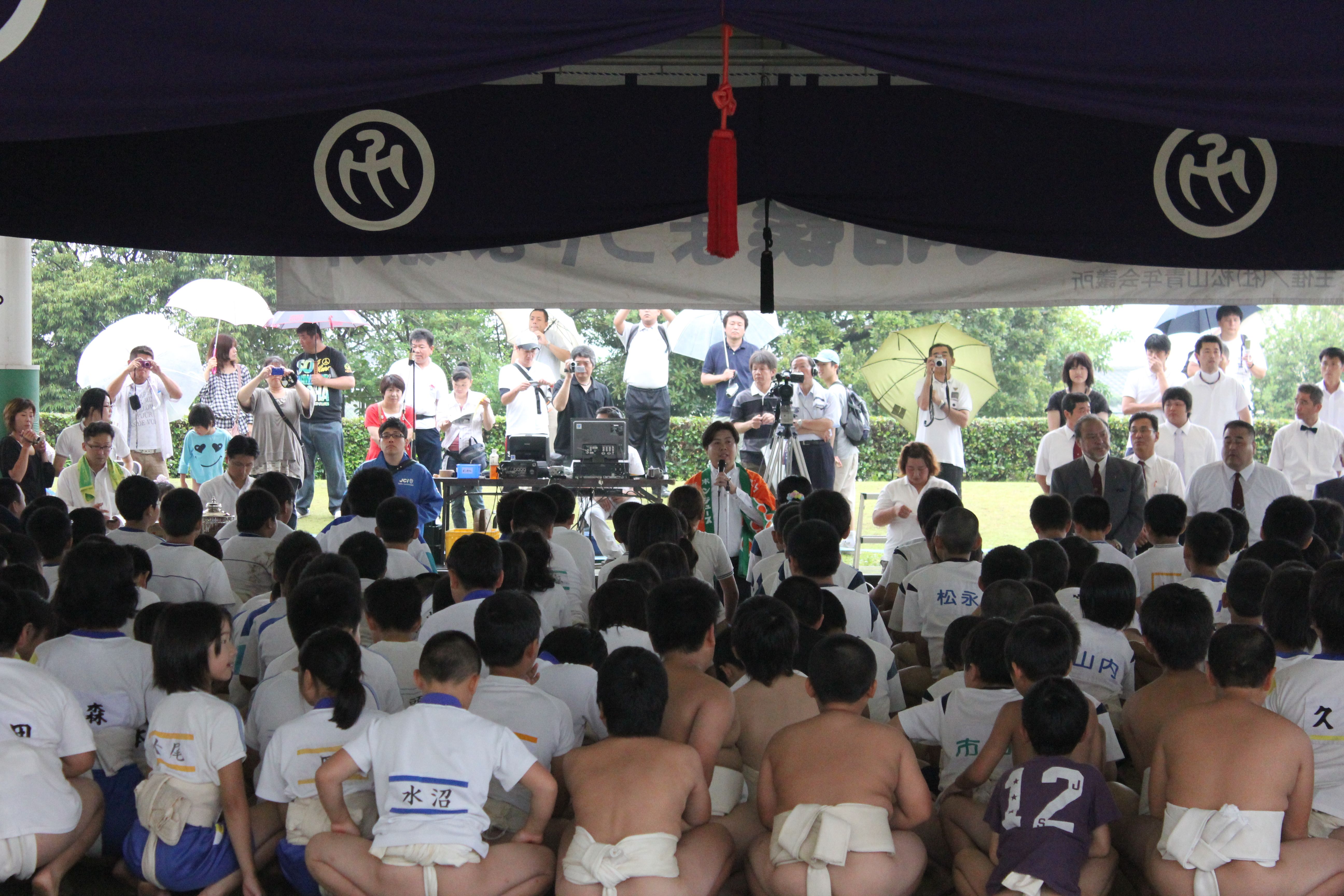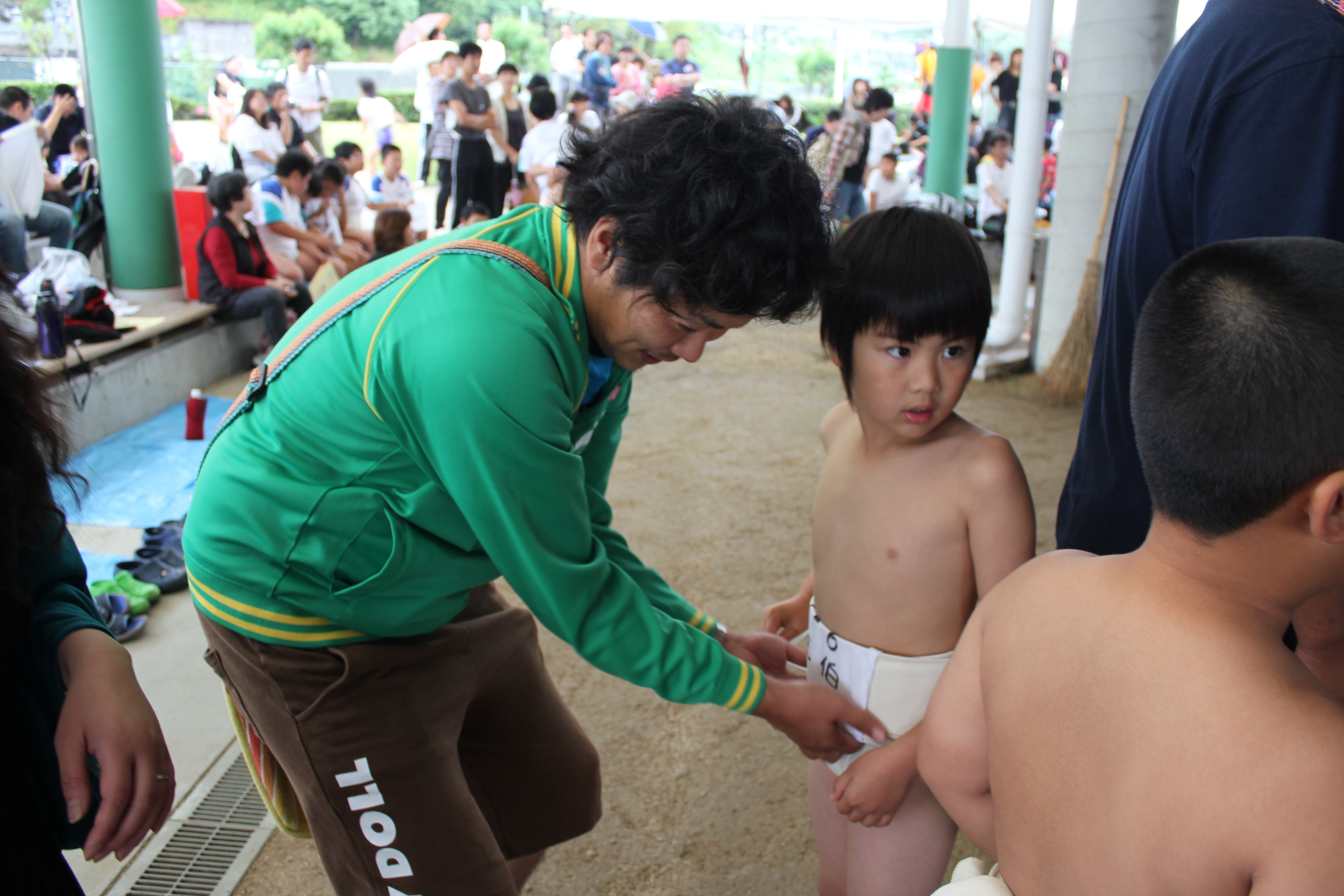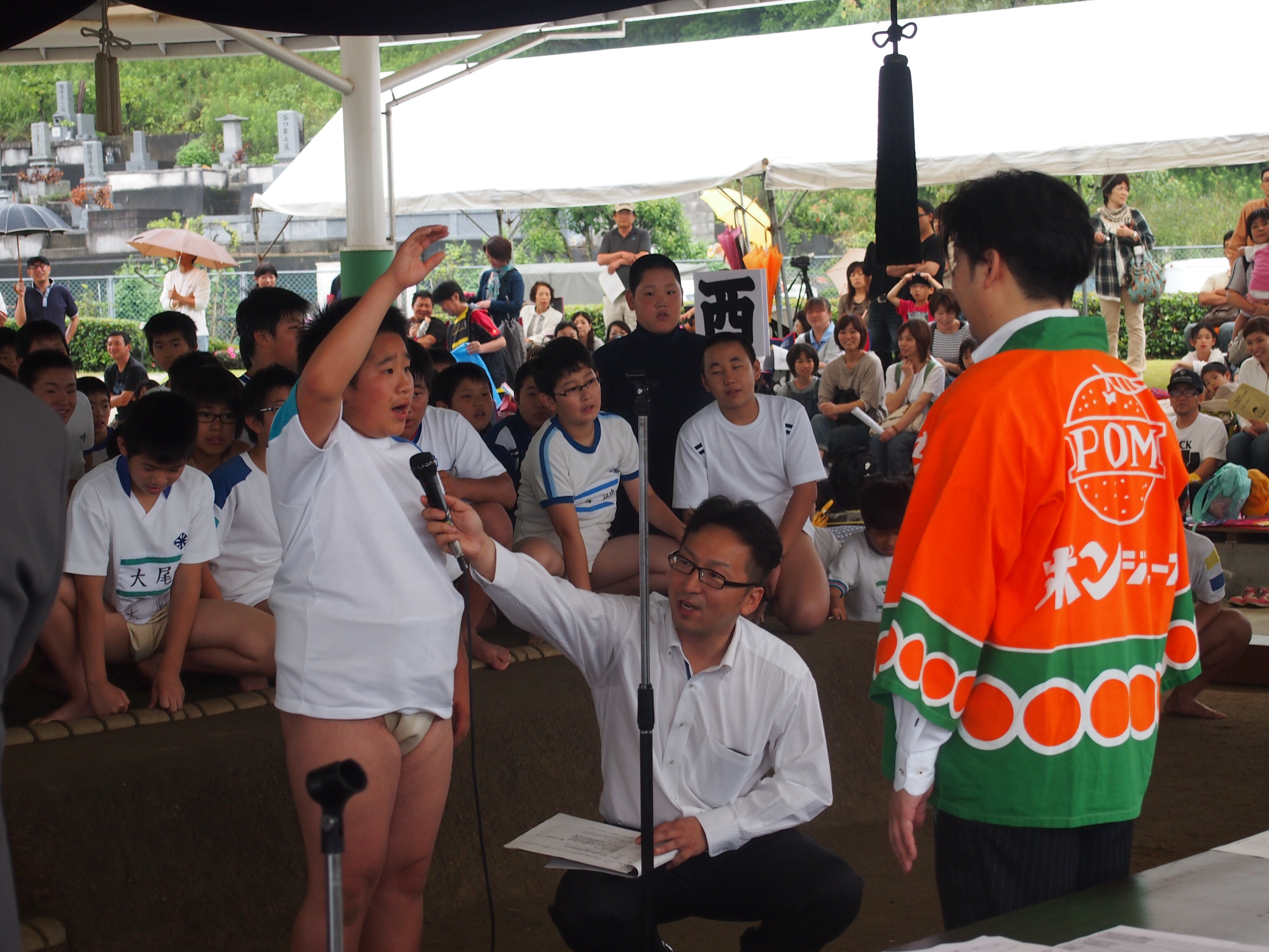 これは6月17日(日)愛媛県総合運動公園相撲場にて開催された『わんぱく相撲まつやま場所』のワンシーンです。わんぱく相撲まつやま場所は7月29日に両国国技館で開催されるわんぱく相撲全国大会の地区予選です。わんぱく相撲全国大会2012年の大会テーマは『「勇気がくれる明日への力」~みんなの元気を日本中に広げよう!~』です。今年、過去最高となる約250人の小学生が参加し熱戦を繰り広げました。開会式終了後に礼法講習を約40分間行い、その中で、互いの体をぶつけることで「痛み」を知り、健闘を称え合うことで「感謝」を感じ、そして「礼儀」を重んじることの重要性を授業しました。相手がいるから試合ができるのだから相手に対し感謝をしようと指導していました。今年度の新たな取り組みとして横綱制度を導入し6年生の優勝者を横綱とし優勝カップを用意しました。また礼法講習の際に食育として郷土料理について学ぶ時間を設け、これまでのちゃんこ鍋と共に地産地消の郷土料理として鯛めしを振る舞いました。これには地域を愛することのできる大人に育って欲しいとの願いがありました。相撲は武道でありぶつかれば痛いし怪我をすることもあります。負けた悔しさで涙がこぼれてしまう子供もいました。それでも勇気を出して試合に参加してくれた子供たちの勇気が必ずや松山の明日への力となることでしょう。
