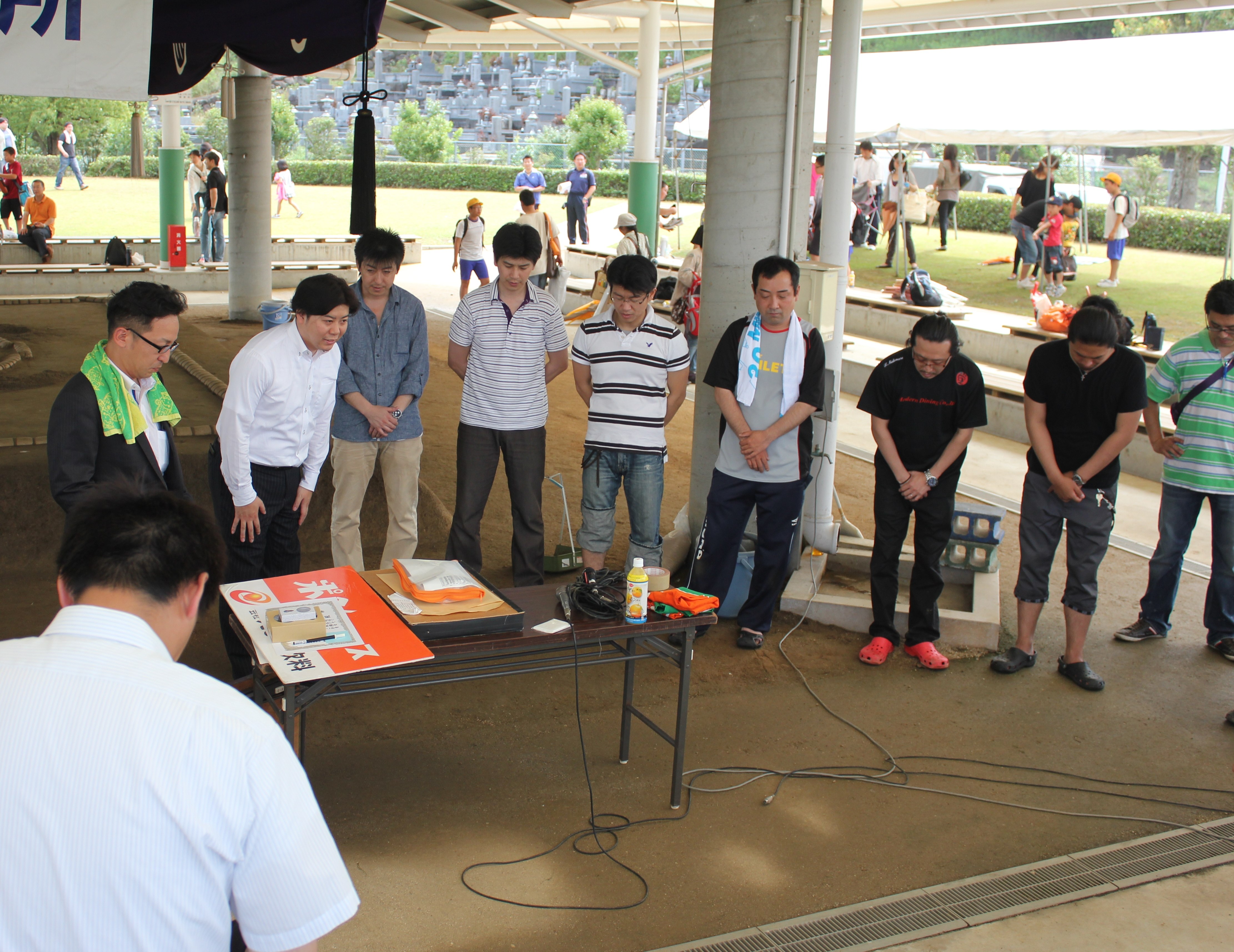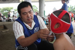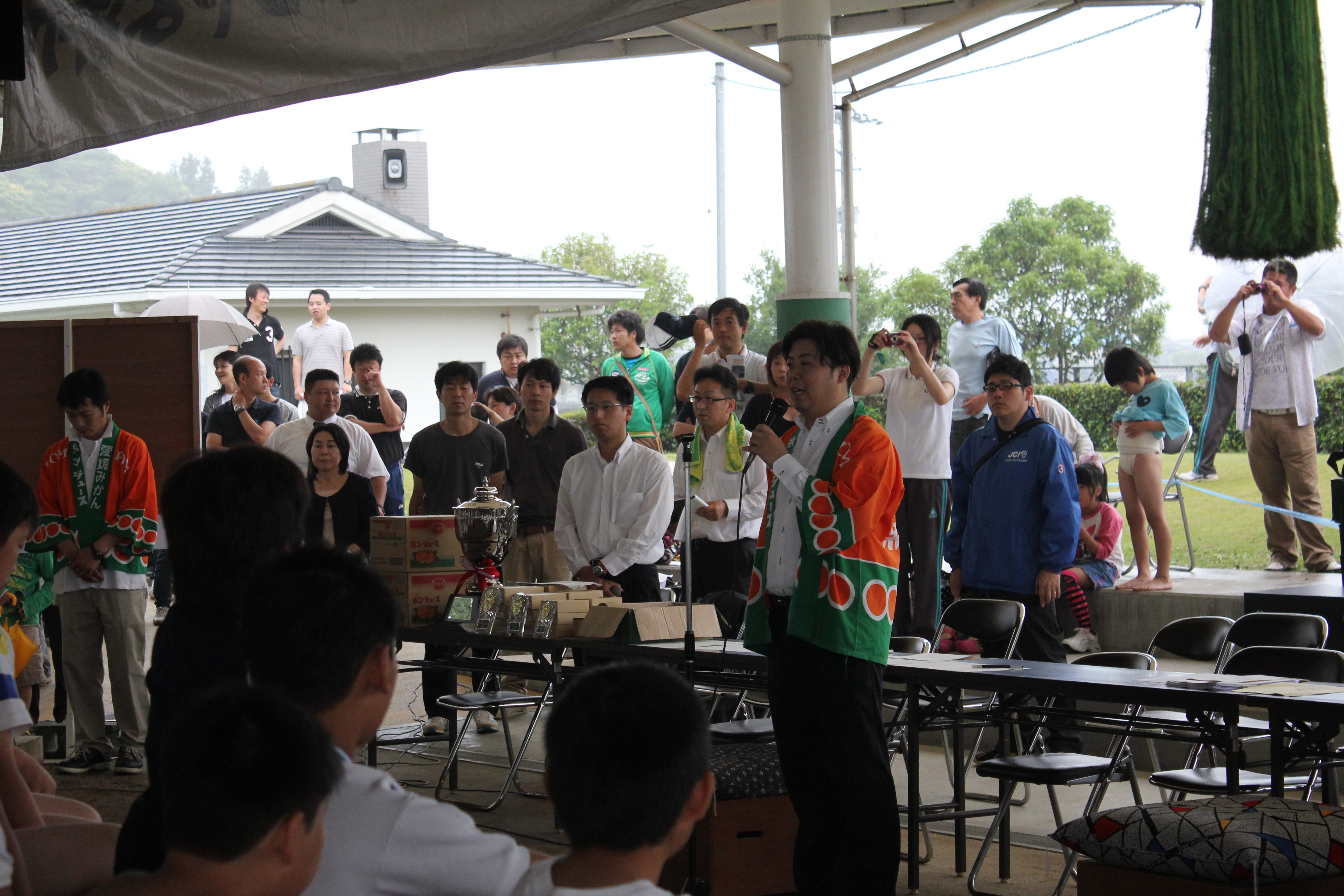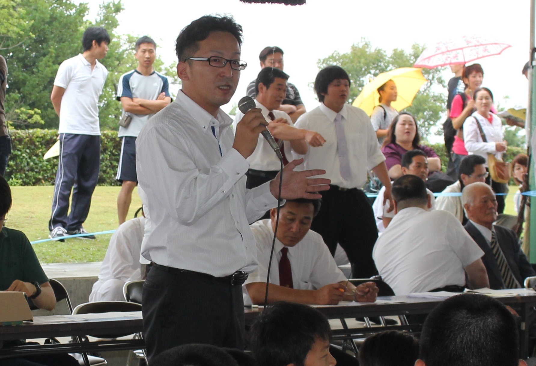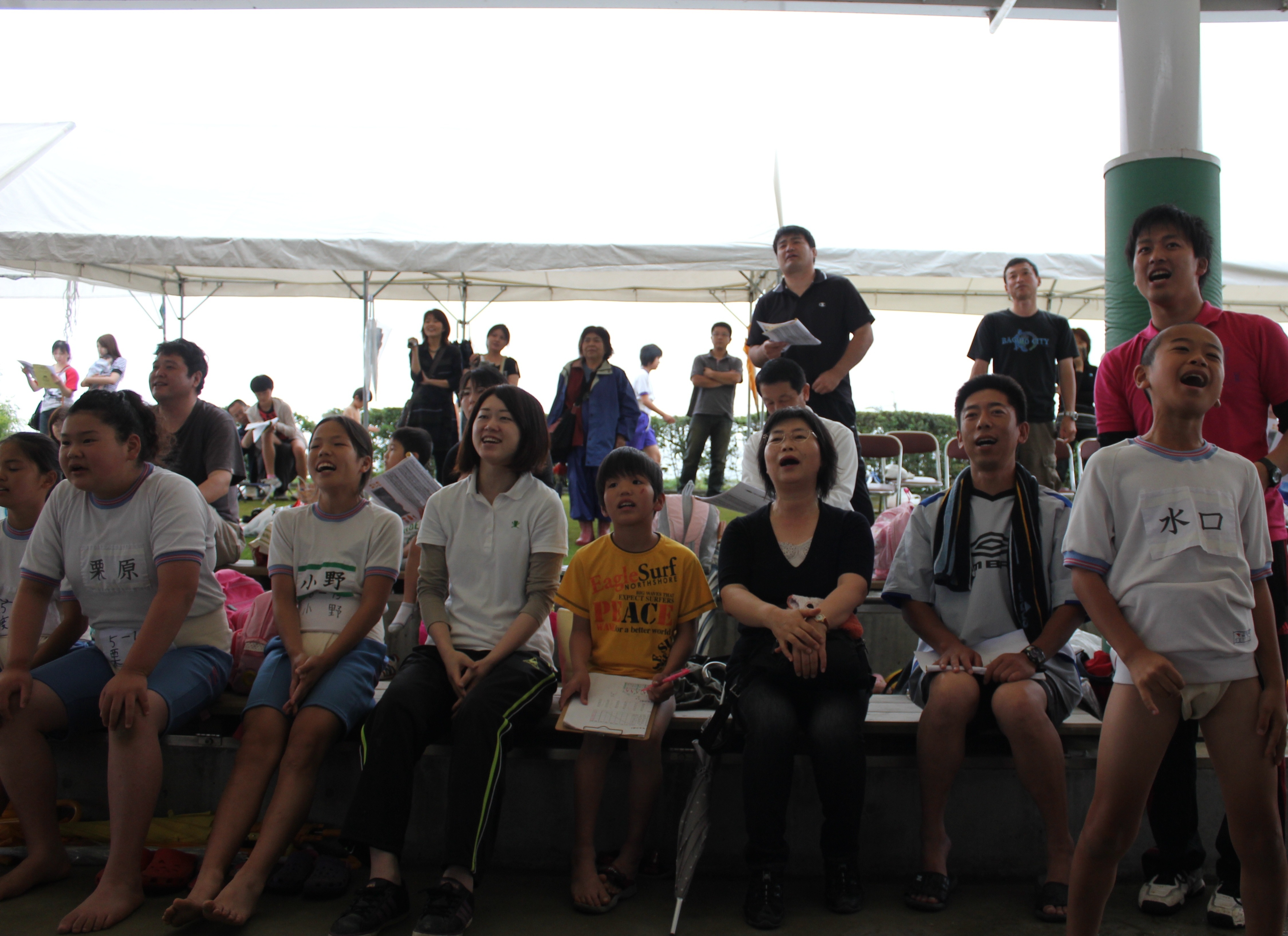 これは6月17日(日)愛媛県総合運動公園相撲場にて開催された『わんぱく相撲まつやま場所』のワンシーンです。わんぱく相撲まつやま場所は7月29日に両国国技館で開催されるわんぱく相撲全国大会の地区予選です。わんぱく相撲全国大会2012年の大会テーマは『「勇気がくれる明日への力」~みんなの元気を日本中に広げよう!~』です。今年、過去最高となる約250人の小学生が参加し熱戦を繰り広げました。開会式終了後に礼法講習を約40分間行い、その中で、互いの体をぶつけることで「痛み」を知り、健闘を称え合うことで「感謝」を感じ、そして「礼儀」を重んじることの重要性を授業しました。相手がいるから試合ができるのだから相手に対し感謝をしようと指導していました。今年度の新たな取り組みとして横綱制度を導入し6年生の優勝者を横綱とし優勝カップを用意しました。また礼法講習の際に食育として郷土料理について学ぶ時間を設け、これまでのちゃんこ鍋と共に地産地消の郷土料理として鯛めしを振る舞いました。これには地域を愛することのできる大人に育って欲しいとの願いがありました。相撲は武道でありぶつかれば痛いし怪我をすることもあります。負けた悔しさで涙がこぼれてしまう子供もいました。それでも勇気を出して試合に参加してくれた子供たちの勇気が必ずや松山の明日への力となることでしょう。