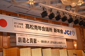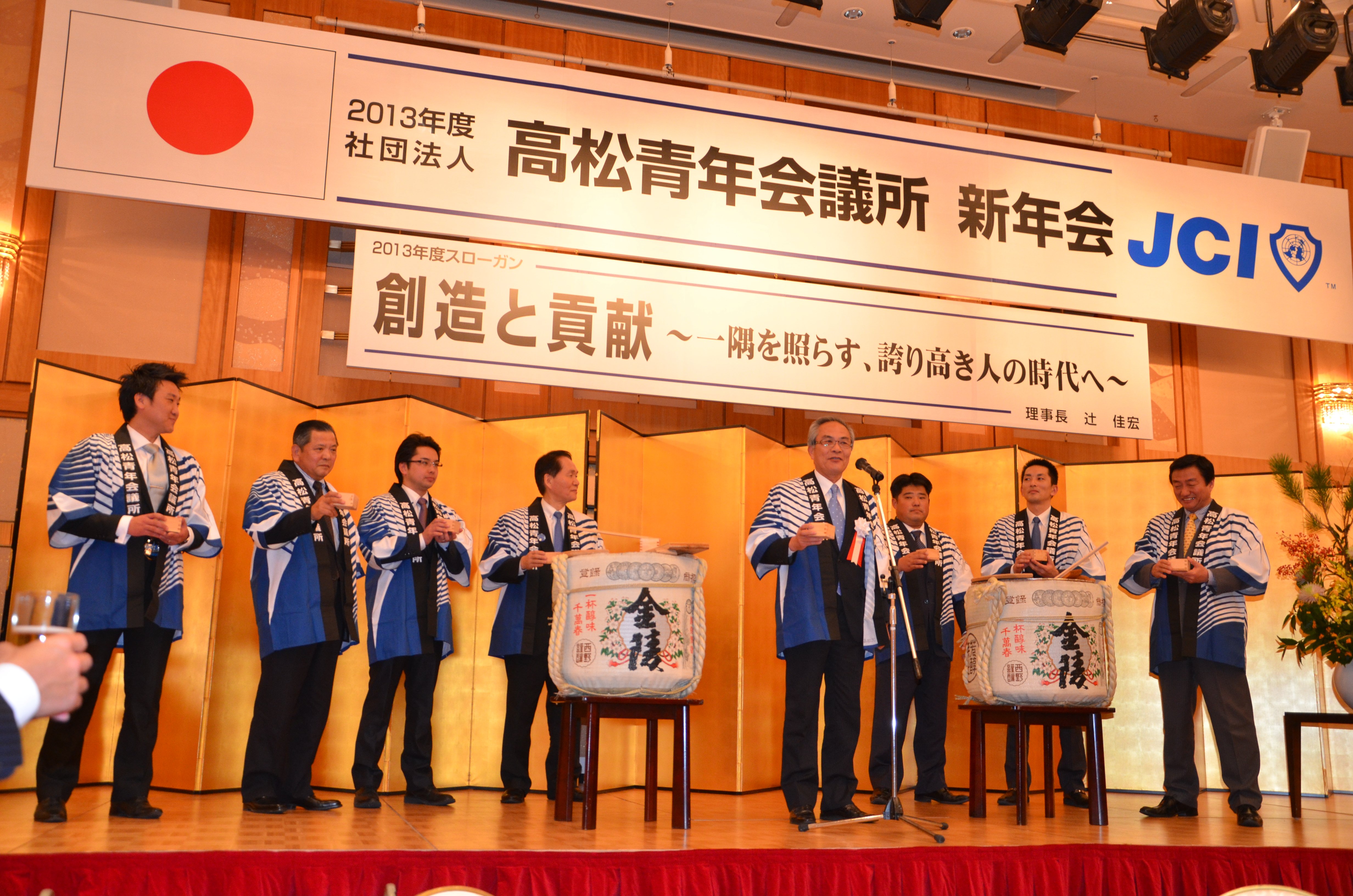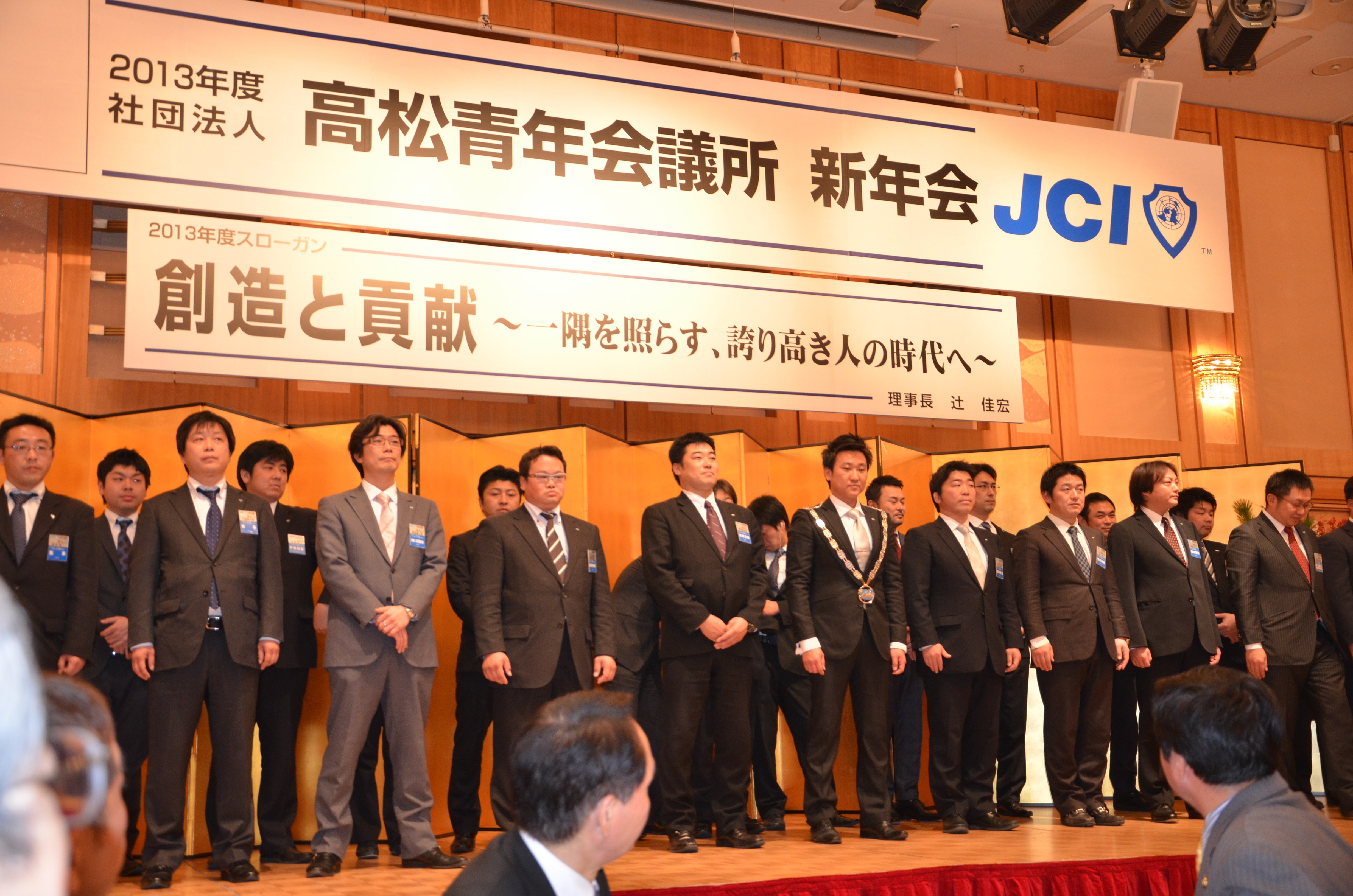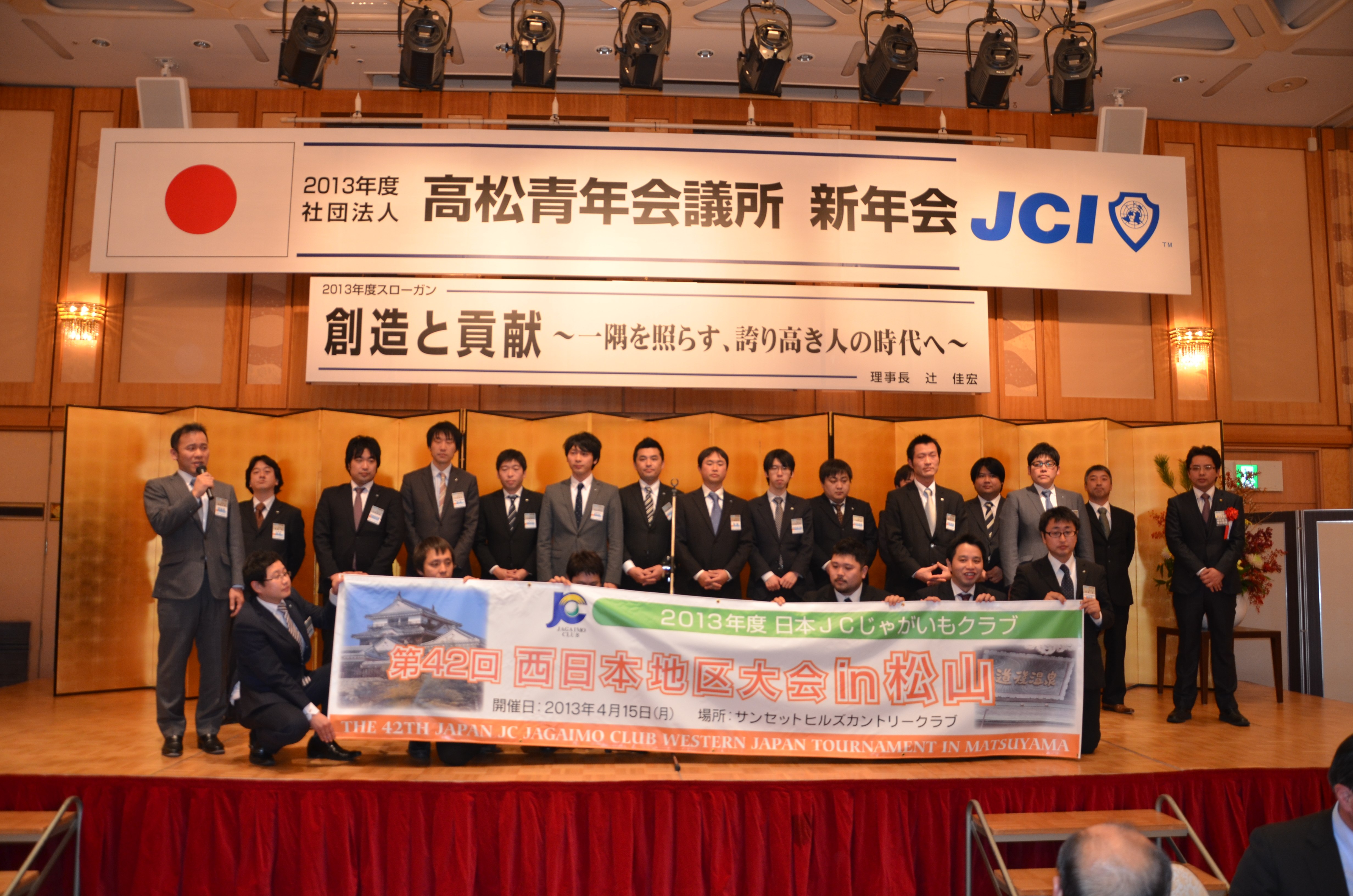 2013年1月24日(木) 社団法人高松青年会議所2013年度新年会 参加報告 2013年1月12日(土)18時より高松国際ホテルにて社団法人高松青年会議所2013年度新年会に20名の松山メンバーが参加いたしました。会場では高松JCの皆様からの素晴らしい歓迎をいただき心温まるひとときを感じることができました。歓談の途中で増田理事長を先頭に松山JCの参加メンバーが登壇する機会をいただき、じゃがいもクラブ西日本地区大会IN松山のPRをさせていただきました。その後の歓談でも他LOMとのコミュニケーションを図ることができ有意義な新年会となりました。
