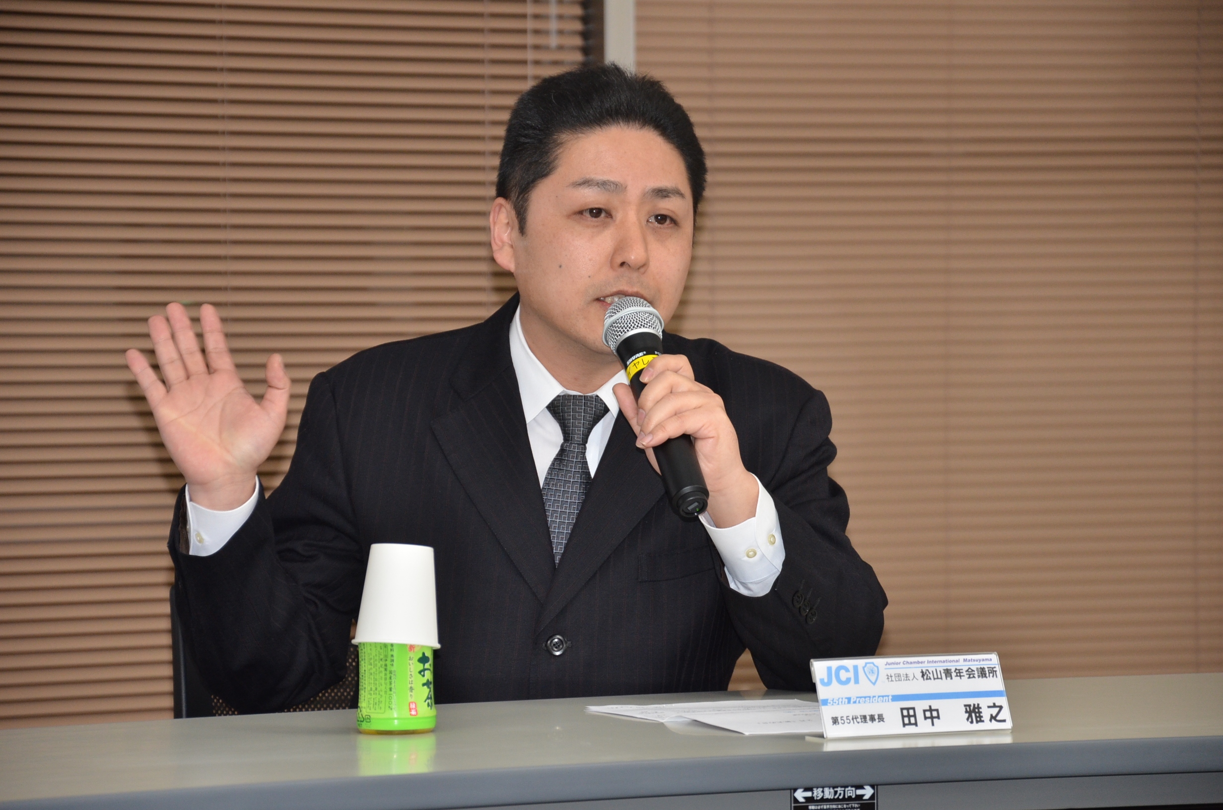 2月19日(火) 久保豊二番町ビル3Fにて2月「拡大の日」が開催されました。今回は6名の入会候補者を招待し、松山青年会議所第55代理事長である田中雅之先輩を講師にお迎えしました。そして「JCとは、どういう団体であるか」また、現役メンバーに向けて「なぜ会員拡大が必要なのか」という事を教えていただきました。懇親会では、現役メンバーと入会候補者の実りある「ふれあい」の時間を共有する事ができ、松山青年会議所の新しい仲間として活動に加わる事を更に真剣に考えていただくきっかけになりました。松山青年会議所の現在の会員数は110名。2014年には全国大会の主管LOMとしての大きな機会が与えられています。この素晴らしい時期、志高き松山青年会議所に多くの方の入会をお勧めいたします。