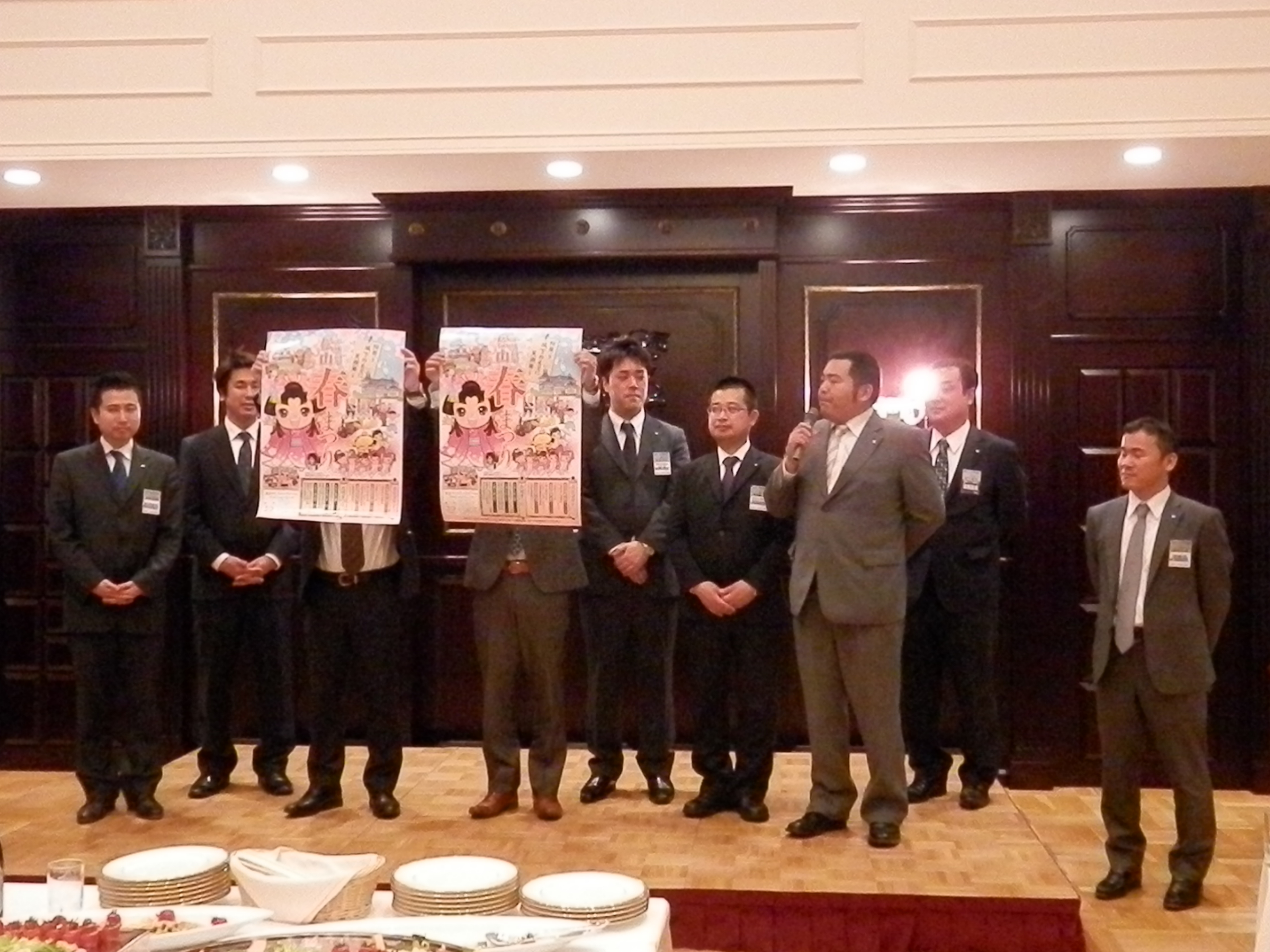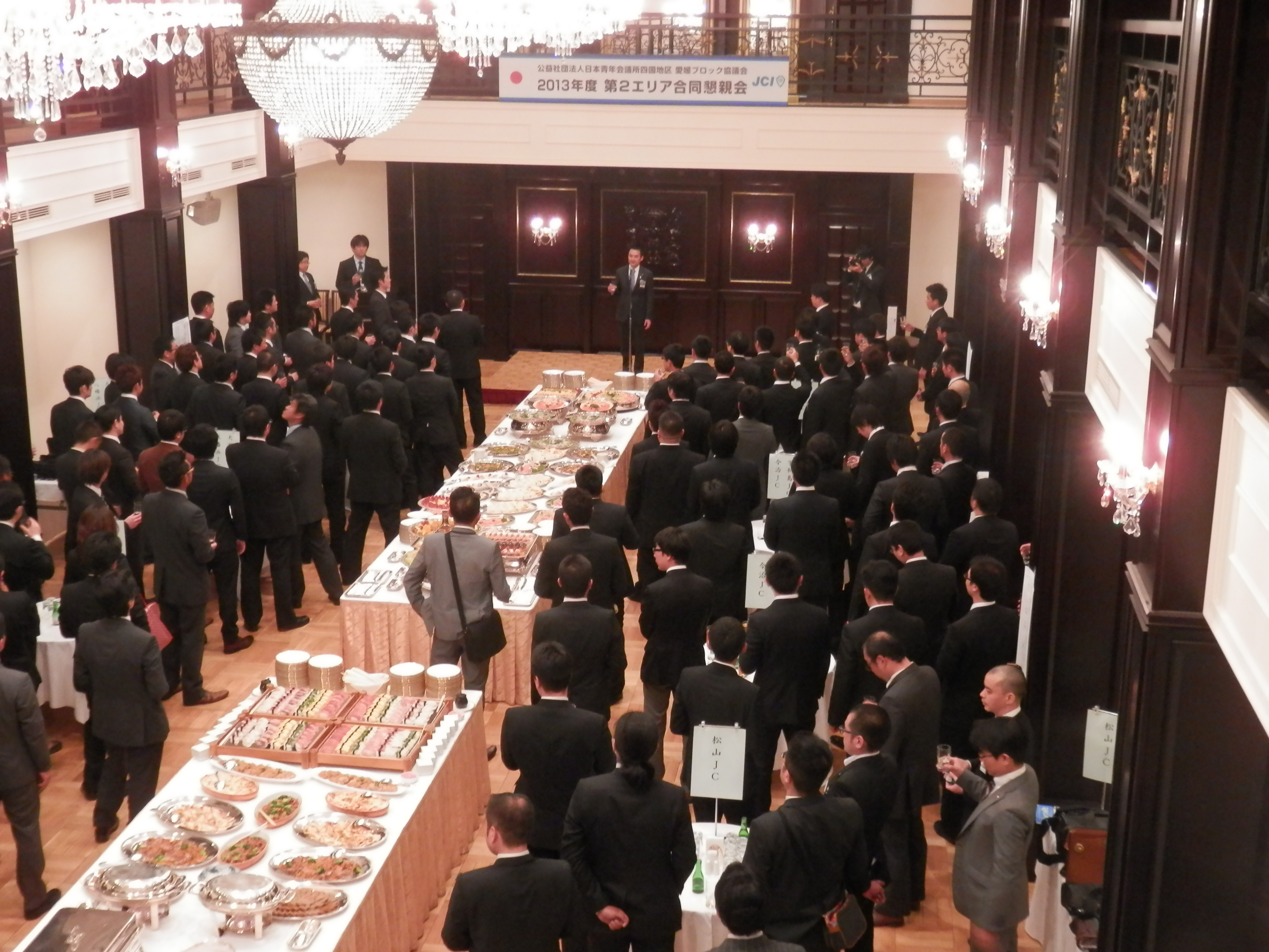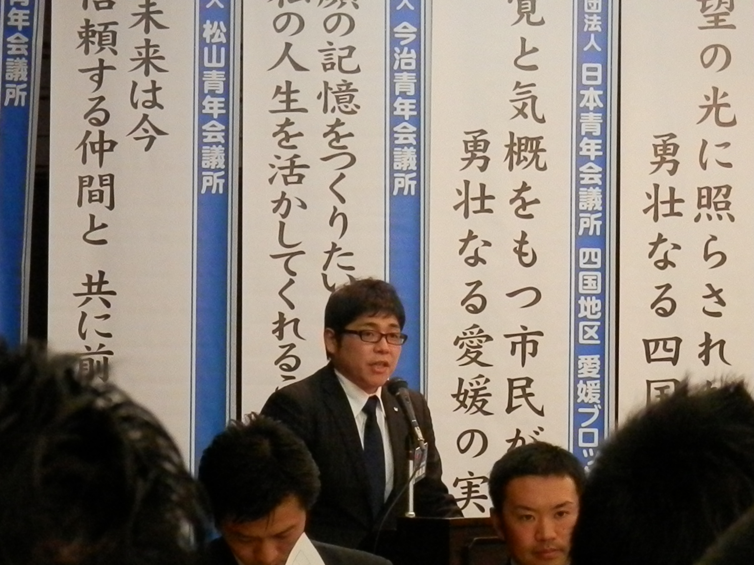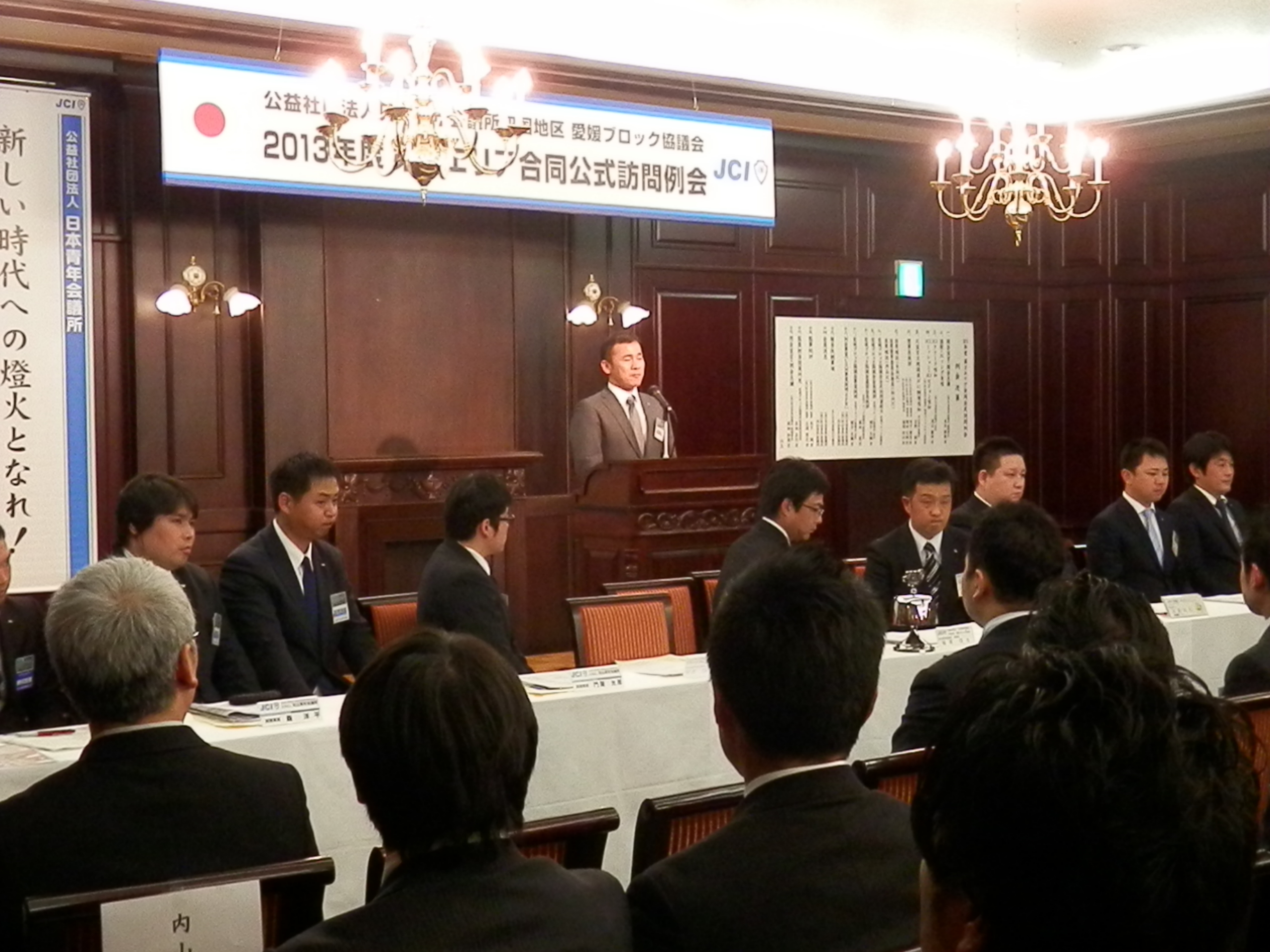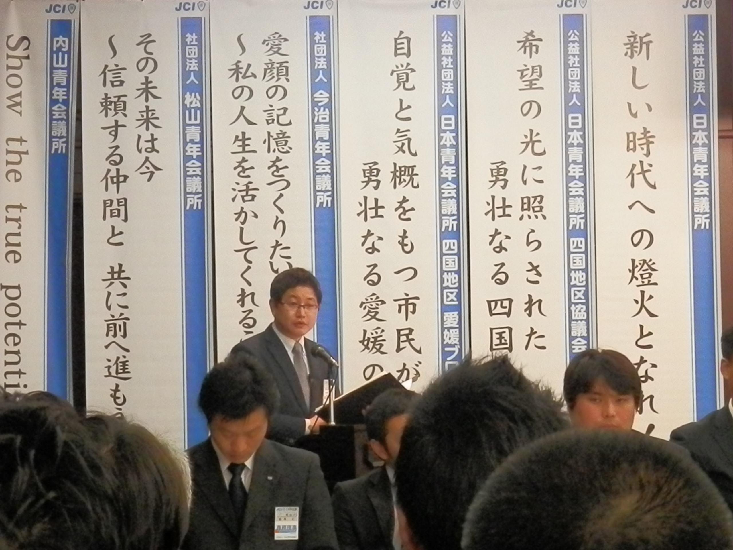 松山青年会議所の3月例会は、公益社団法人日本青年会議所四国地区愛媛ブロック協議会の2013年度第2エリア合同公式訪問例会として、3月19日(火)道後山の手ホテルで行われました。各理事長挨拶の中で増田理事長は、3月10日の復興創造フォーラムに参加し、JCとしての復興活動継続があらためて大切であるとの感想を述べられ、4月27日に開催される対話集会への参加要請もありました。 帽子愛媛ブロック協議会会長からは、先日のフォーラムが復興のあるべき姿を考える契機となったこと、「青年会議所活動にはスピード感が求められる」との挨拶がありました。 例会事業は「各LOM事業説明とPR」。松山JCは、全国大会準備会議議長の今城靖浩君から全国大会の3つの目的(会員の意識高揚・開催地域の活性化と市民意識の変革・世論を動かし社会にポジティブな変革を巻き起こすこと)の説明、松山大会のスケジュール、今年行われる奈良大会の映像を交えたPRがありました。