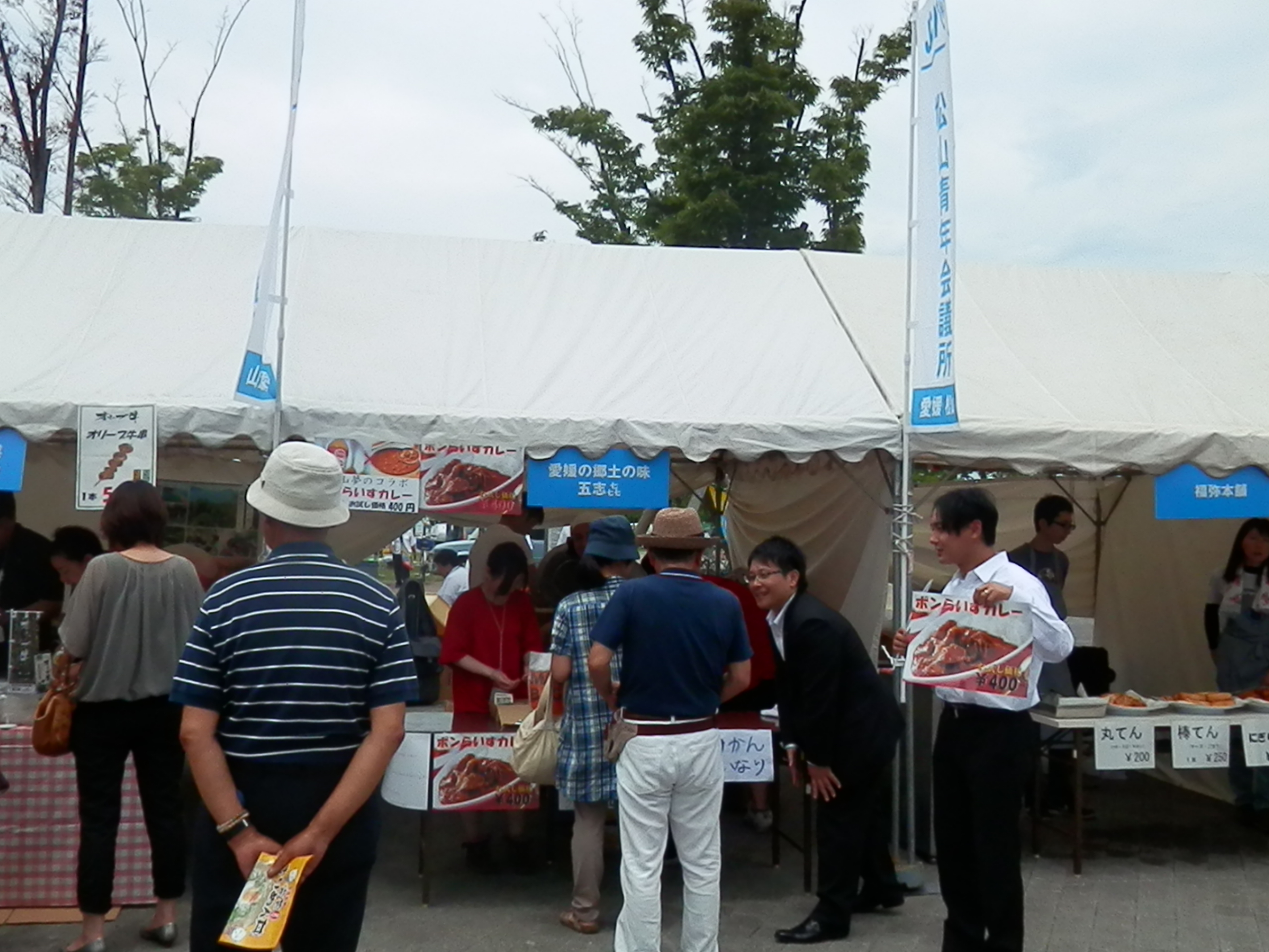 7月6日(土)、香川県高松市において、社団法人 高松青年会議所主管による 「和衷共同~我がまちを照らす燈火となれ~」のスローガンの下、2013年度 四国地区大会 高松大会が開催をされました。AM10:00よりサンポート高松 多目的広場・デックスガレリアにて地域活性四国たからいちが開催され、四国が誇る食文化・伝統芸能が一堂に揃いおたからを発信!小さいお子様からお年寄りの方まで楽しめる工夫された内容となっており、多くの市民の皆様が来場されました。我が松山JCも、地域コミュ二ティ-委員会 中村委員長、松本専務が先頭に立ち、愛媛のまじめなジュース ポンジュースで炊いたお米とカレーのコラボ「ポンらいすカレー」を提供!市民の皆様にも受け入れられ見事完売御礼となりました。また松山のゆるキャラ「よしあきくん」も参加頂き子供達を魅了!松山をしっかりとPR出来たのではないでしょうか。手伝いに来て頂きました丸山先輩、そしてお手伝いの皆様、猛暑の中本当にお疲れ様でした。