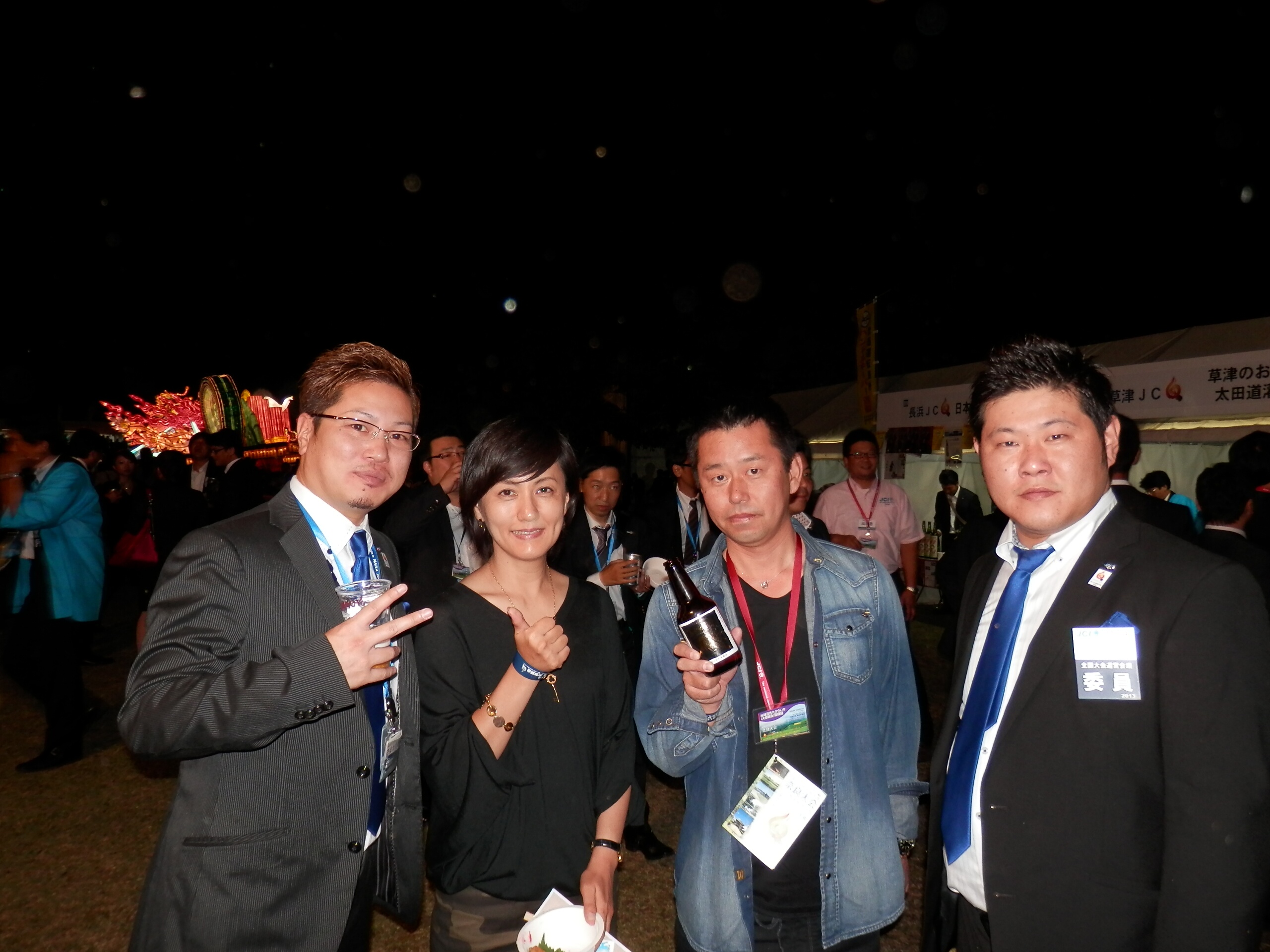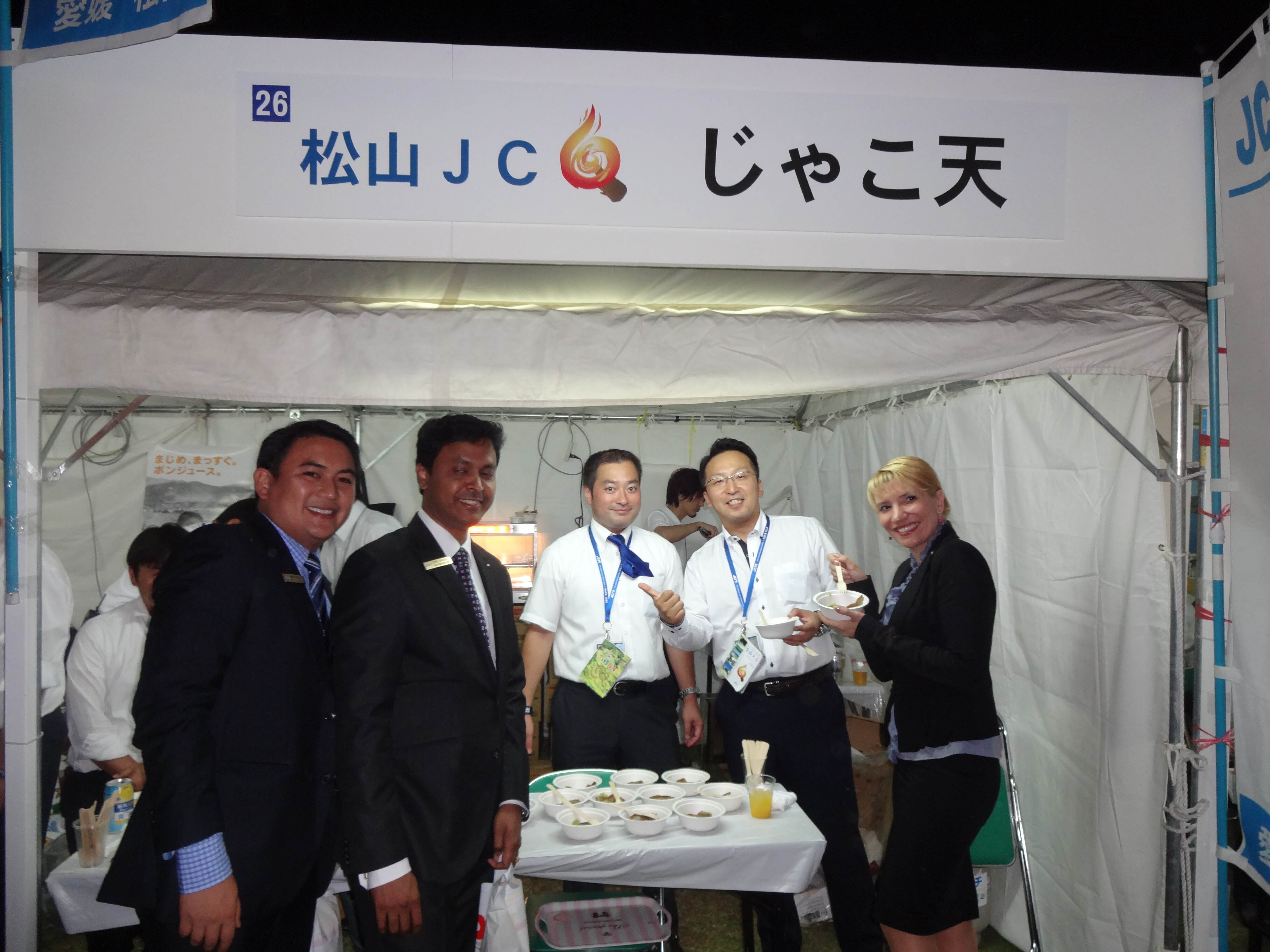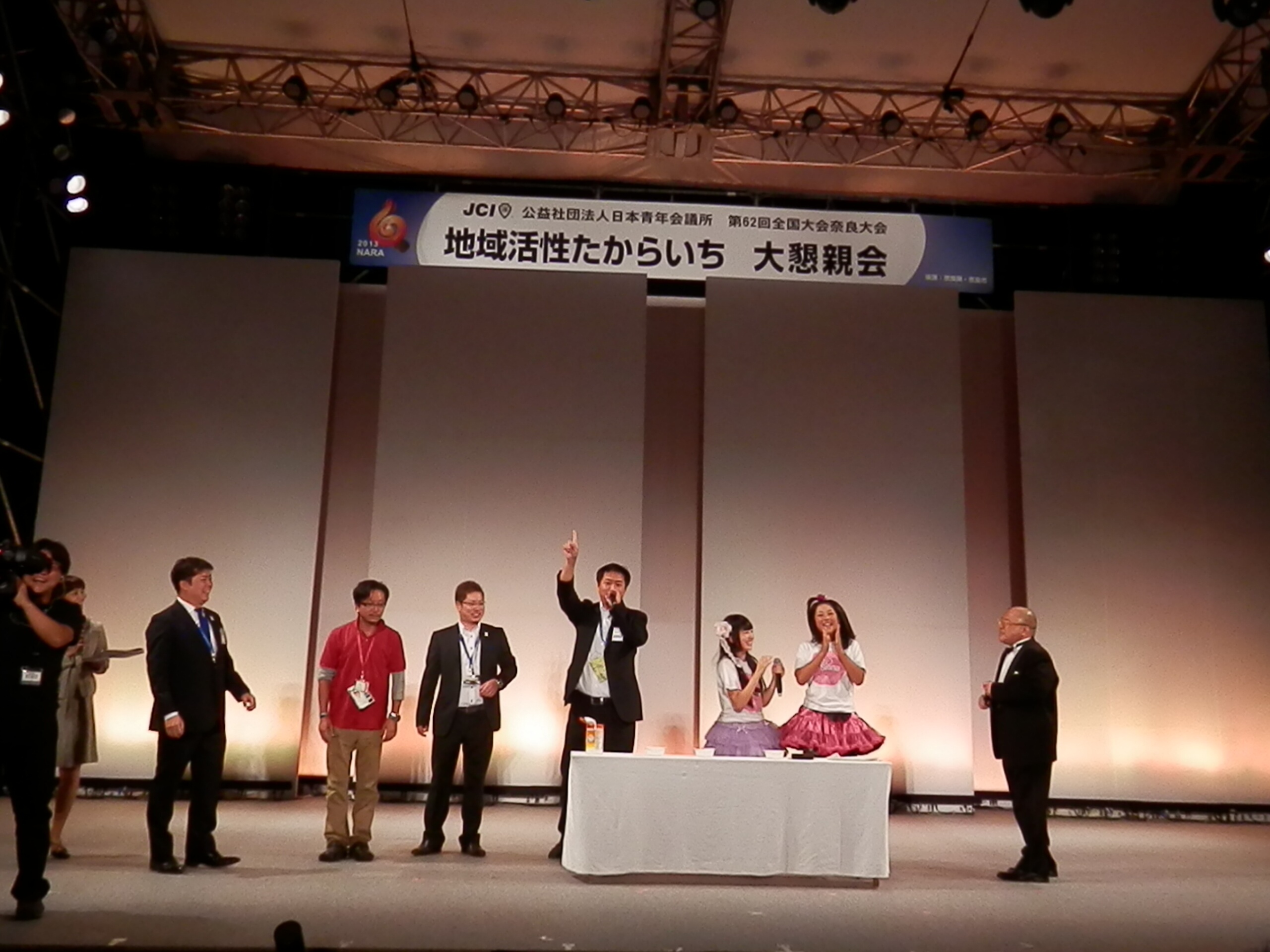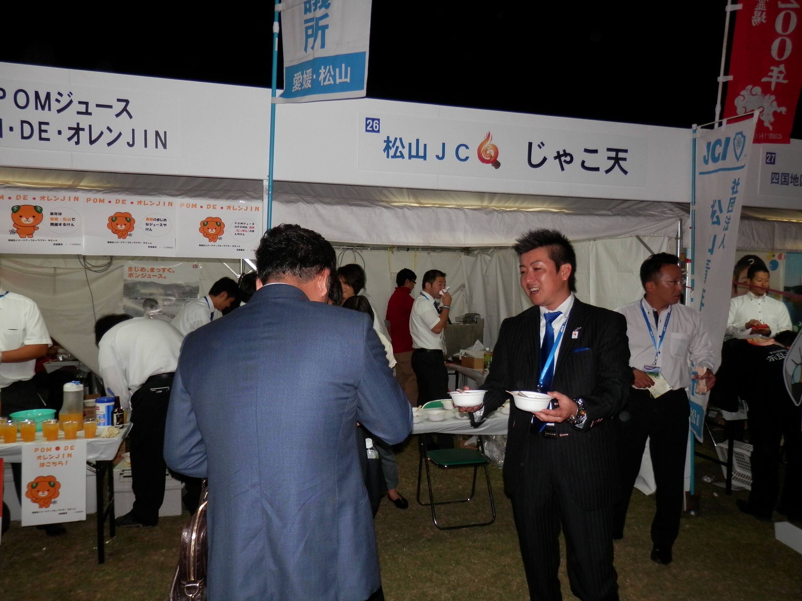 同日午後からは、奈良公園春日野園地で開催される「地域活性たからいち(大懇親会)」準備をお手伝い。古都奈良の顔、奈良公園には“春日大社の神使”といわれる鹿の群れが。中村貴光地域コミュニティ委員長を中心にしたブース出展設営の他に、この神使さまたちのフン拾いを担当。梶木龍臣地域歴史文化室長や橘川直人総務渉外室長の卒業生2人を中心に、本物の「御神鹿(ごじんか)のふん」を集めるという貴重な体験をしました。また、会場入り口では「なら燈花会(とうかえ)」の設営も。水の入ったカップに花の形をしたろうそくを浮べ灯すと、一面には神秘的な雰囲気ができ、全国から集まる多くのメンバーや観光客が感嘆の声をあげていました。「地域活性たからいち(大懇親会)」は、お笑いタレントタージンの軽快な司会でスタート。奈良県マスコットキャラクター「せんとくん」のダンスパフォーマンスやアーティストCrystalKayのライブで盛り上がりました。松山JCブースはじゃこ天と蒸留酒ジンのPOMジュース割り「オレンJIN」を提供。途中「地域のたから発信タイム」内で、岡田副理事長が『まっとるけん』PR。キアラ・ミラニJCI会頭にも松山の宝を堪能していただきました。