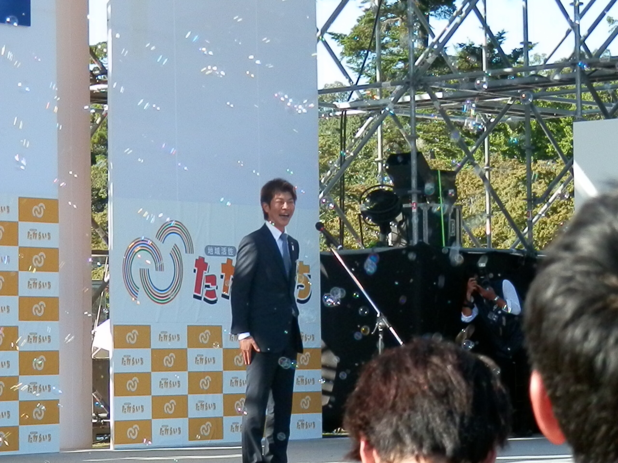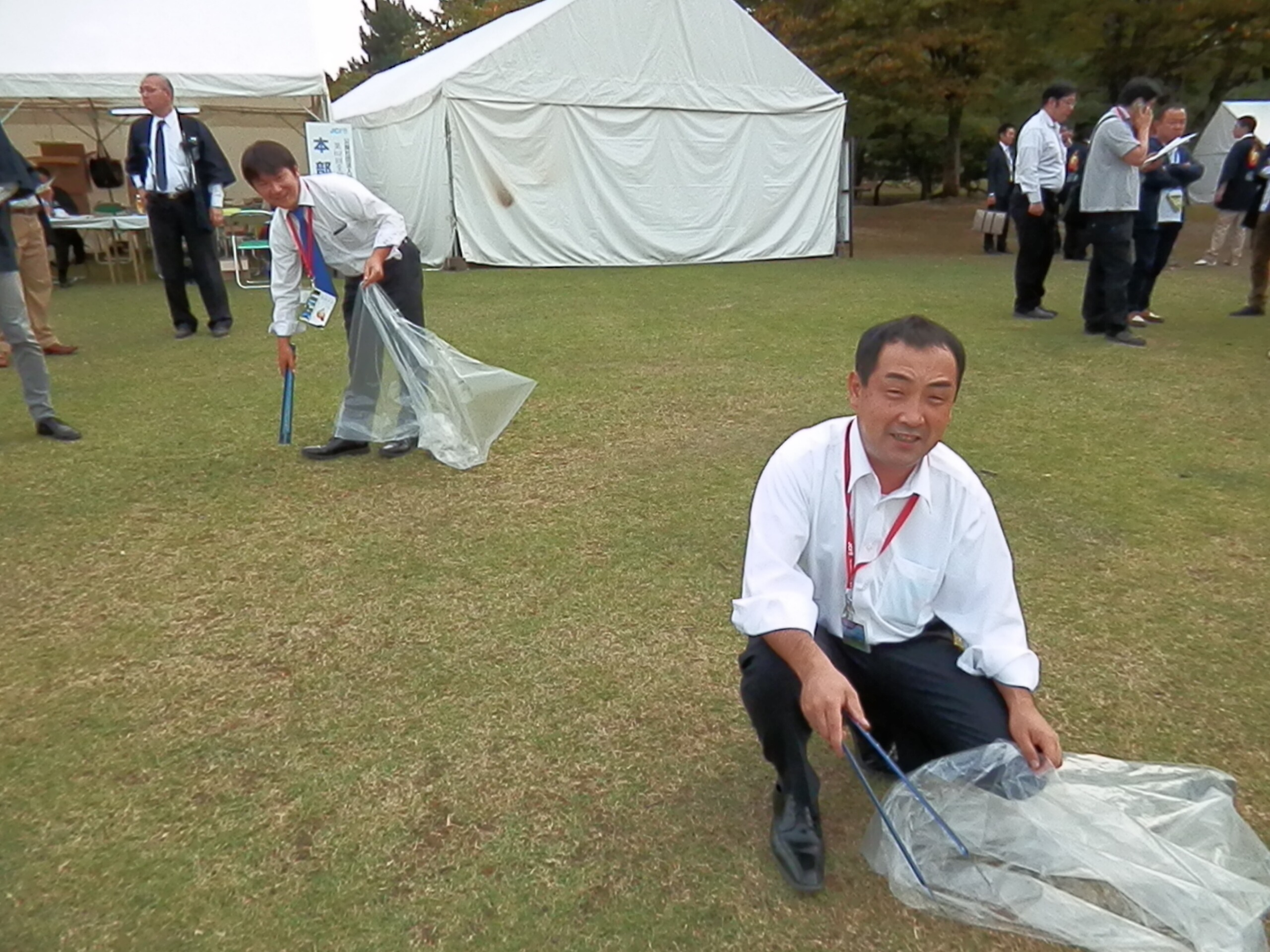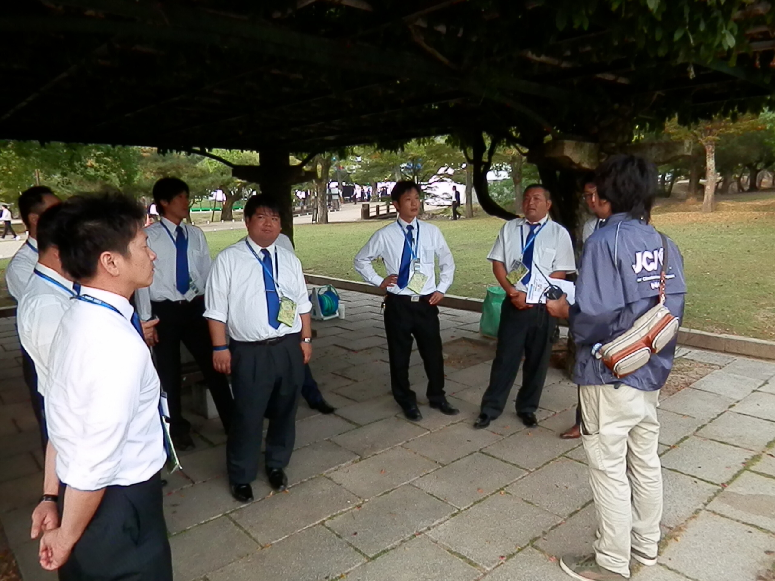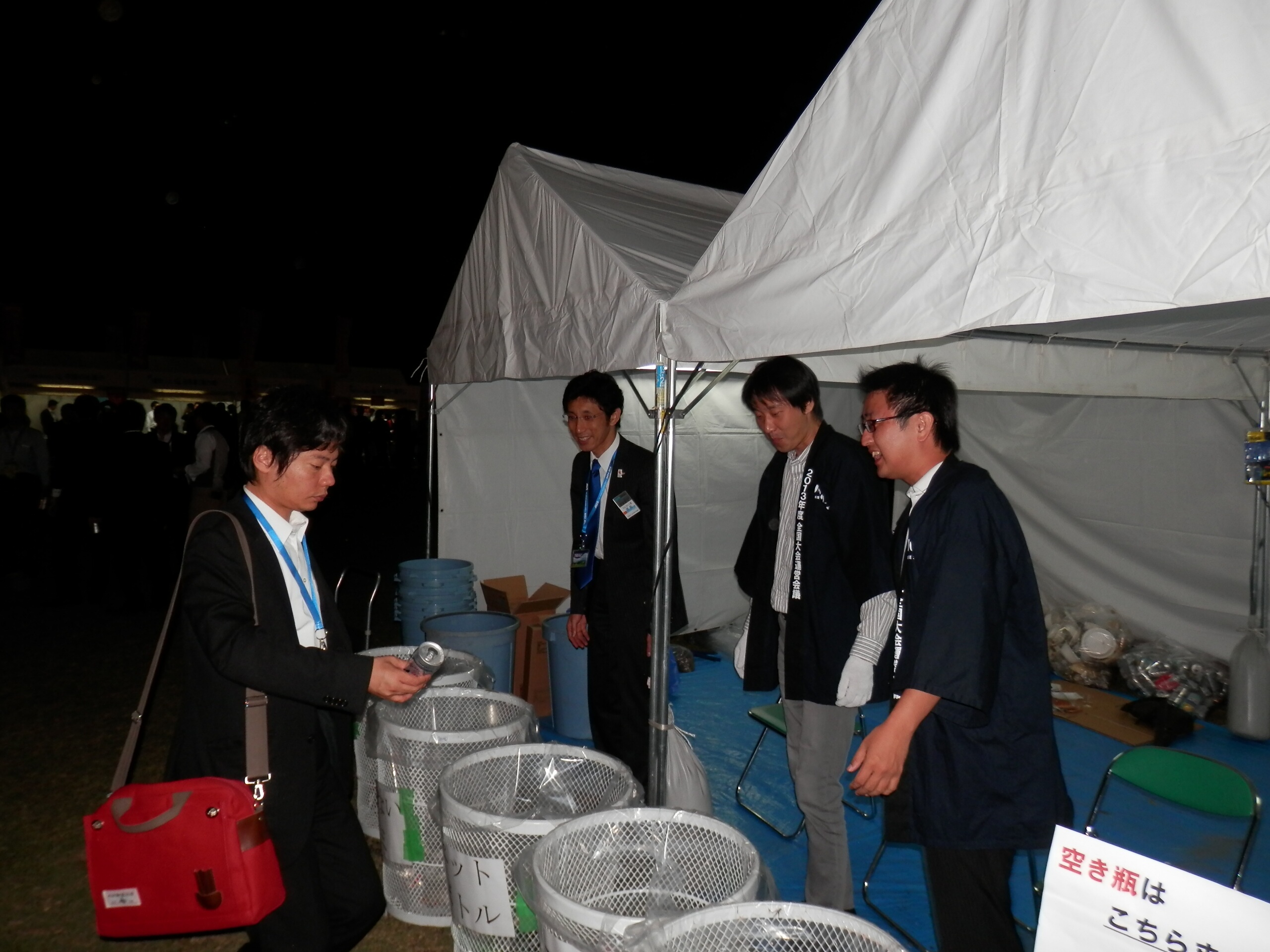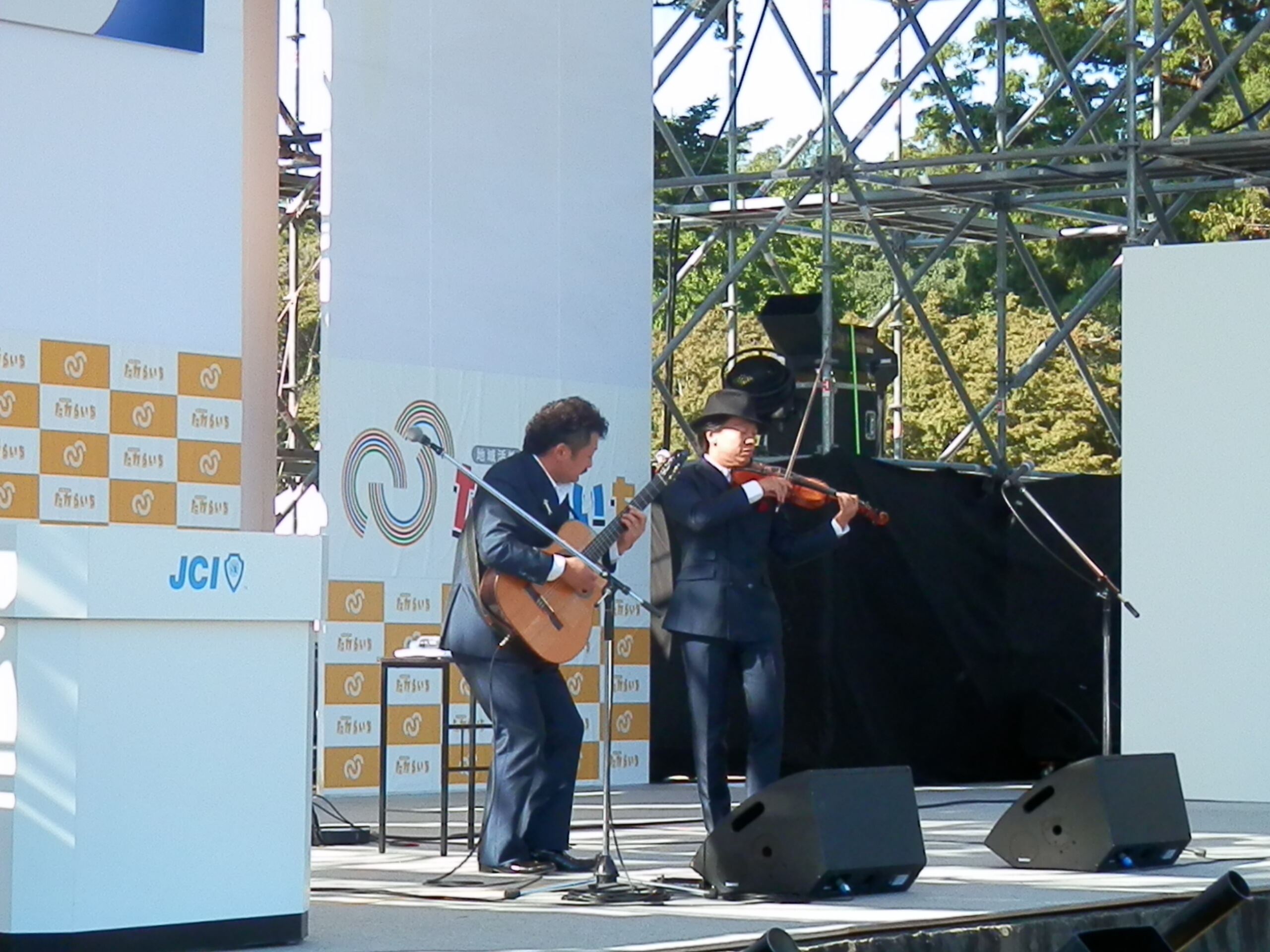 同日午後からは、奈良公園春日野園地で開催される「地域活性たからいち(大懇親会)」準備をお手伝い。古都奈良の顔、奈良公園には“春日大社の神使”といわれる鹿の群れが。中村貴光地域コミュニティ委員長を中心にしたブース出展設営の他に、この神使さまたちのフン拾いを担当。梶木龍臣地域歴史文化室長や橘川直人総務渉外室長の卒業生2人を中心に、本物の「御神鹿(ごじんか)のふん」を集めるという貴重な体験をしました。また、会場入り口では「なら燈花会(とうかえ)」の設営も。水の入ったカップに花の形をしたろうそくを浮べ灯すと、一面には神秘的な雰囲気ができ、全国から集まる多くのメンバーや観光客が感嘆の声をあげていました。「地域活性たからいち(大懇親会)」は、お笑いタレントタージンの軽快な司会でスタート。奈良県マスコットキャラクター「せんとくん」のダンスパフォーマンスやアーティストCrystalKayのライブで盛り上がりました。松山JCブースはじゃこ天と蒸留酒ジンのPOMジュース割り「オレンJIN」を提供。途中「地域のたから発信タイム」内で、岡田副理事長が『まっとるけん』PR。キアラ・ミラニJCI会頭にも松山の宝を堪能していただきました。