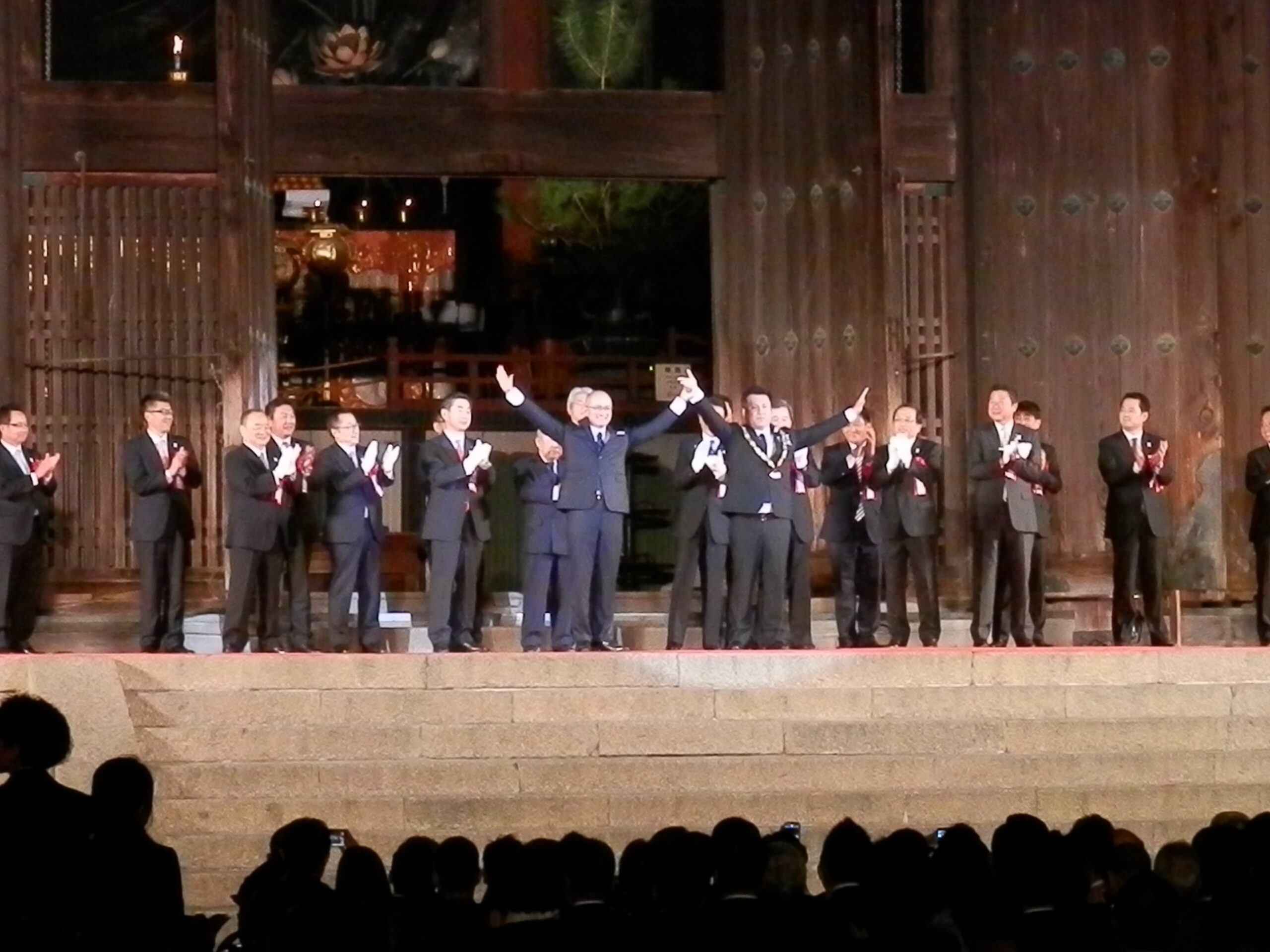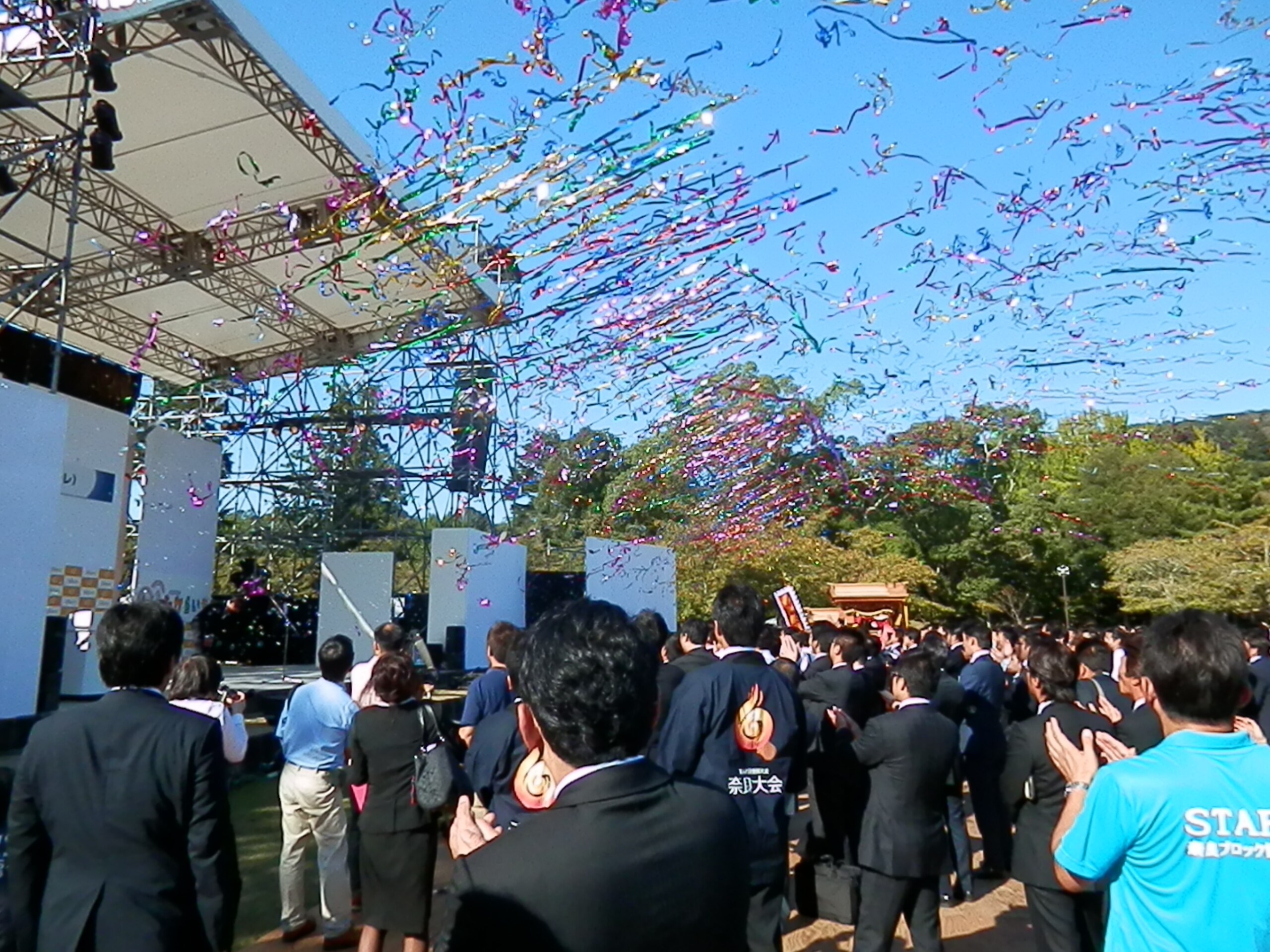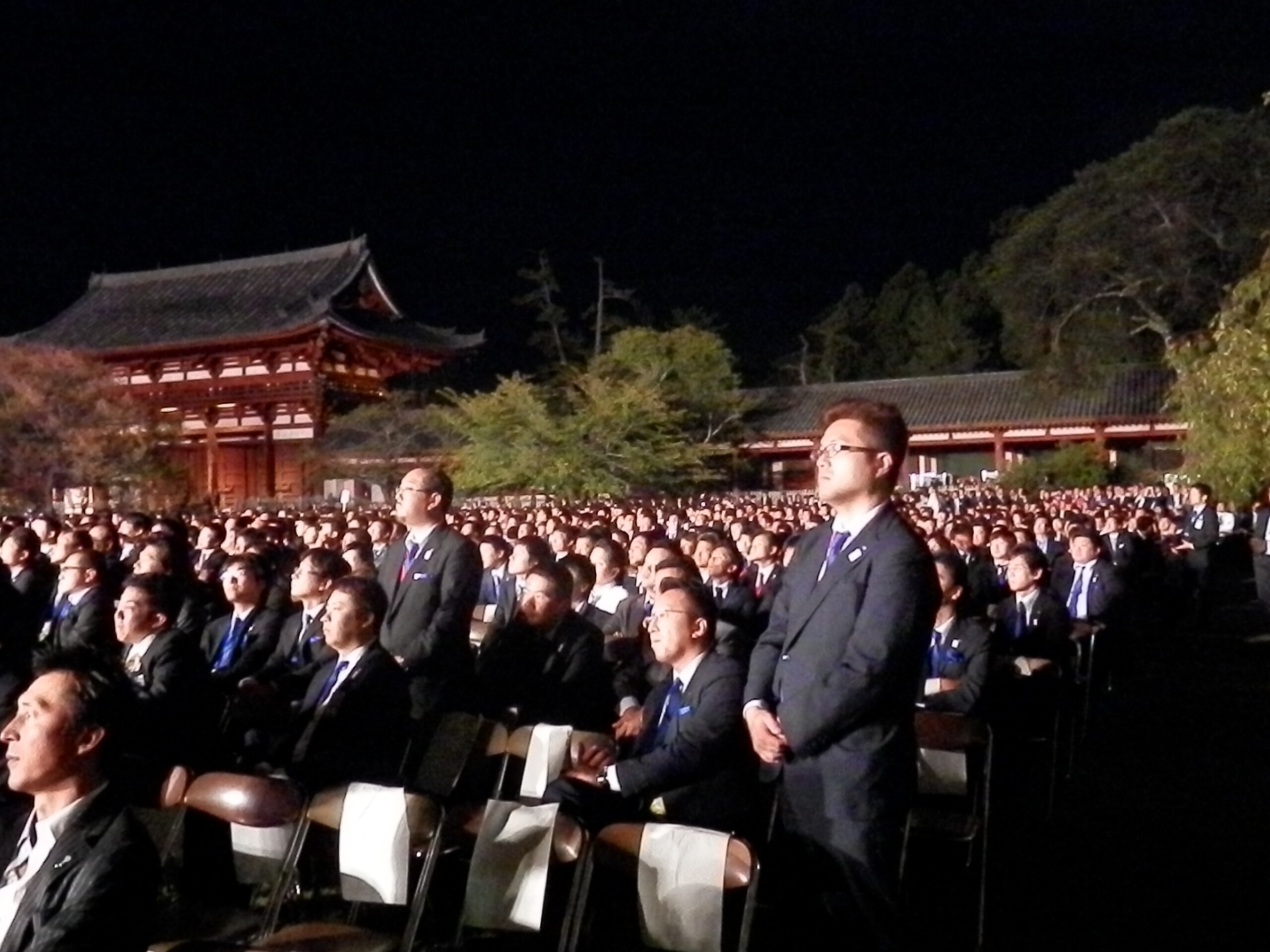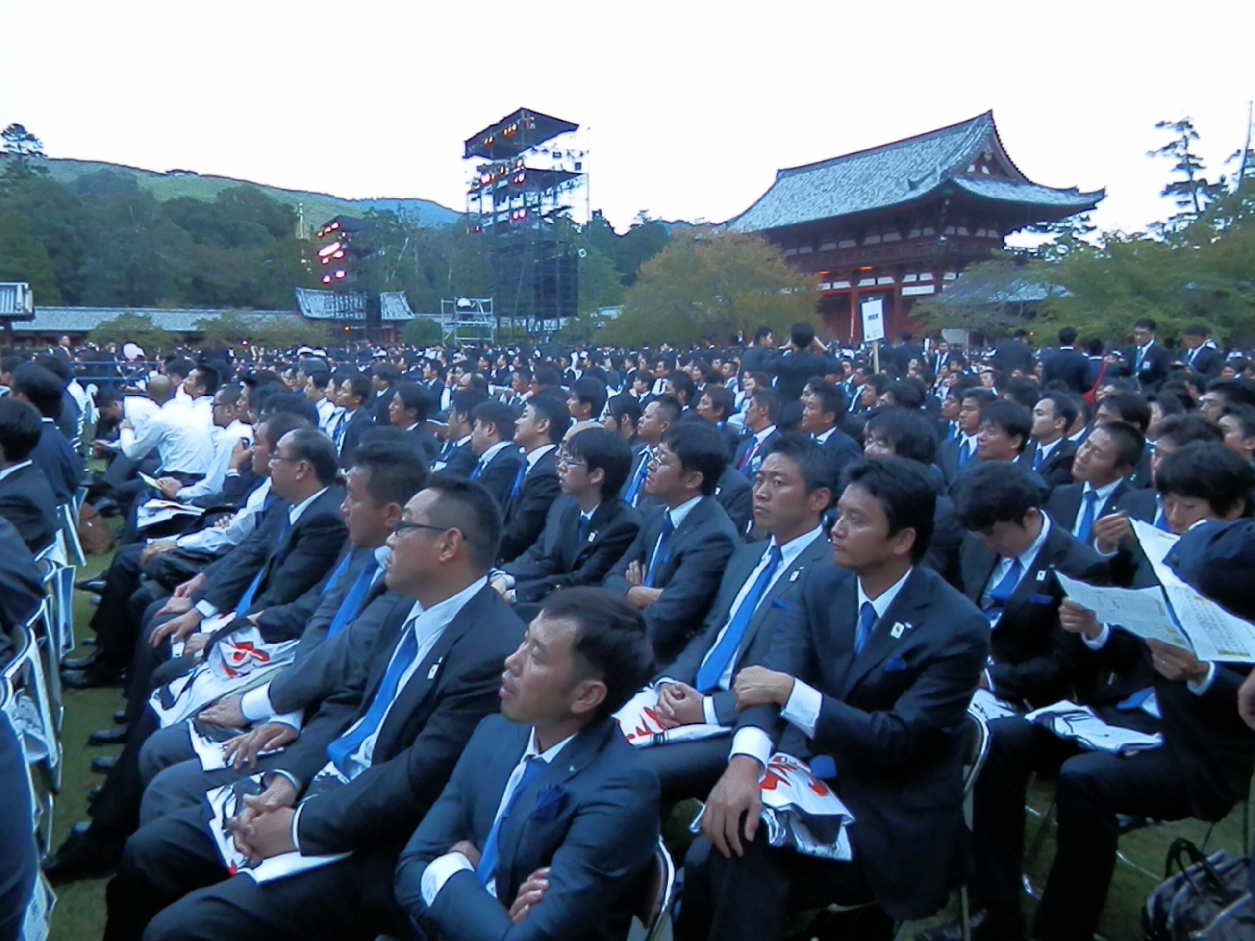 大会3日目は、各会場にてセミナーやフォーラムが開催。なら100年会館のメインフォーラムは「勇壮なる日本へ ~我々が目指す新しい時代~」と題し政治評論家の尾山太郎氏による基調講演が行われました。今の日本が夢をもち大きな課題に向って挑戦することで拓ける新しい時代とはどのような姿であるか、またその可能性についての話がありました。同日夕刻からは東大寺大仏殿での大会式典。来賓紹介・挨拶のあと、小畑宏介会頭が『燈火がある限り希望は消えないし夢は終わりません。皆さんが未来への希望であることを疑わず、運動を進めて欲しい』とメインスピーチ。2014年度会頭候補者として鈴木和也君(岡崎JC)が紹介され、『たくましい国 日本の創造にはメンバーの志が必要。今を生きる責任世代の一人として矜持を取り戻して欲しい』と力強い挨拶がありました。そしていよいよ全国大会に向けて。「大会の鍵の伝達」で増田大典理事長と門屋光彦第63回全国大会松山大会実行委員長予定者が大会鍵を受け取りました。映像にて2014年度全国大会開催地紹介が行われた後、代表挨拶にて『大会に接するすべての人々に「ことばのちから」を感じていただき、小説「坂の上の雲」の主人公たちの精神でたくましい国日本の創造を確立したい』と増田理事長が誓うと、登壇した私たちに対し、会場からは多くの激励の拍手が送られました。卒業式では、元T-BOLANの森友嵐士さんから歌のプレゼントがあり、5182名の卒業生を代表して浦田一哉日本JC副会頭から『今日より明日が良くなるために、必ずこの2013年を超えるよう成長して欲しい』との後輩に贈る言葉がありました。卒業生の皆さん、本当におめでとうございました。