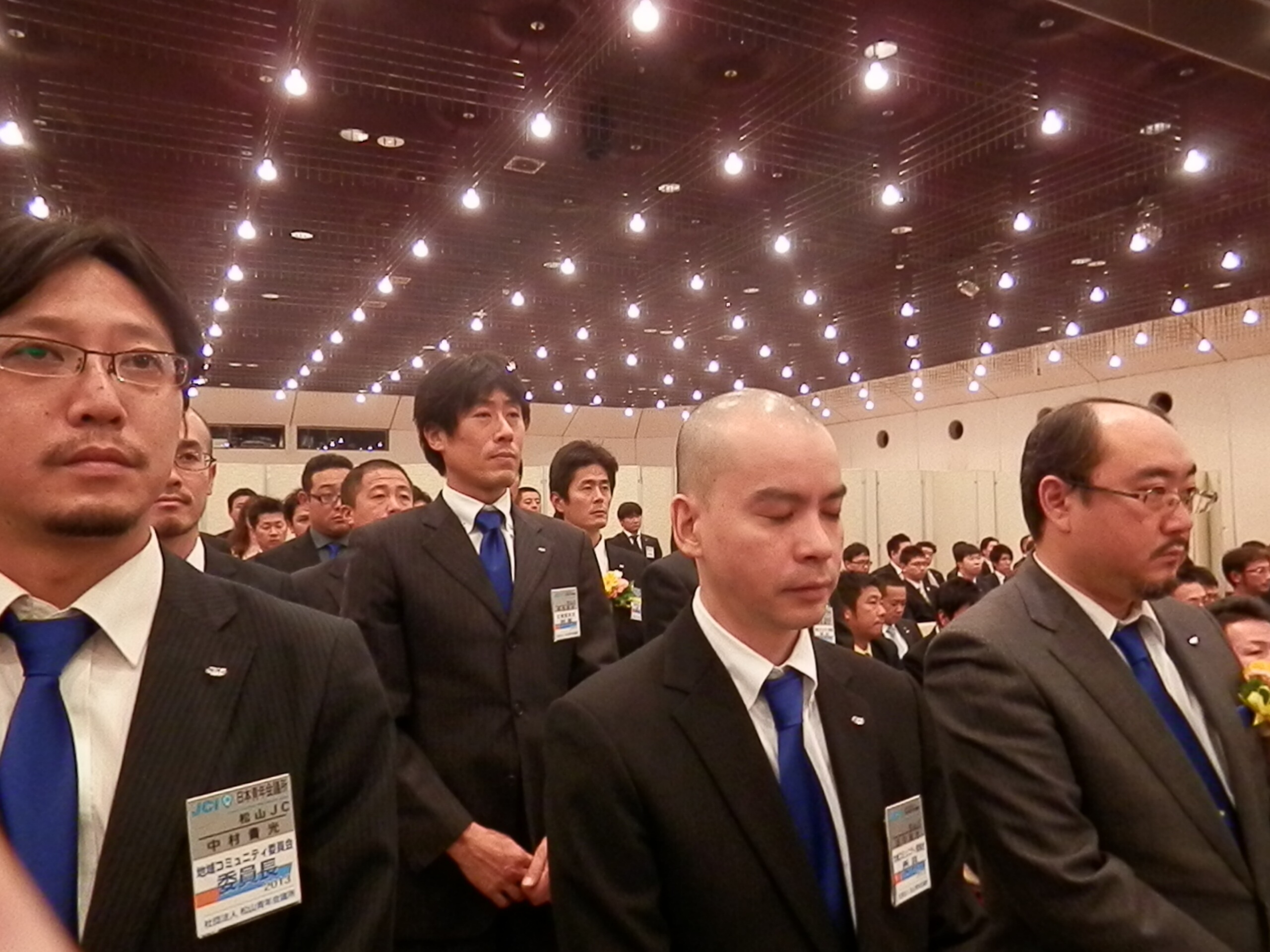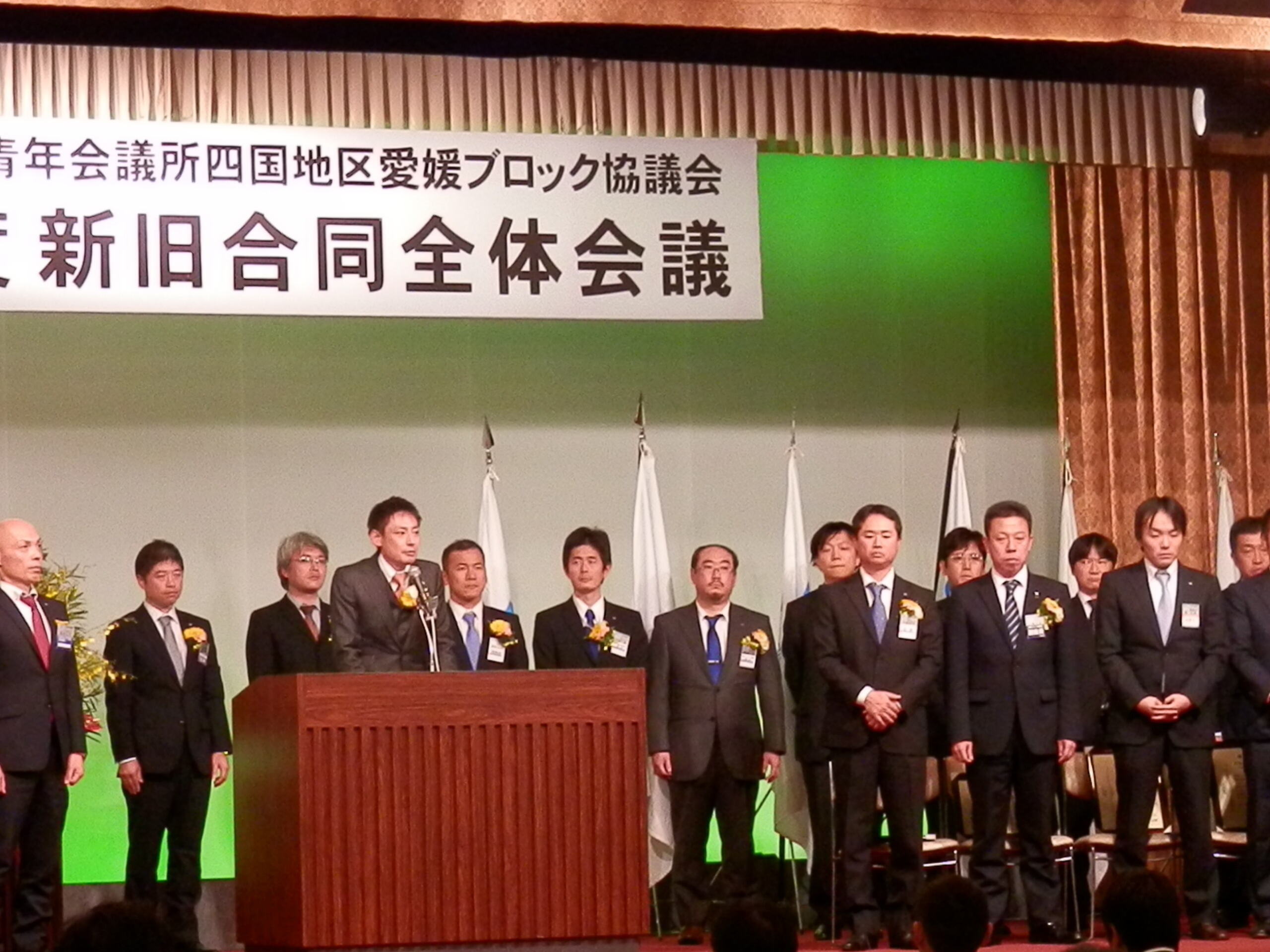 公益社団法人日本青年会議所四国地区愛媛ブロック協議会2013年度新旧合同全体会議・功労賞授与式・卒業式が11月23日(土)、松山市のホテル奥道後で開催されました。全体会議で、帽子大輔愛媛ブロック協議会会長は『人は支えていただいていることを忘れがちになるが、皆さんは時に支え、支えられる仲間になって欲しい』と1年間の事業への協力と参加への感謝を交え挨拶。増田大典理事長は、『来年の全国大会は皆さんの協力をいただき、共につくりあげていきたい』と開催地LOMを代表して述べられました。各委員会・会議から今年度の活動報告に続き、日本JC渉外委員会へ出向した横山伸也君が、ブロック推薦出向への感謝と全国大会奈良大会での経験を報告。次年度へのブロック旗伝達も行われ、愛媛ブロック2014年度会長の石川誠二君が『全国大会松山大会はメンバー一人ひとりが主体性を持ち行動しよう』と呼びかけ、来年度の役員・スタッフ紹介がありました。その後、梶木龍臣君や三浦秀之君をはじめ各メンバーへ功労賞授与が行われ、卒業式では、帽子会長からお祝いの言葉がかけられました。帽子ブロック会長、1年間本当にお疲れ様でした。そして卒業生の皆さんおめでとうございます。広報委員会 伊藤賢司