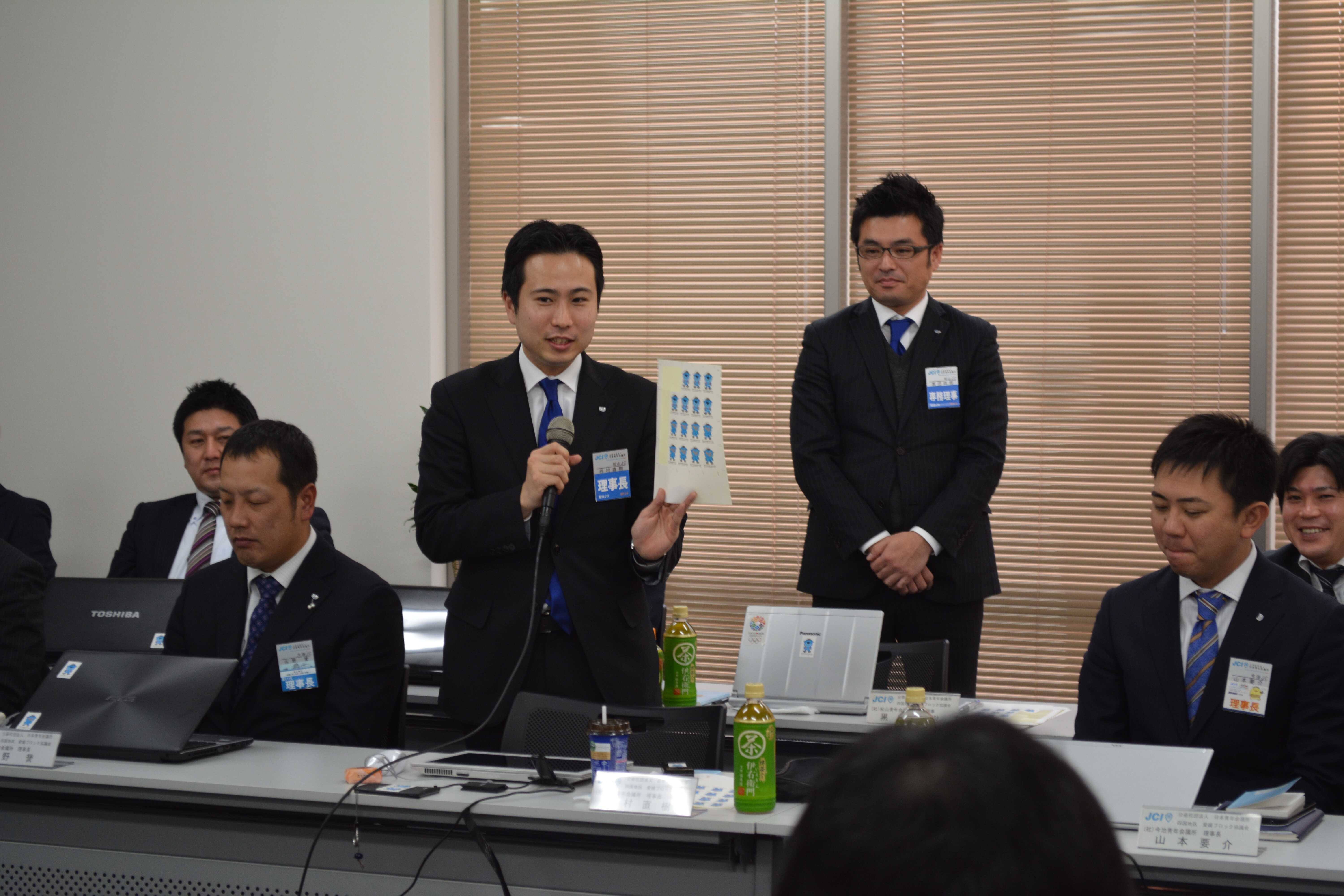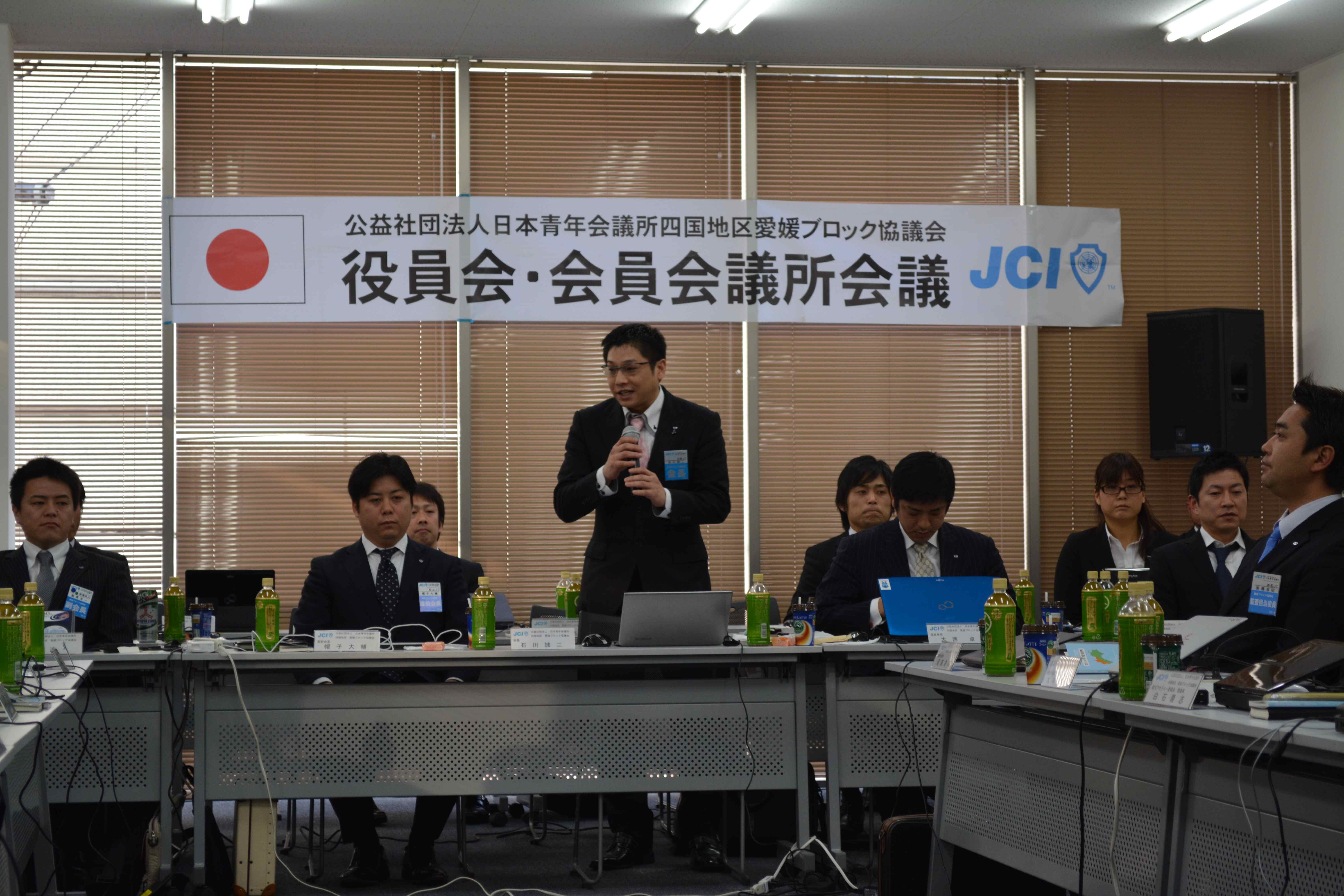 公益社団法人日本青年会議所四国地区愛媛ブロック協議会、2014年度第1回役員会議と会員会議所会議が、松山市の久保豊ビルで開催されました。西村理事長からは、松山青年会議所公式キャラクター「まっとる犬」のPRもさせていただきました。