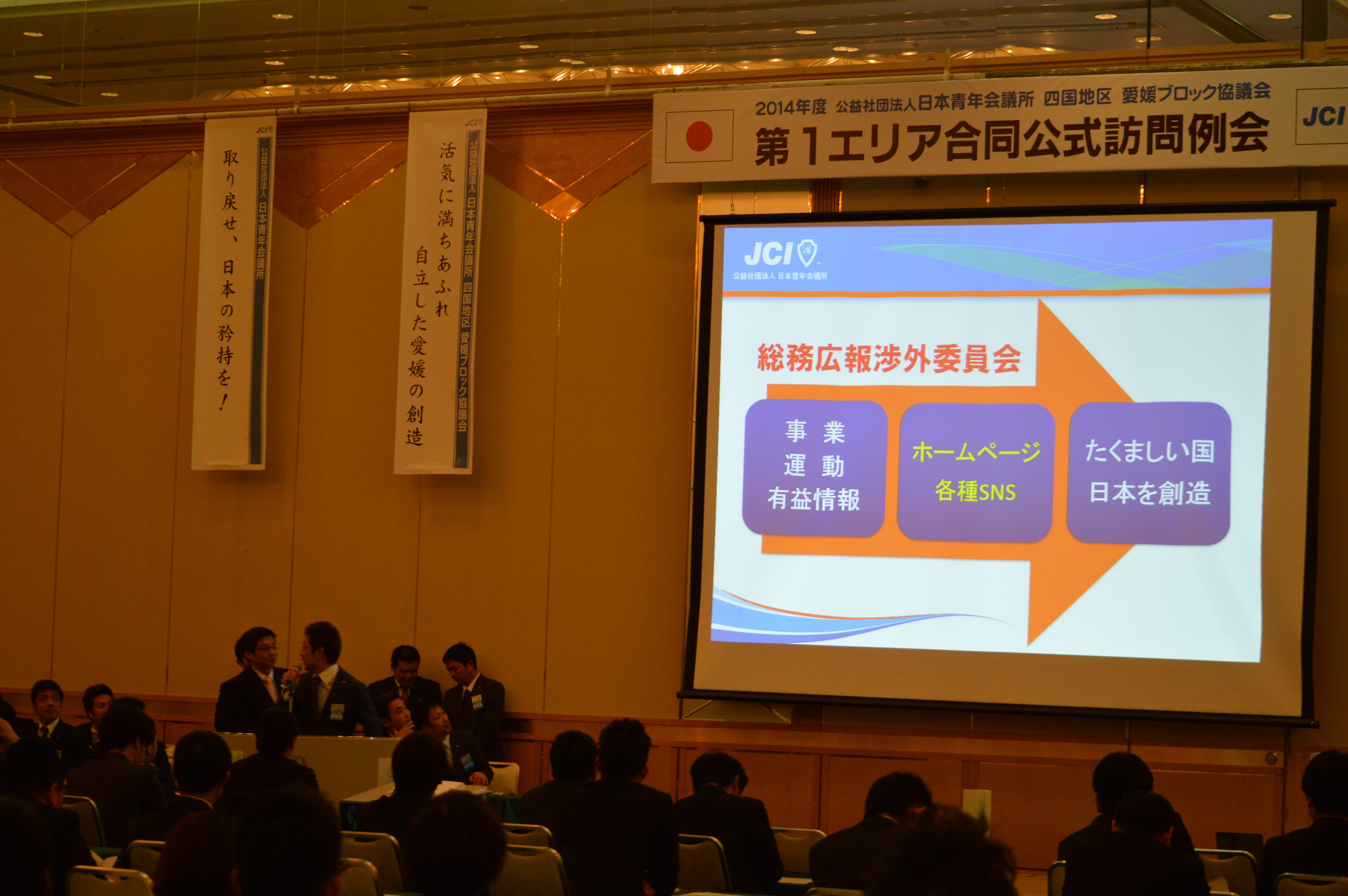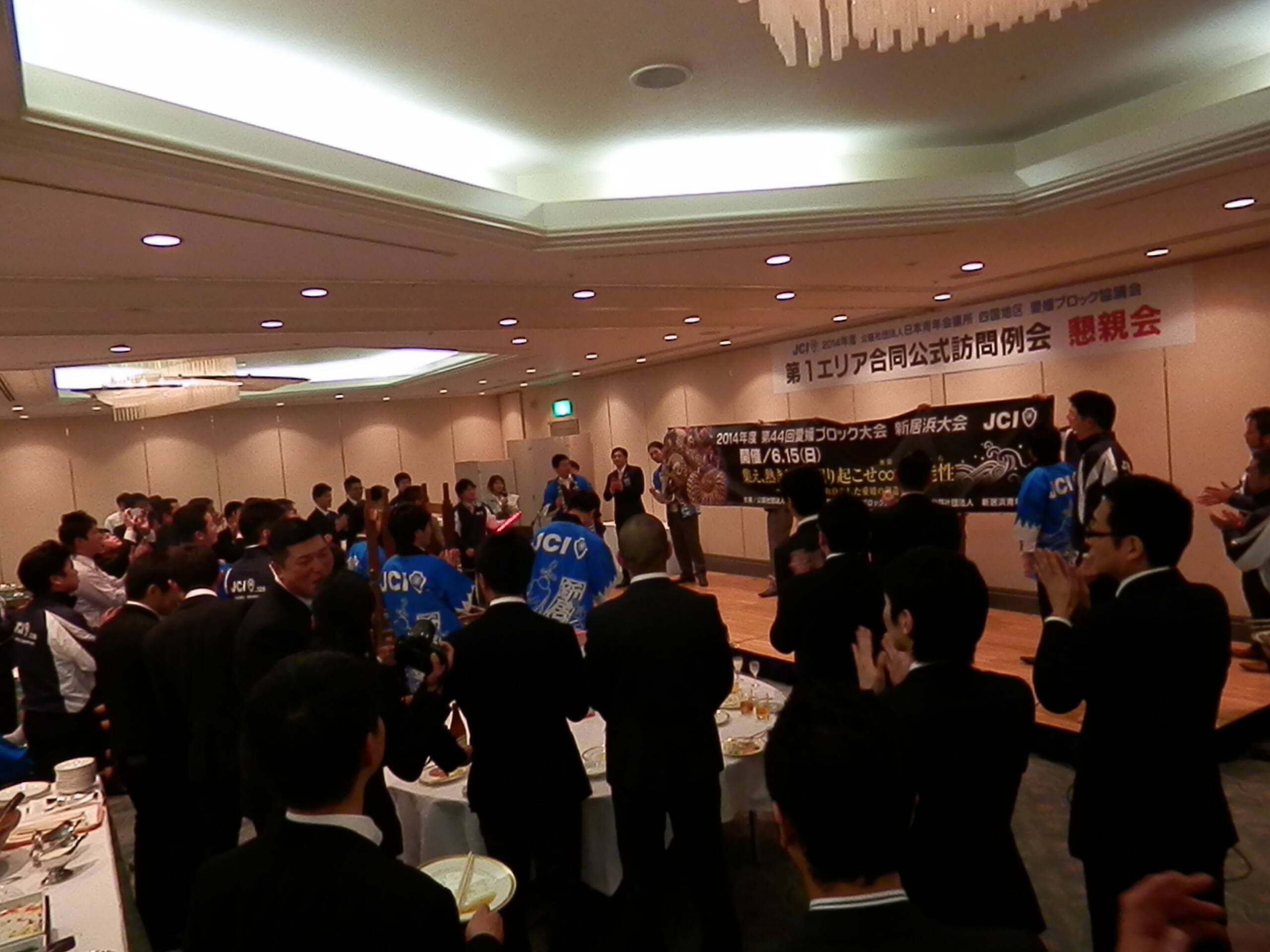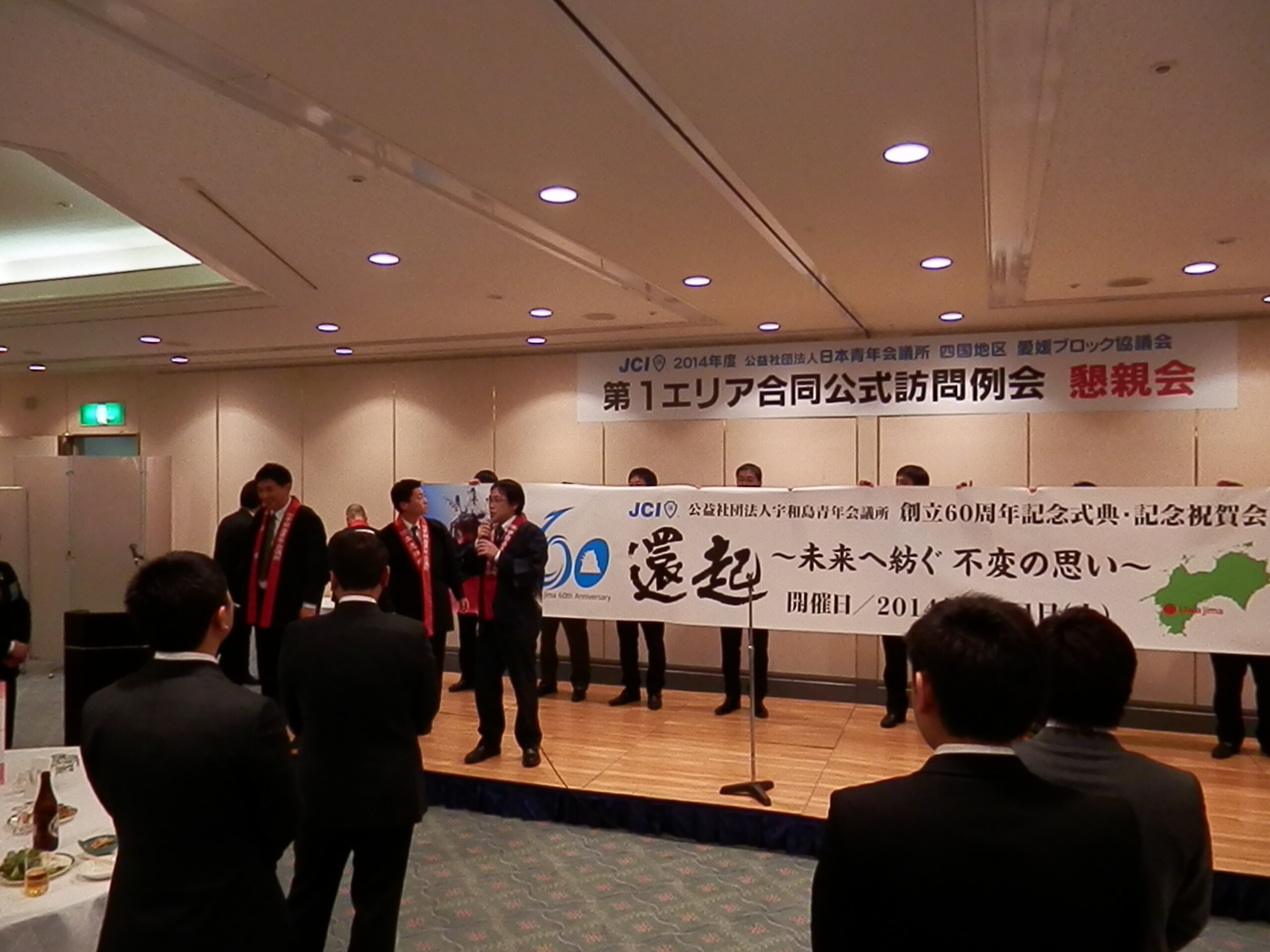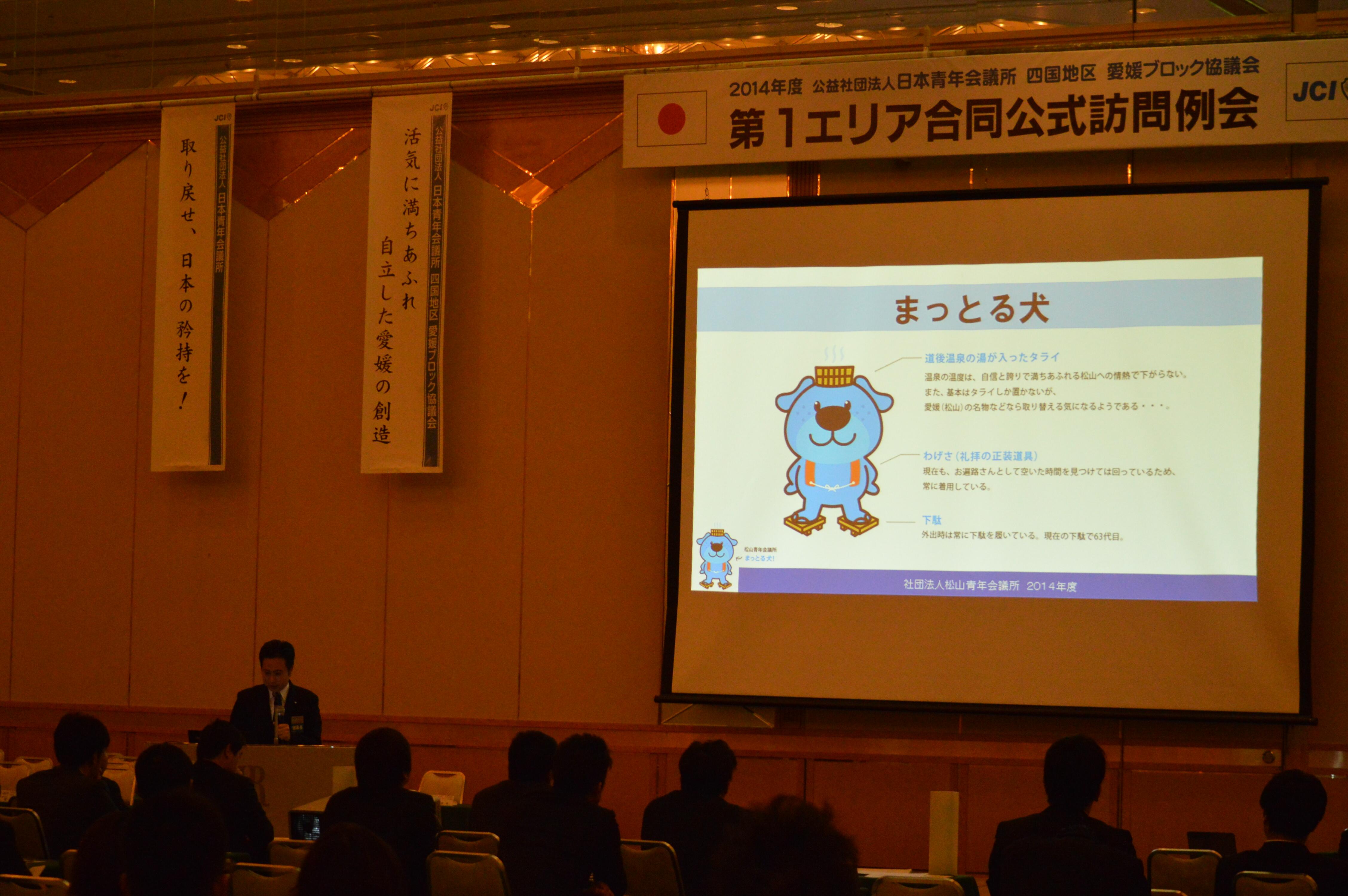 2014年2月13日(木) 2月12日 愛媛ブロック第1エリア合同公式訪問例会 2014年度公益社団法人日本青年会議所四国地区愛媛ブロック協議会第1エリア合同公式訪問例会が、2月12日(水)新居浜市のリーガロイヤルホテル新居浜で行われ、松山JCからも約30名がオブザーブ参加いたしました。法皇JC、新居浜JC、西条JCの各理事長様による挨拶では、全国大会松山大会についても触れていただき、『愛媛もひとつ!』の掛け声も。愛媛ブロックの今年度事業方針説明のあと、「第63回全国大会松山大会について」と題した例会アワーで、西村直樹理事長から松山JCキャラクター「まっとる犬」や大会テーマについての紹介、説明もありました。
