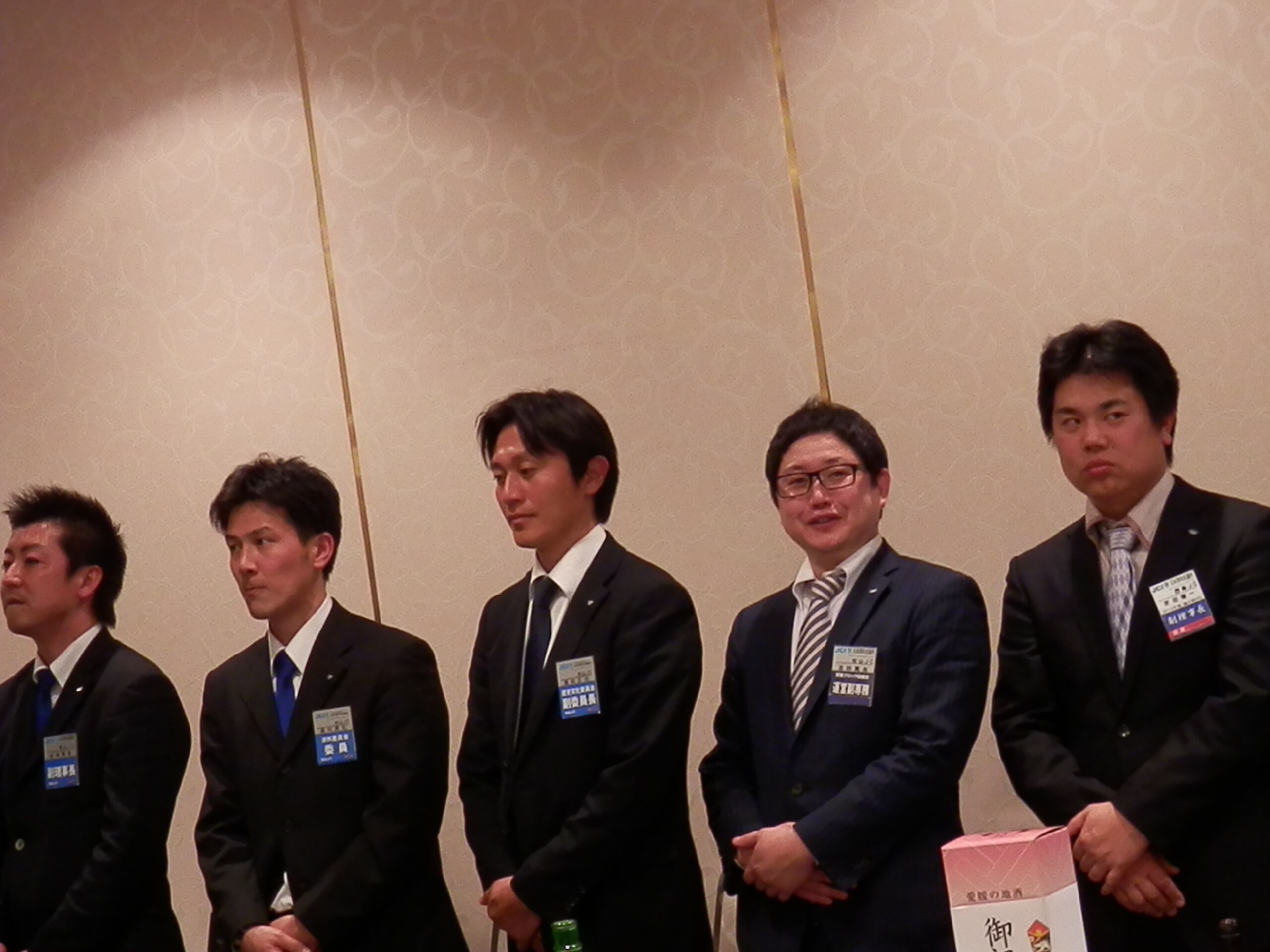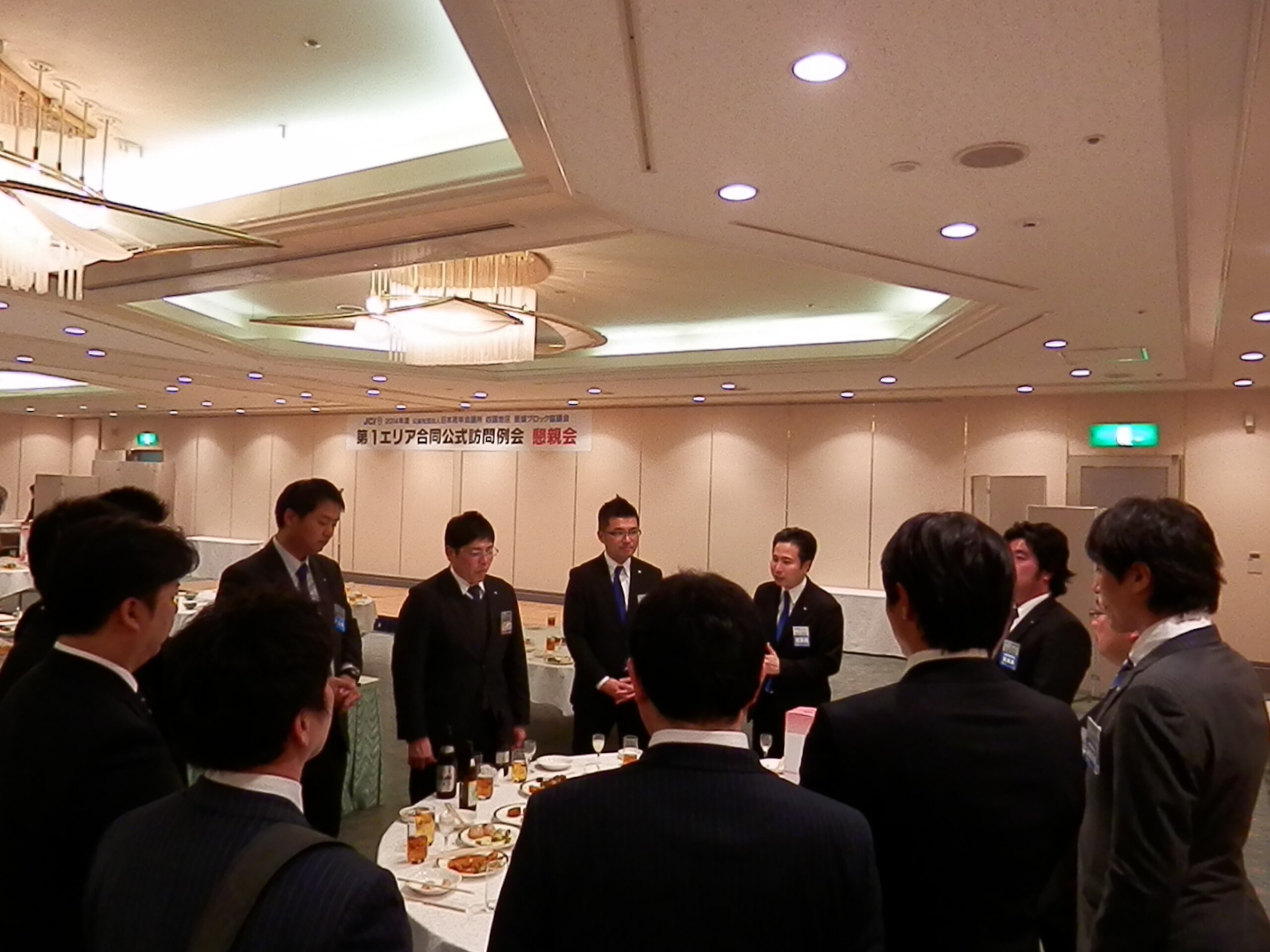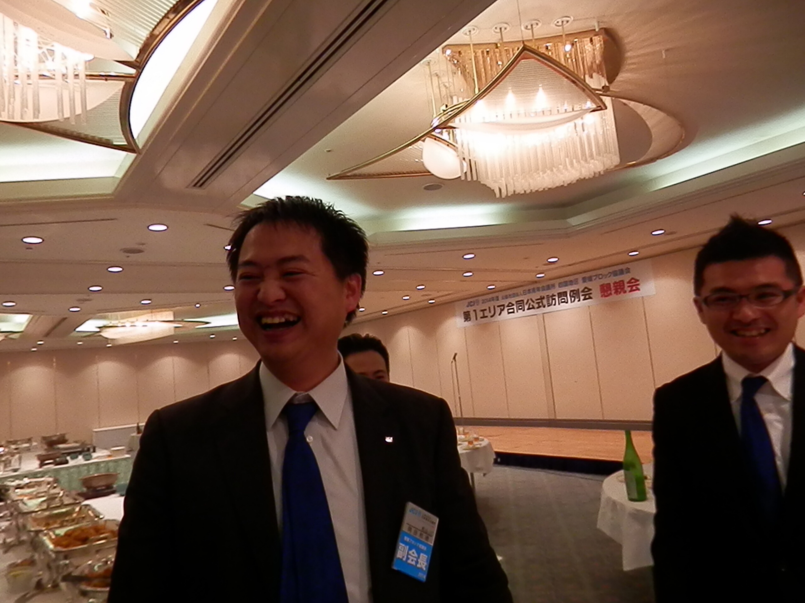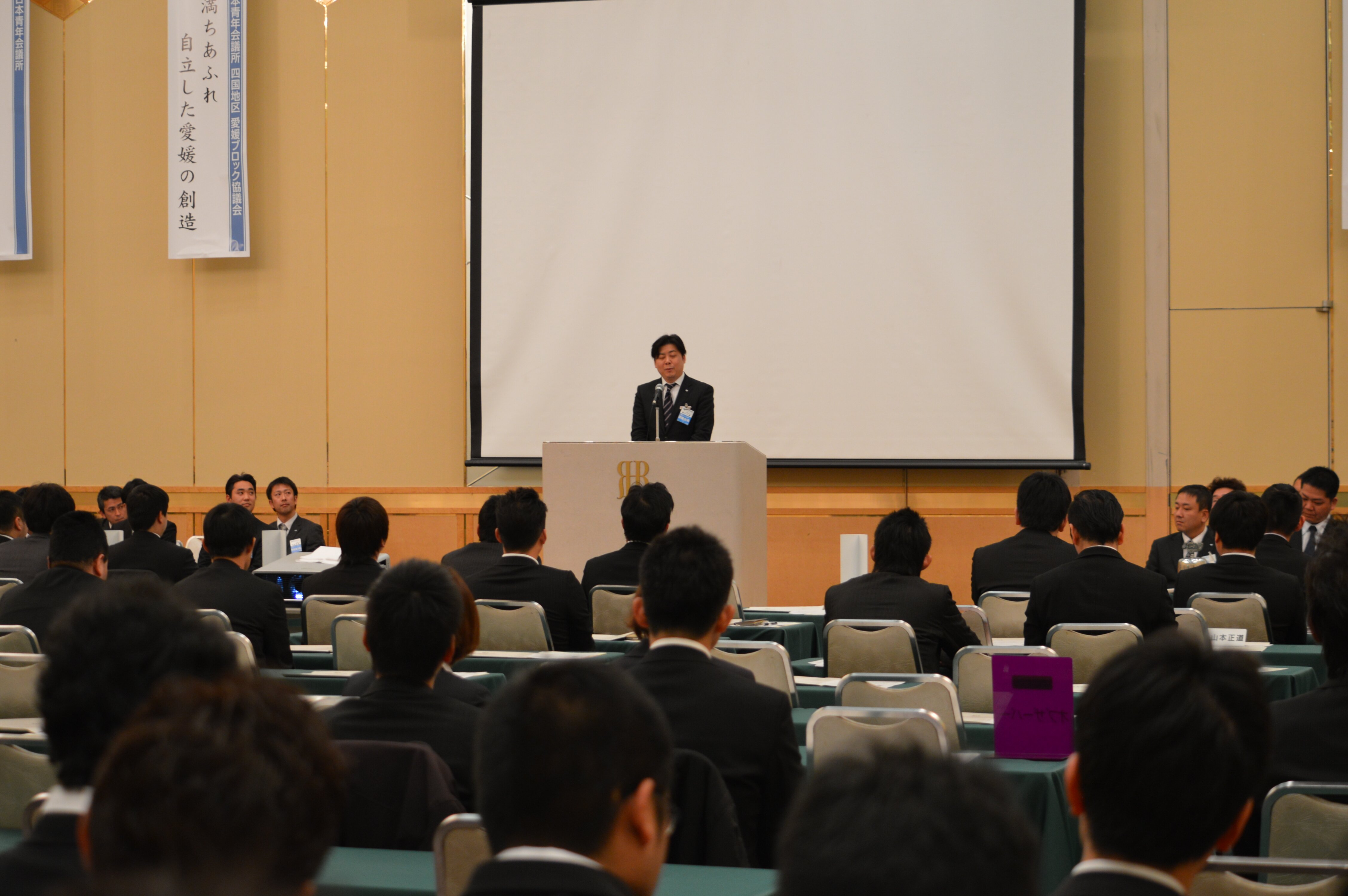 2014年2月13日(木) 2月12日 愛媛ブロック第1エリア合同公式訪問例会 2014年度公益社団法人日本青年会議所四国地区愛媛ブロック協議会第1エリア合同公式訪問例会が、2月12日(水)新居浜市のリーガロイヤルホテル新居浜で行われ、松山JCからも約30名がオブザーブ参加いたしました。法皇JC、新居浜JC、西条JCの各理事長様による挨拶では、全国大会松山大会についても触れていただき、『愛媛もひとつ!』の掛け声も。愛媛ブロックの今年度事業方針説明のあと、「第63回全国大会松山大会について」と題した例会アワーで、西村直樹理事長から松山JCキャラクター「まっとる犬」や大会テーマについての紹介、説明もありました。