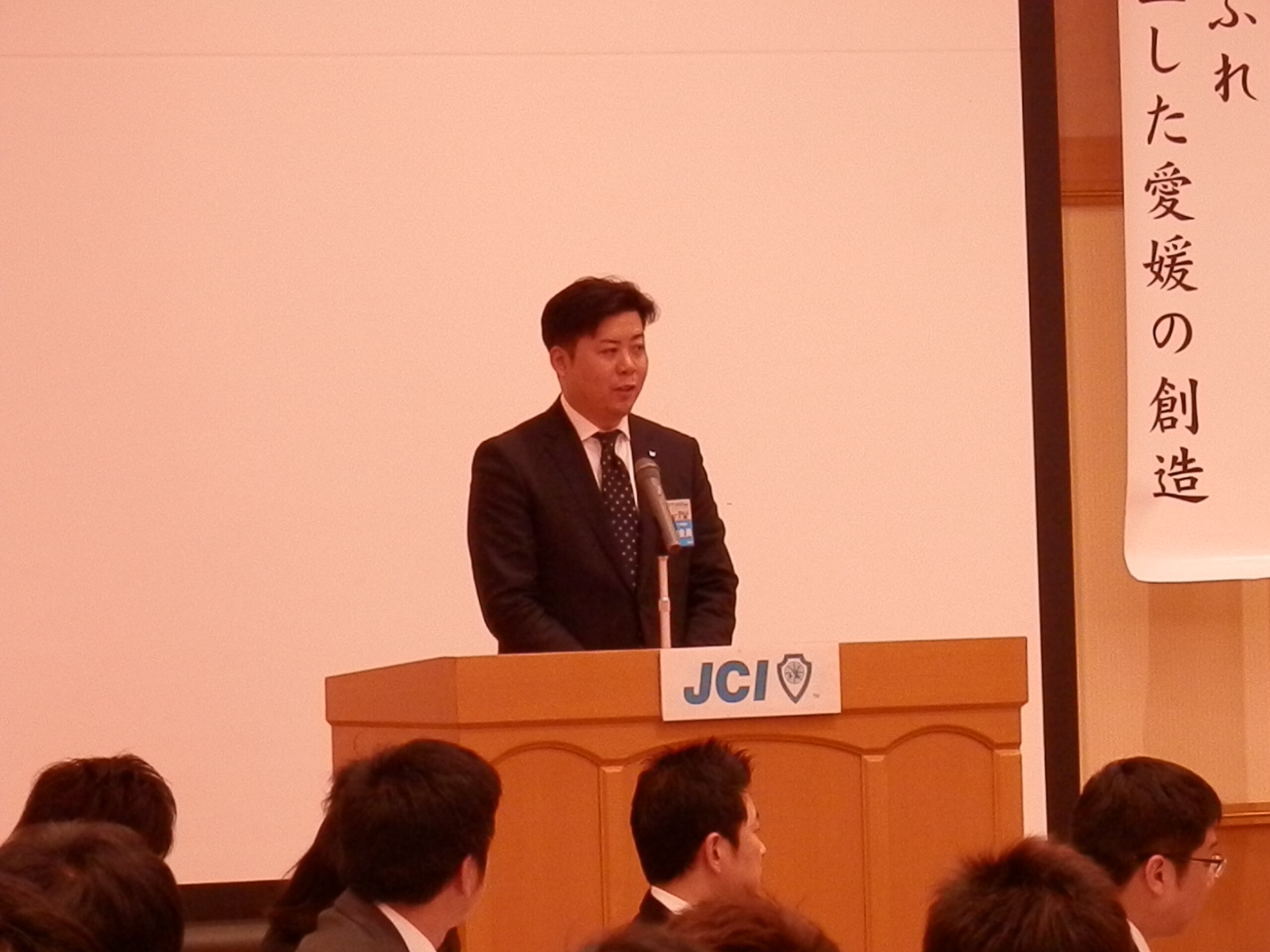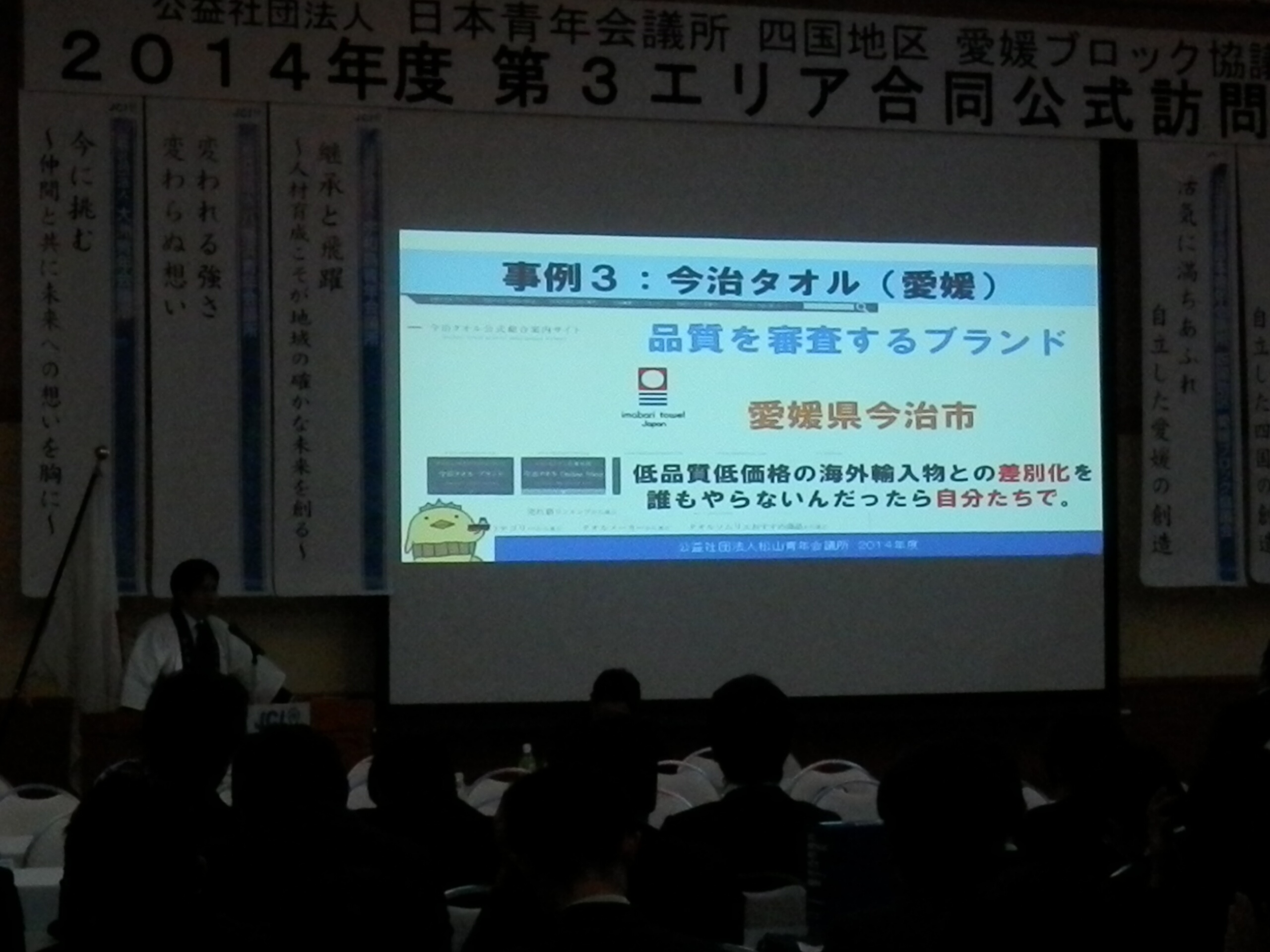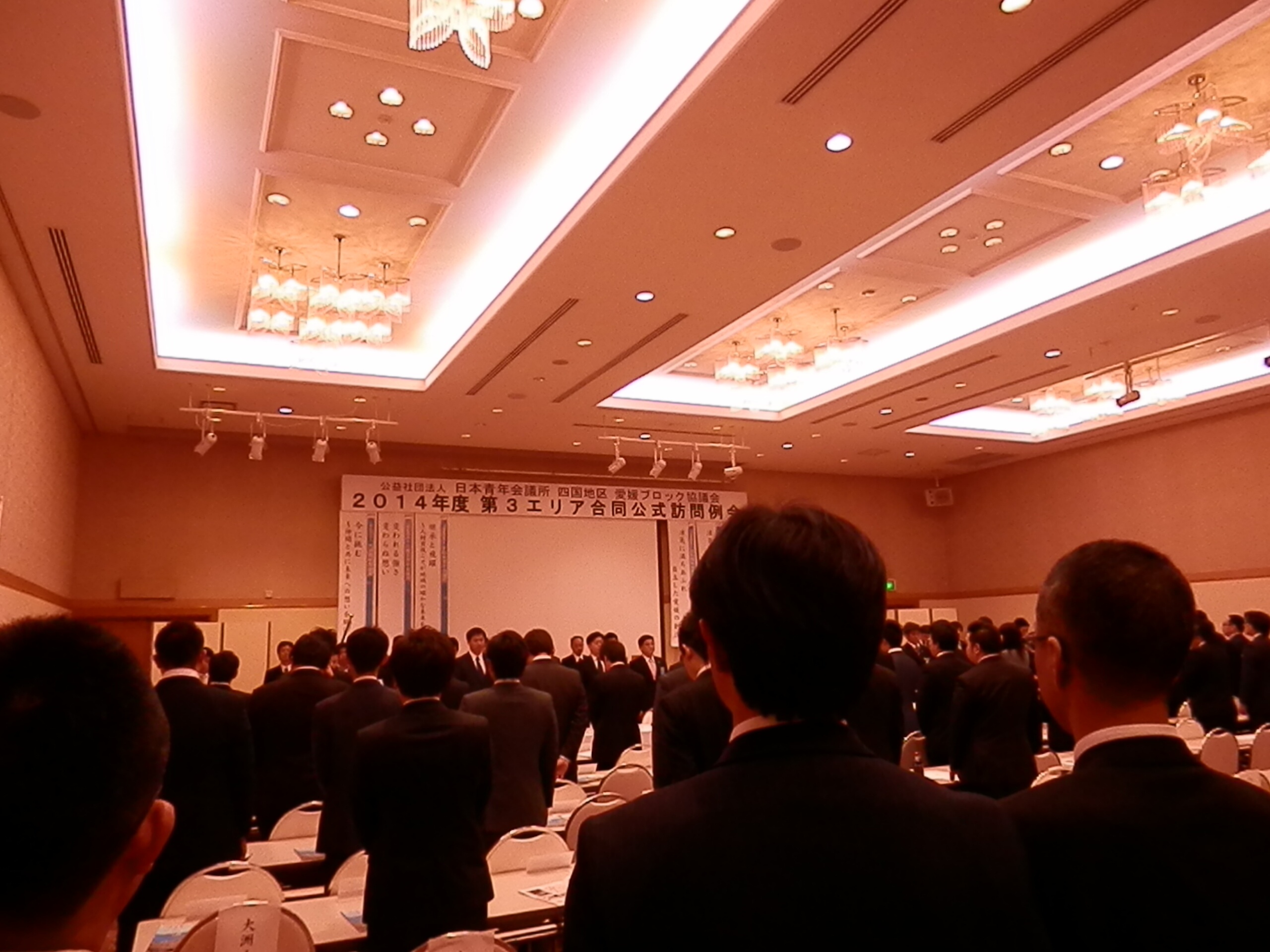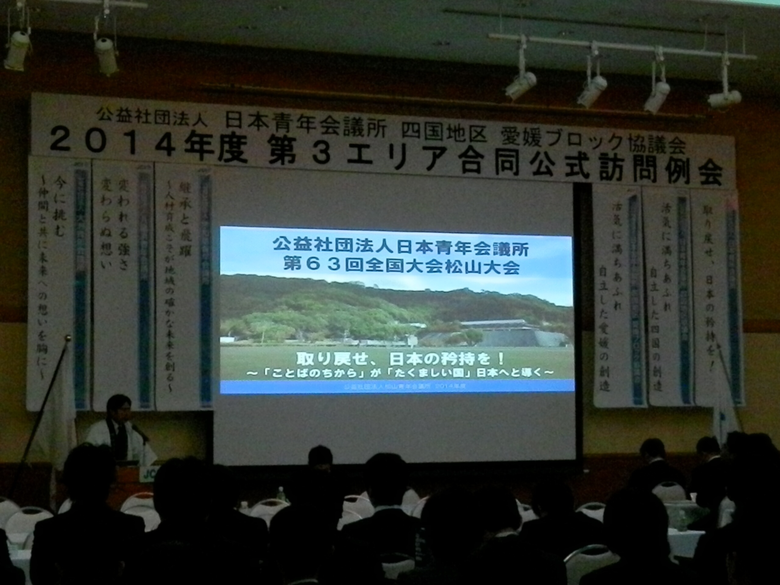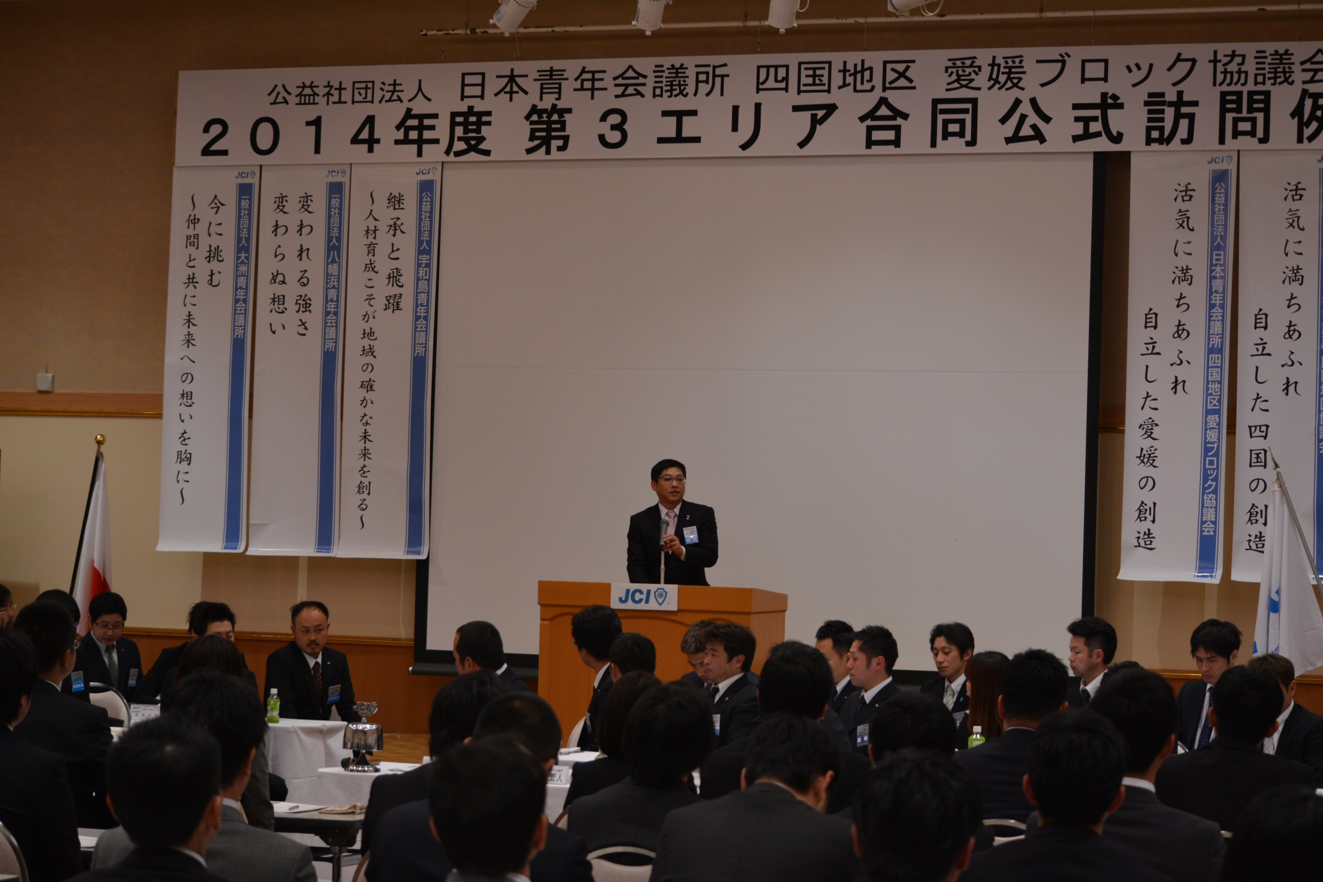 4月14日(月)、大洲市のリジェール大洲にて「公益社団法人日本青年会議所 四国地区 愛媛ブロック協議会 2014年度 第3エリア合同公式訪問例会」が行われました。松山からも多くのメンバーでオブザーブ参加し、例会アワーでは西村理事長より『第63回全国大会松山大会について』のPR等もさせていただきました。