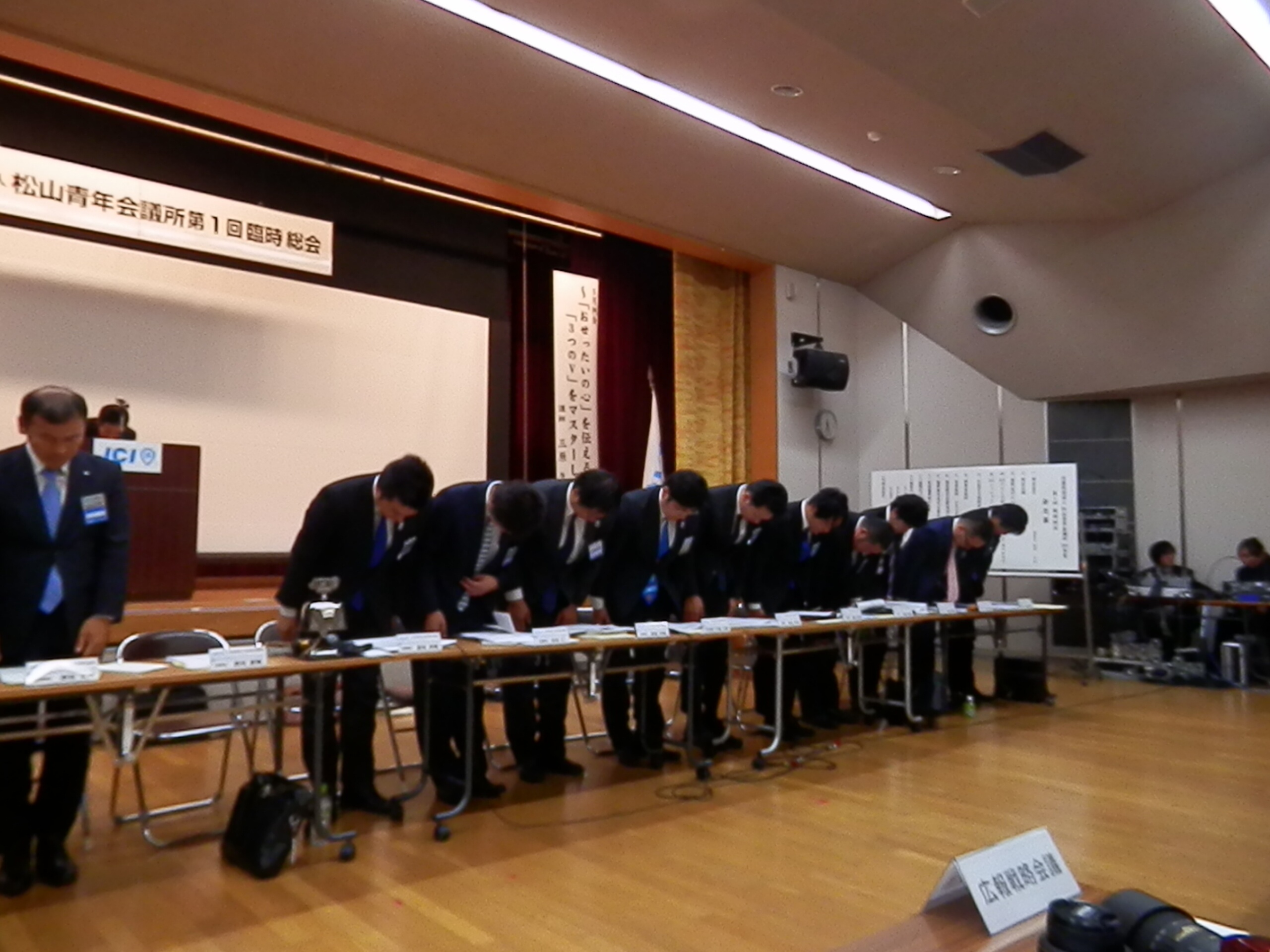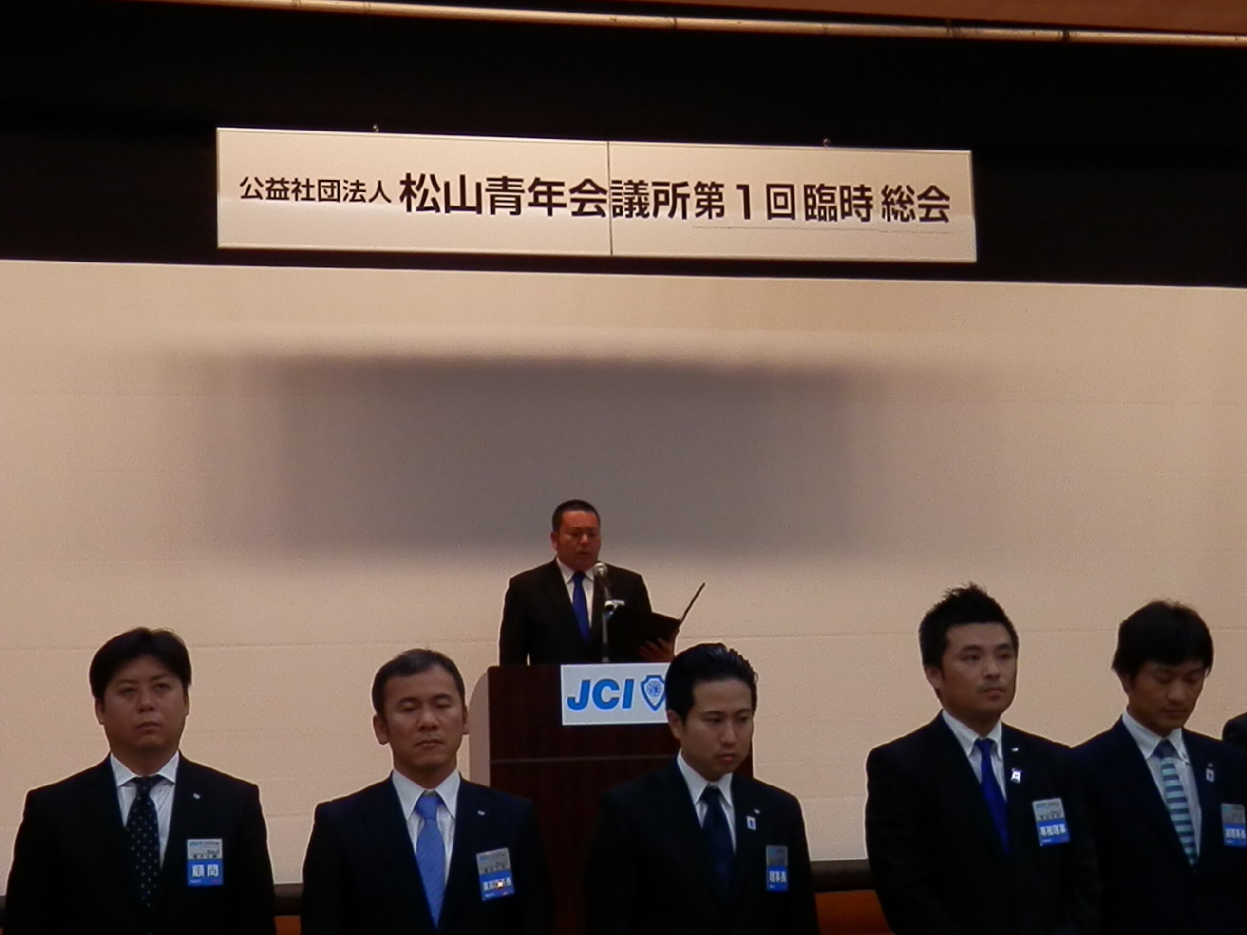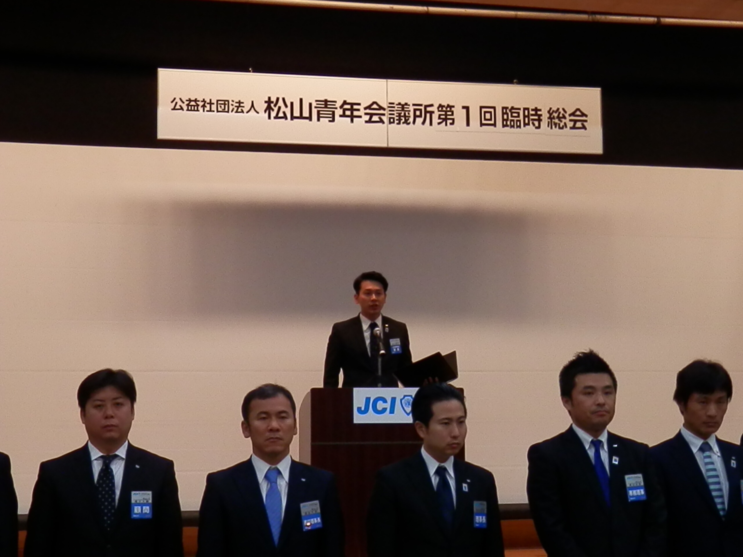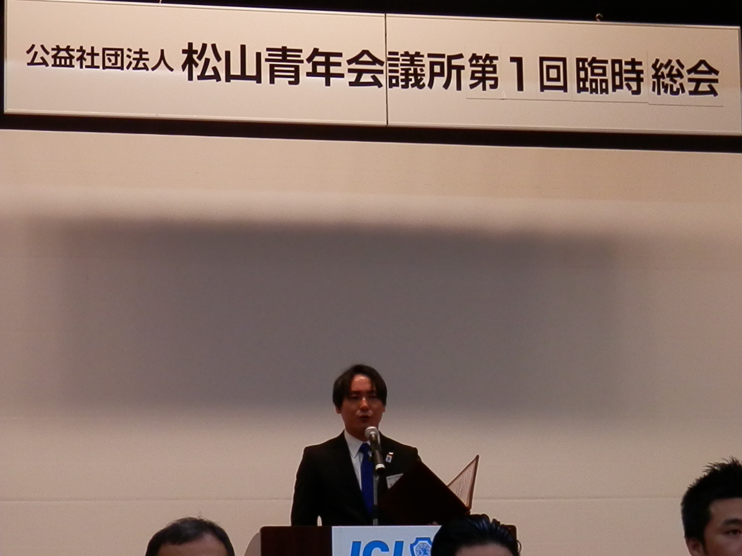 2014年5月21日(水) 5月20日 第1回臨時総会 5月20日(火)、公益社団法人松山青年会議所2014年度第1回臨時総会が松山市青少年センターで開催されました。今年度1月~3月の社団法人格時の決算と4月以降の公益社団法人としての決算などが、全会一致で可決されました。