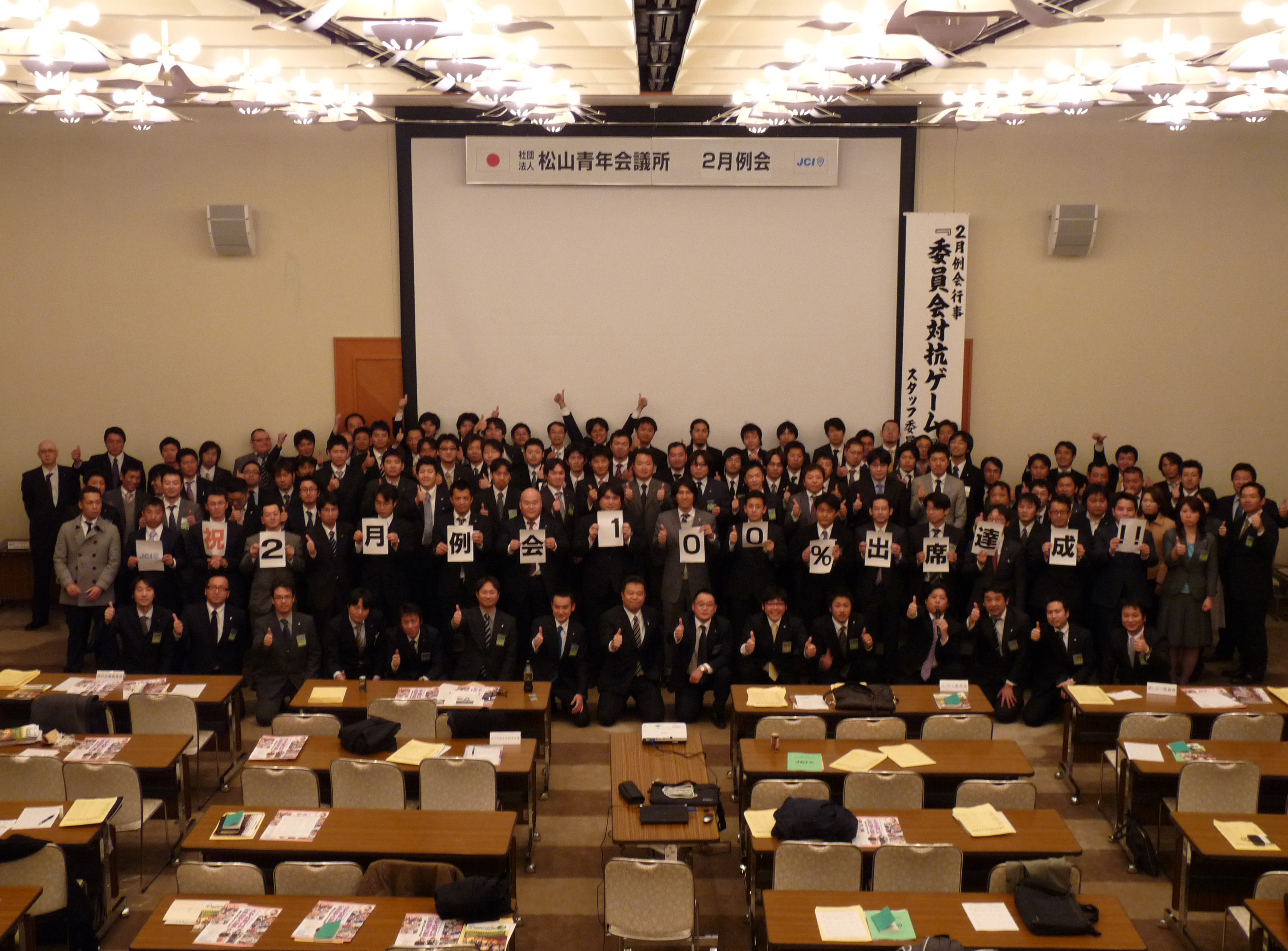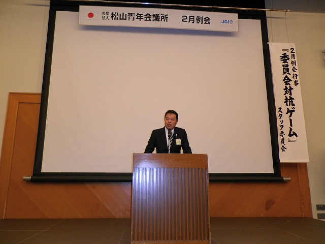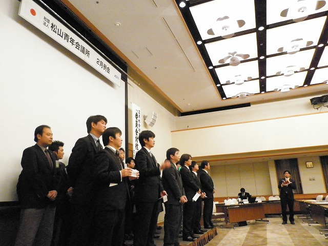 2月15日(火)松山市コミュニティーセンターにて2月例会が開催されました。2011年度初めに大野理事長より、松山LOMメンバーみんなが団結、絆を深めるべく、例会全員出席をしよう100%例会を達成したいと言われてました。