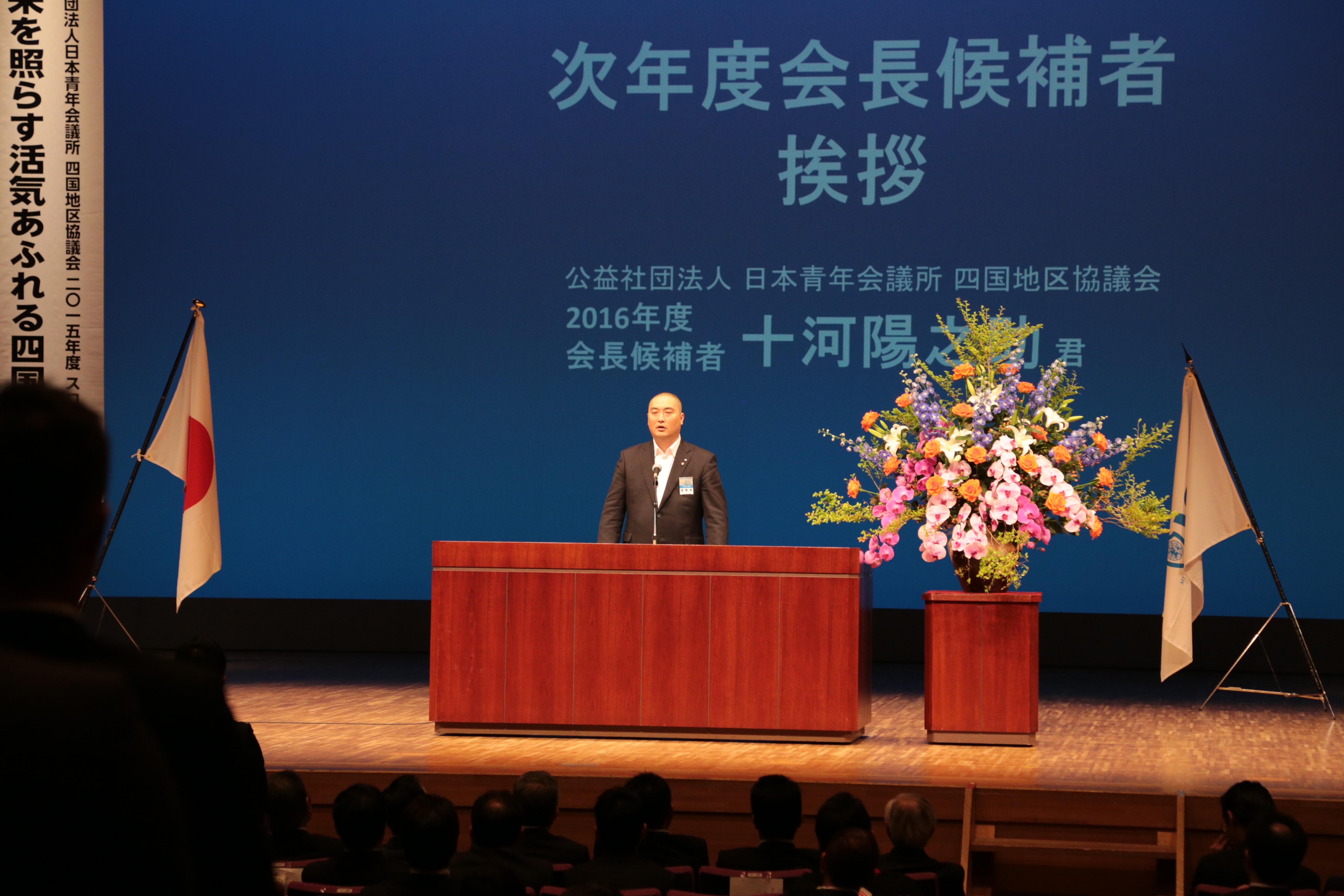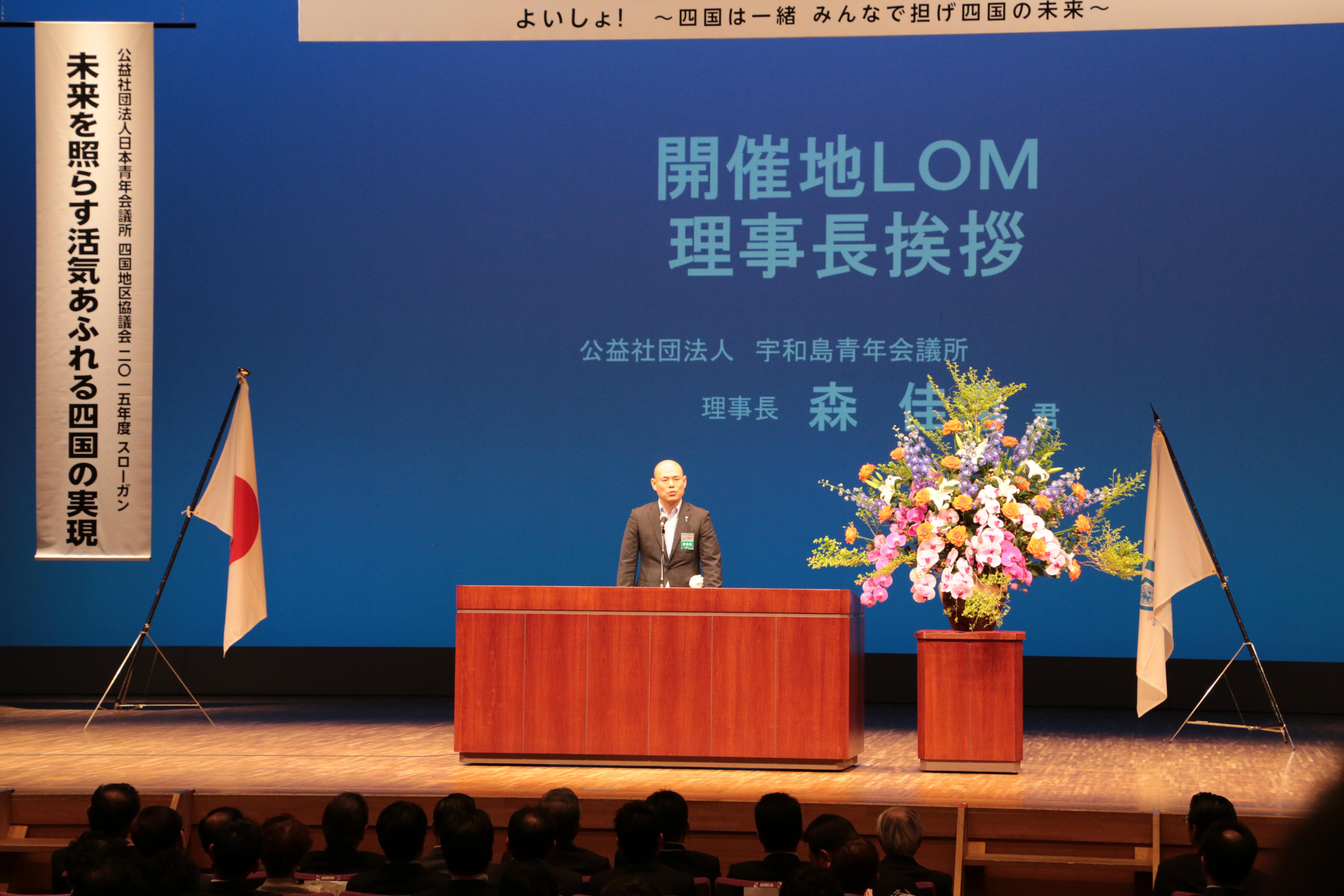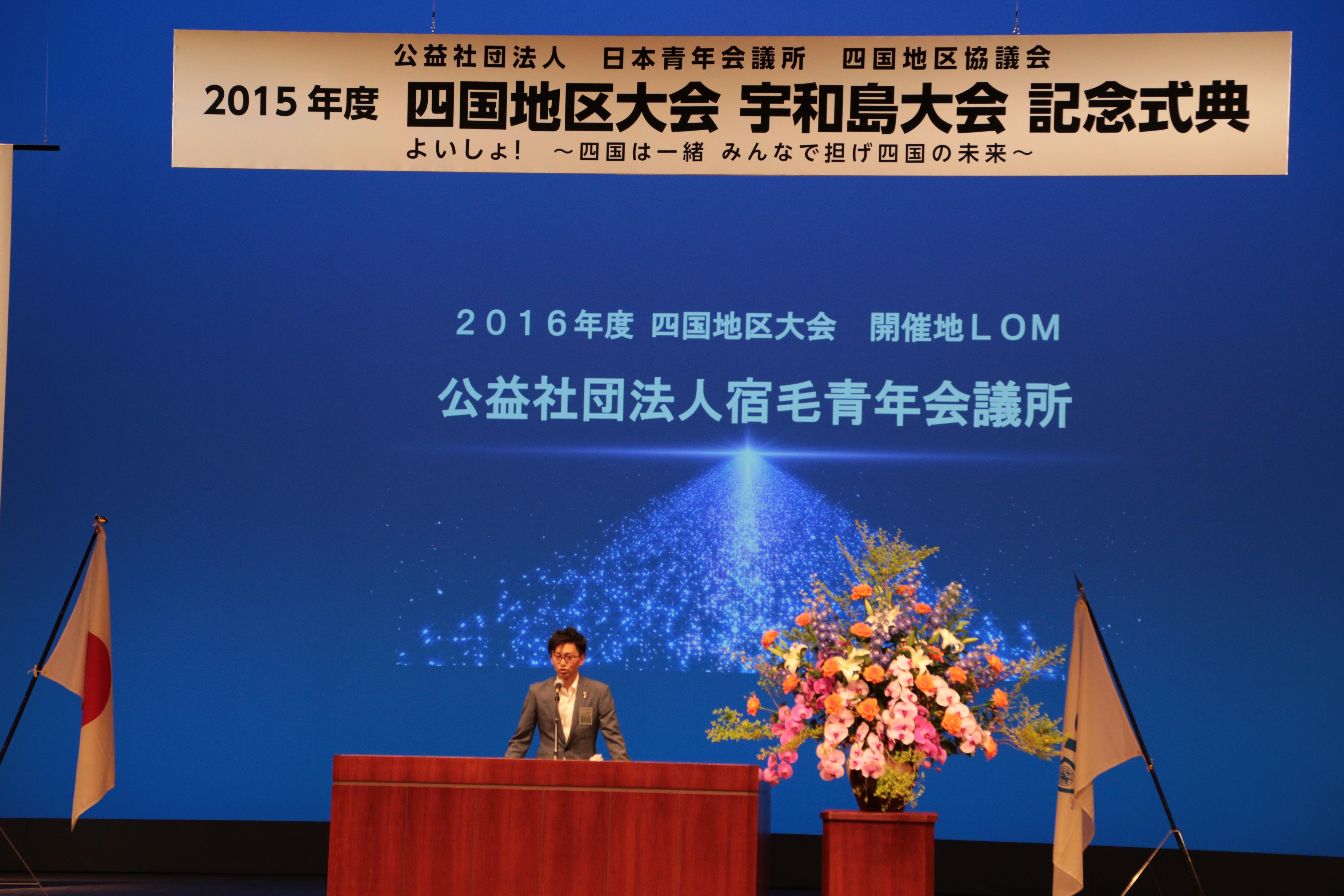 午後からの記念式典は「よいしょ! ~四国は一緒 みんなで担げ四国の未来~」をスローガンに、宇和島市最大のホール、南予文化会館にて執り行われました。日本青年会議所四国地区協議会副会長の藤本君の開会宣言に始まった記念式典は、来賓の皆さまをはじめ各LOMからも多くのメンバーを迎え、盛大に進行されました。各LOMの来訪紹介では各地の理事長が大会スローガンの「よいしょ!」で挨拶するなど笑いを誘う場面も。次々に響く「よいしょ!」の音頭が場の一体感をより高めていました。式典の最後には2016年度四国地区協議会会長候補者に公益社団法人高松青年会議所の十河陽之助君が、そして四国地区大会の開催LOMに公益社団法人宿毛青年会議所が発表され、大会旗を引き継ぎ閉会となりました。