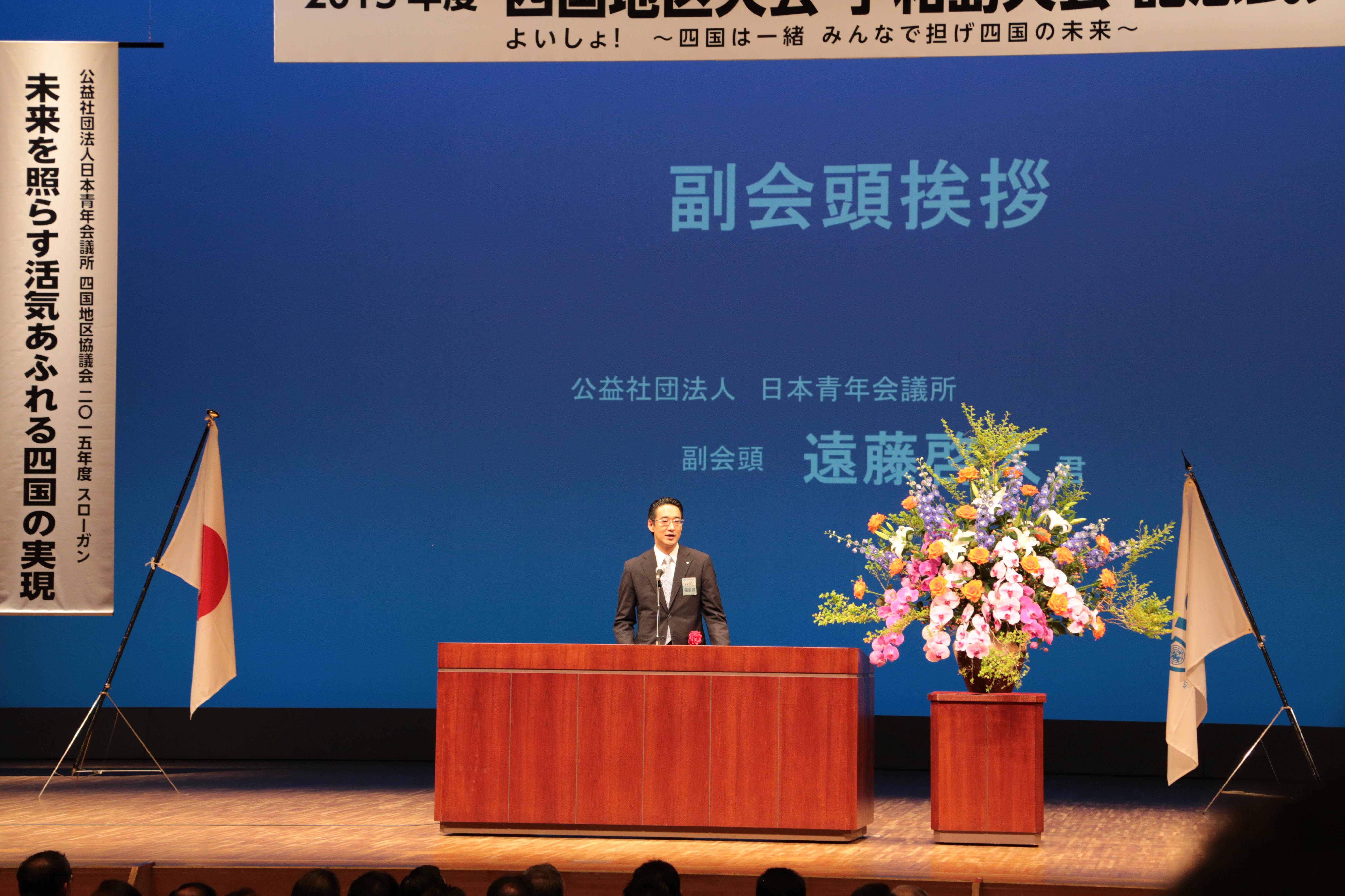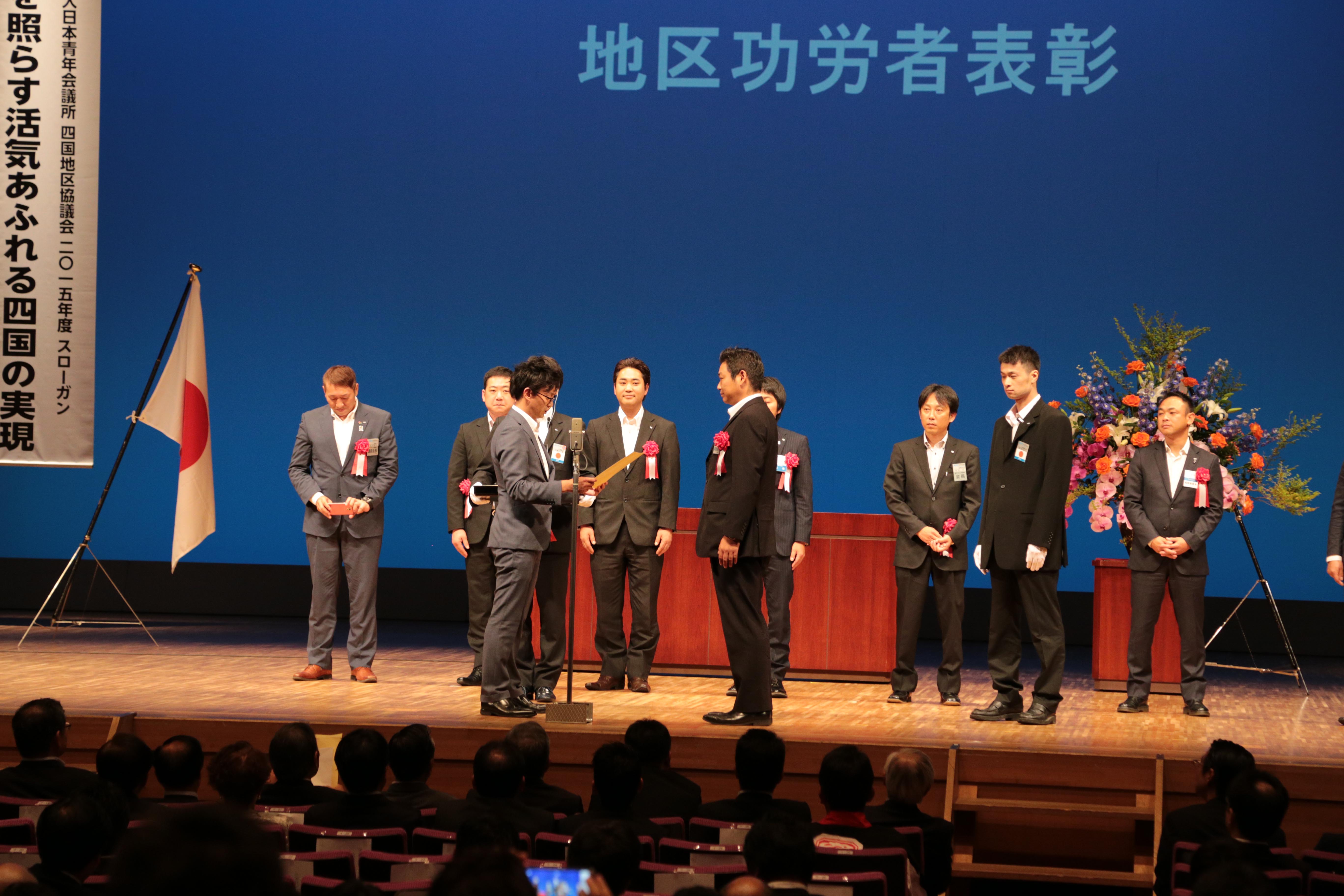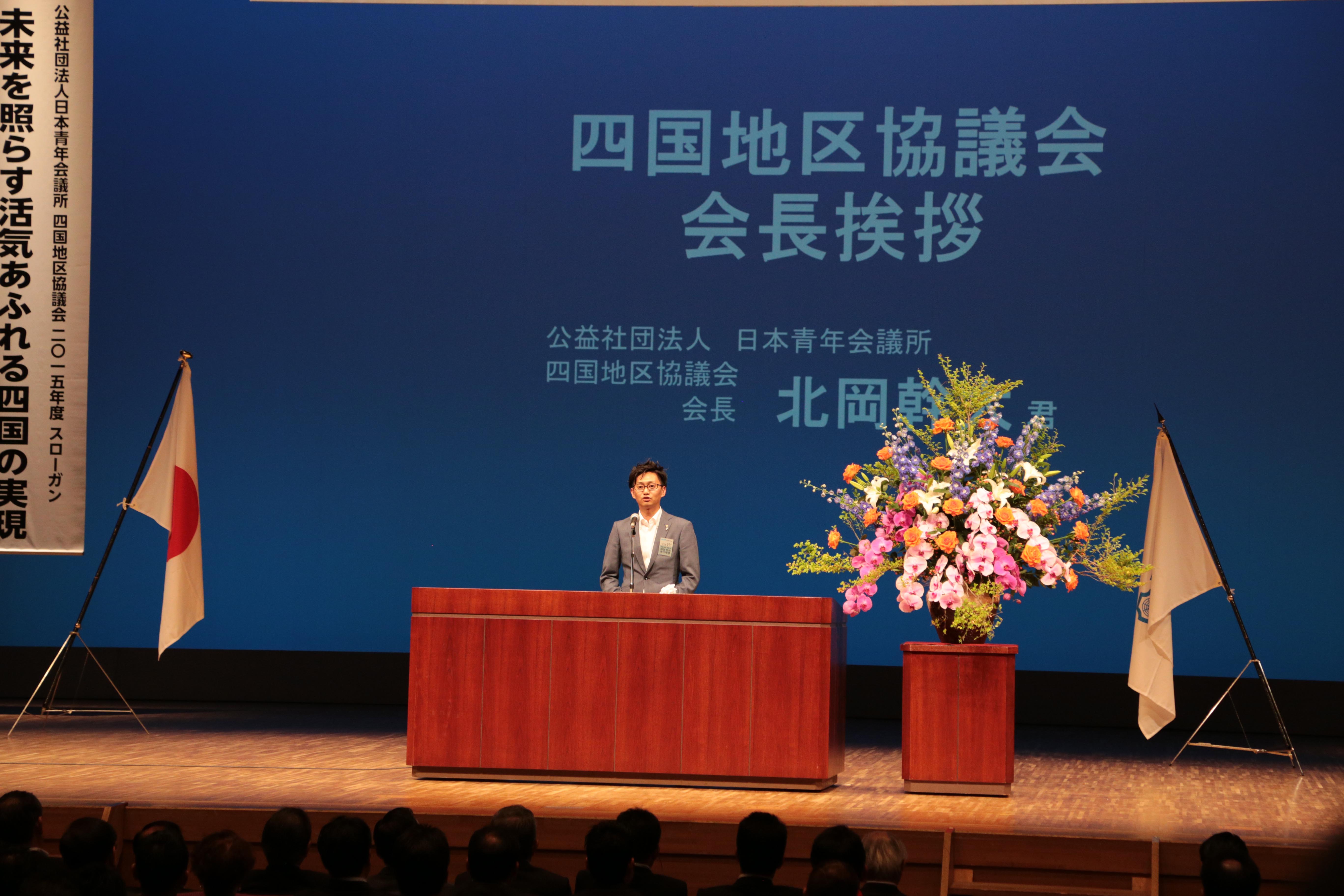 午後からの記念式典は「よいしょ! ~四国は一緒 みんなで担げ四国の未来~」をスローガンに、宇和島市最大のホール、南予文化会館にて執り行われました。日本青年会議所四国地区協議会副会長の藤本君の開会宣言に始まった記念式典は、来賓の皆さまをはじめ各LOMからも多くのメンバーを迎え、盛大に進行されました。各LOMの来訪紹介では各地の理事長が大会スローガンの「よいしょ!」で挨拶するなど笑いを誘う場面も。次々に響く「よいしょ!」の音頭が場の一体感をより高めていました。式典の最後には2016年度四国地区協議会会長候補者に公益社団法人高松青年会議所の十河陽之助君が、そして四国地区大会の開催LOMに公益社団法人宿毛青年会議所が発表され、大会旗を引き継ぎ閉会となりました。