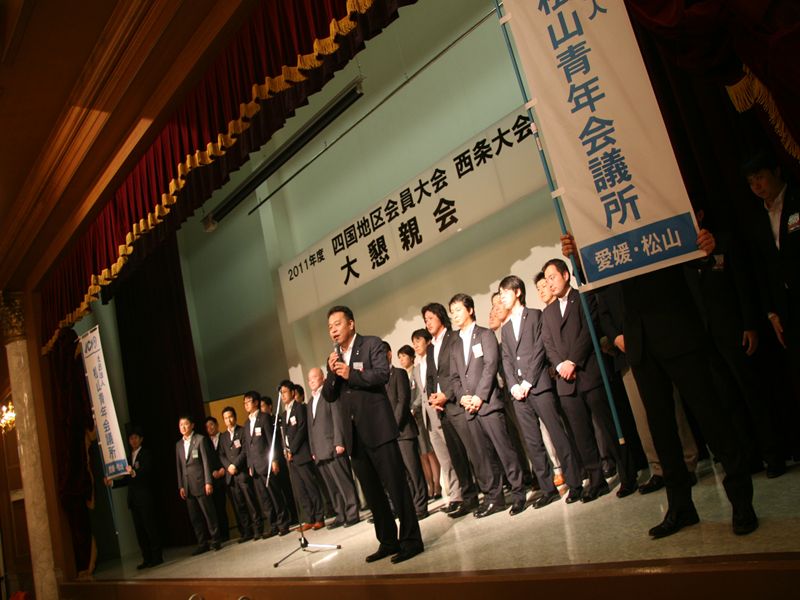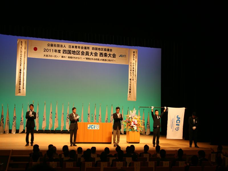 続いて、次年度地区会長の発表が行われ、2012年四国地区会長が正式にお披露目されました。高知青年会議所より出向している、福島君が選出され、来年への抱負と決意を地区内の全メンバーに向けてしっかりと宣言されました。そして2012年度の地区会員大会の主幹LOMも発表されました。来年は中村青年会議所に決定し、厳粛な雰囲気の中大会旗の伝達が行われ、記念式典の幕を閉じました。
