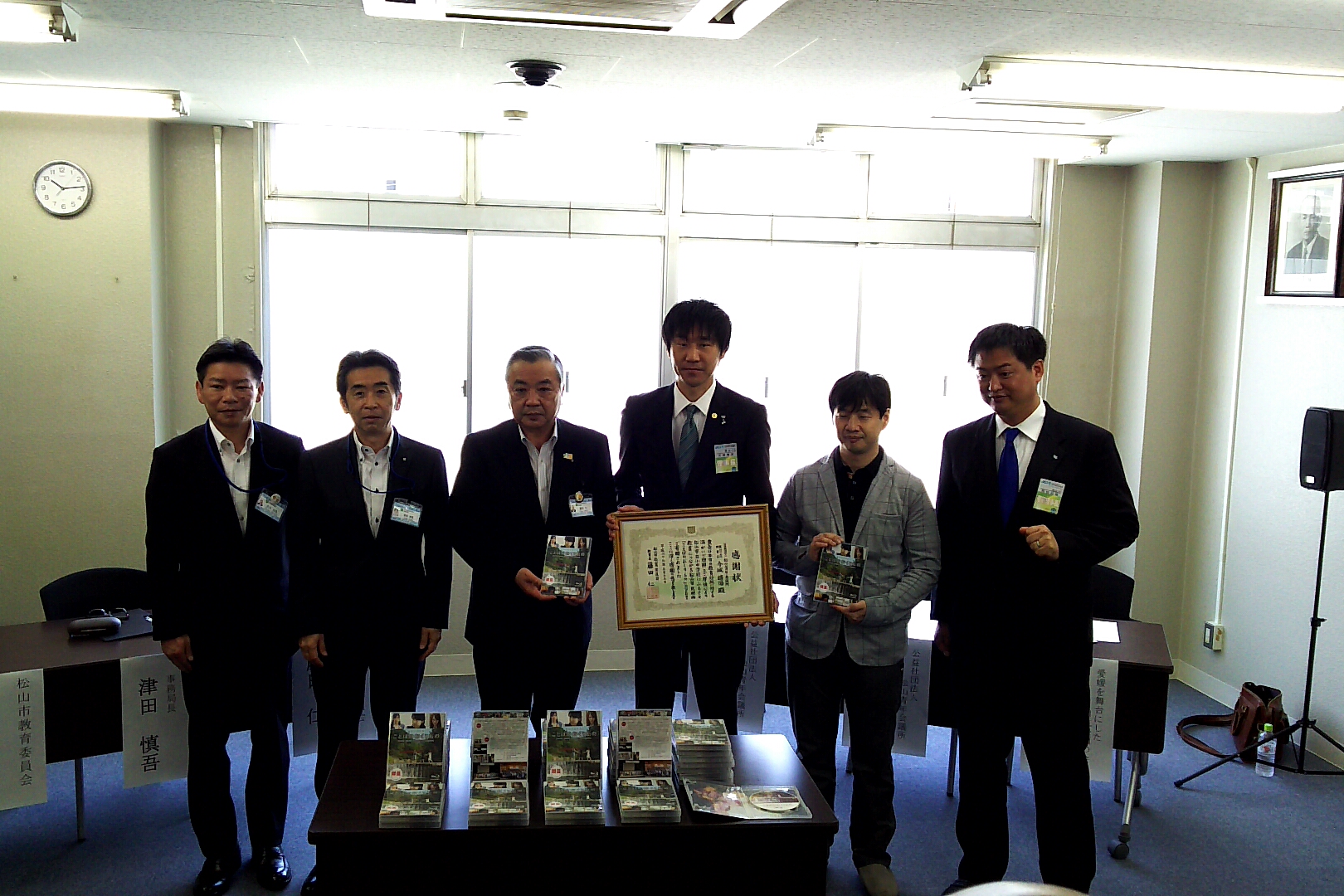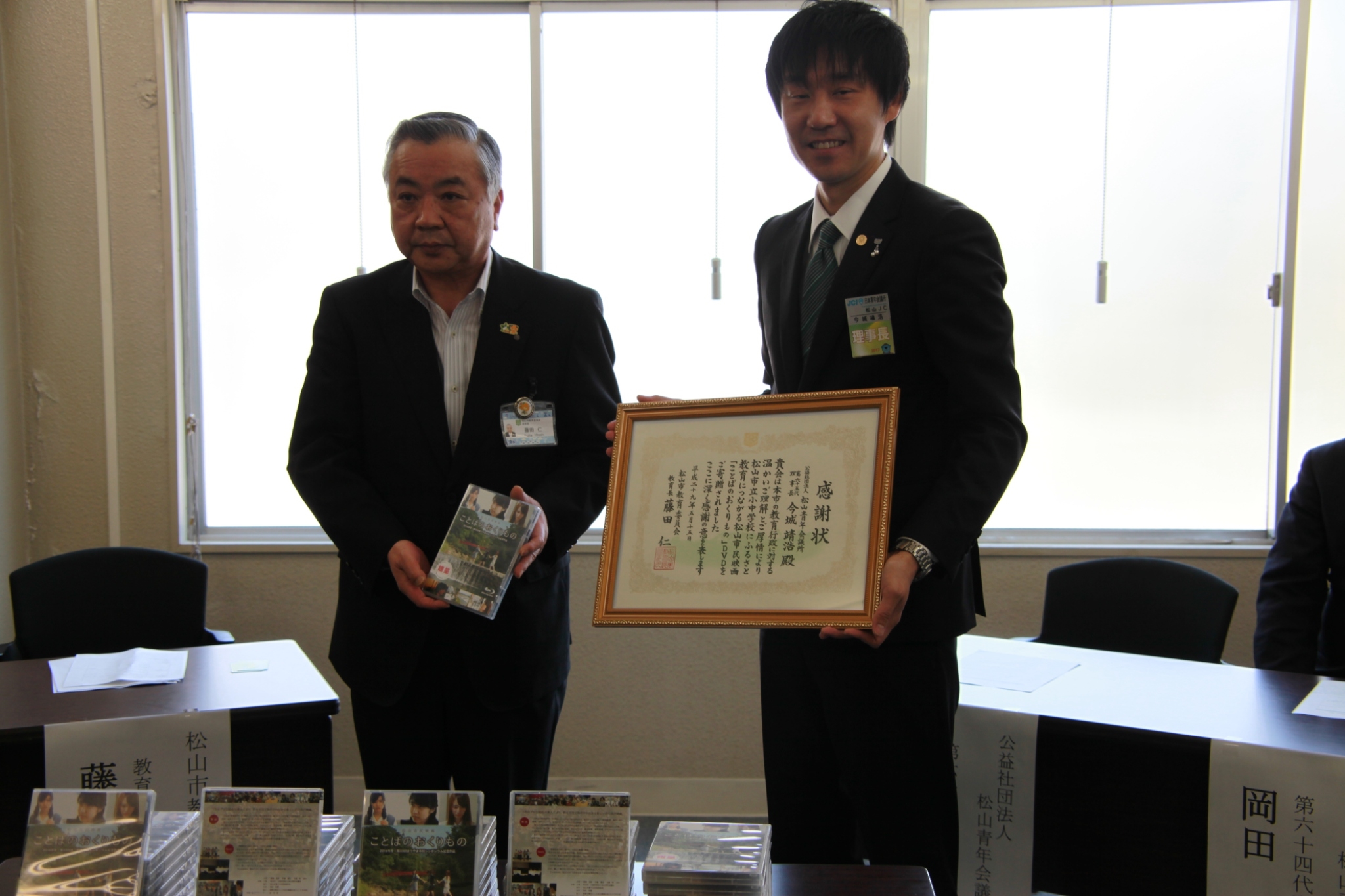2017年5月15日(月) 市民映画「ことばのおくりもの」DVDを小中学校に寄贈 2016年度に松山青年会議所が制作した市民映画「ことばのおくりもの」。今城理事長をはじめとするメンバーが松山市役所を訪れ、松山市立の小中学校全83校と図書館にDVDを寄贈しました。約80人の市民が役者や撮影スタッフとして携わった市民映画が、まさしく“まつやまの宝”として、受け継がれていきます。