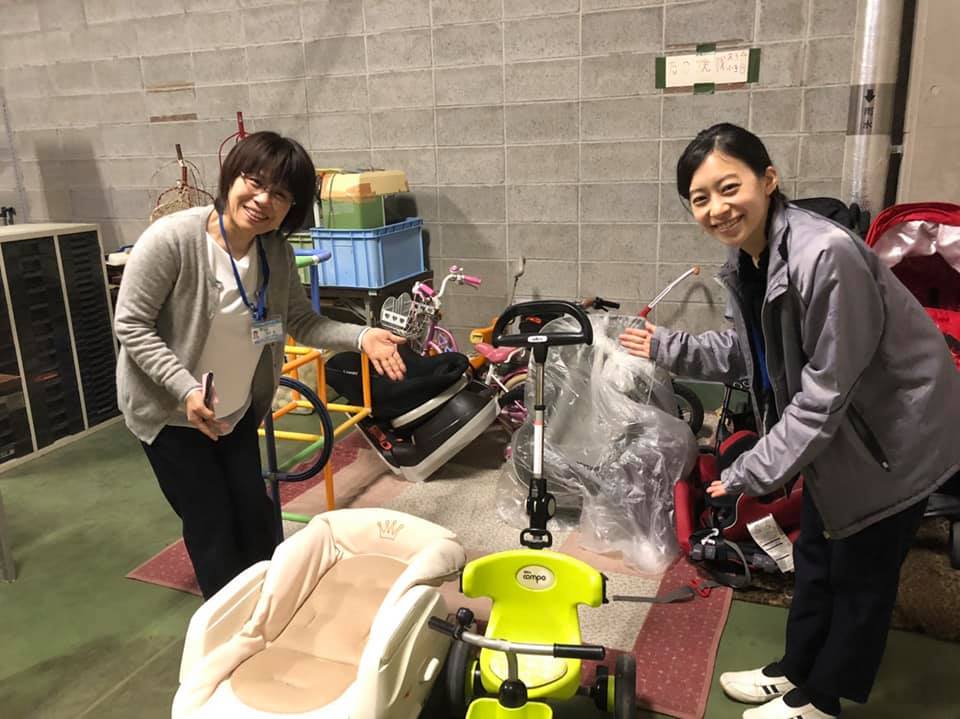 今回はベビーカーや三輪車に加えて半紙や色紙、ねんど、色鉛筆、はさみなど学用品も多く提供いただきました