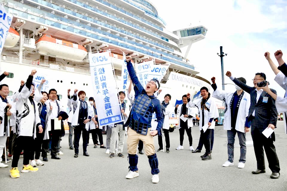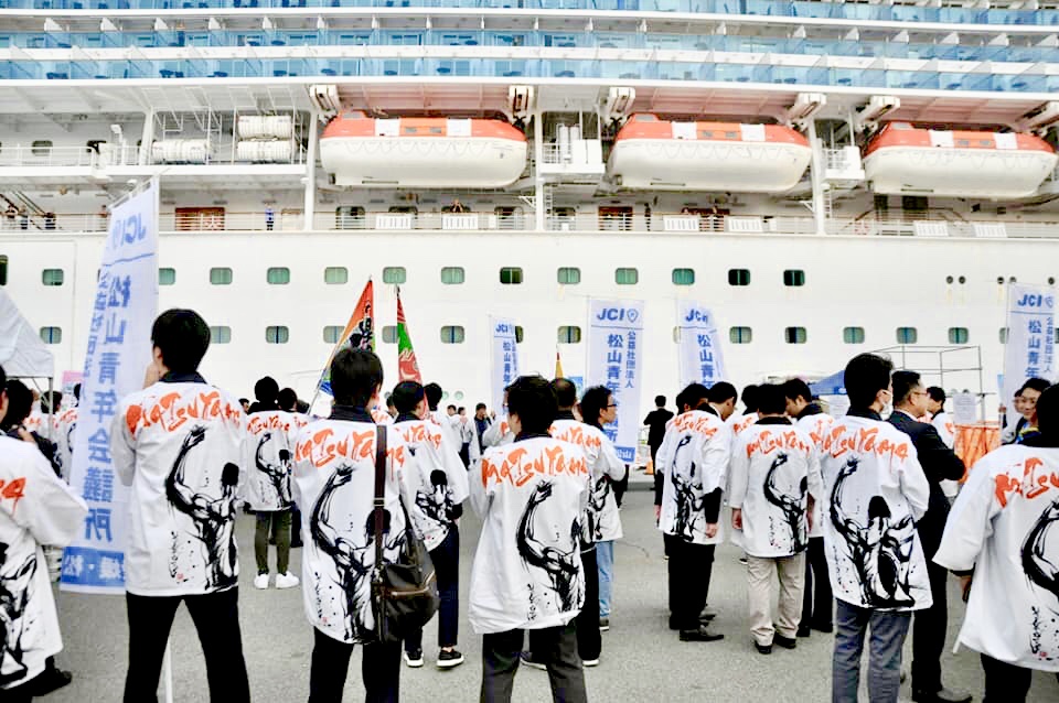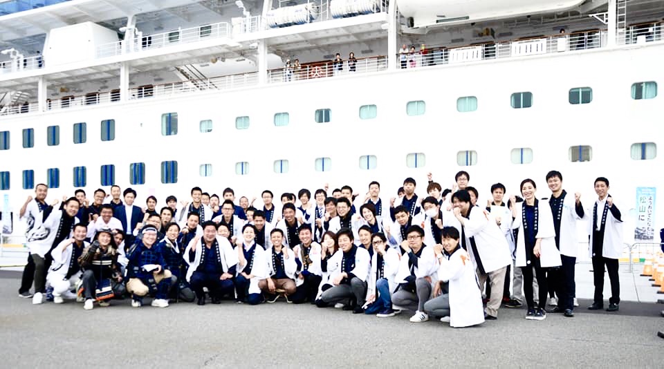 今回は大型豪華客船『ダイヤモンド・プリンセス』の愛媛初寄港の入港、出航に立ち会い、更には、道後商店街からくり時計前にて外国人観光客に浴衣を着ていただき、撮影フレームを持ち記念撮影をサポートしました。