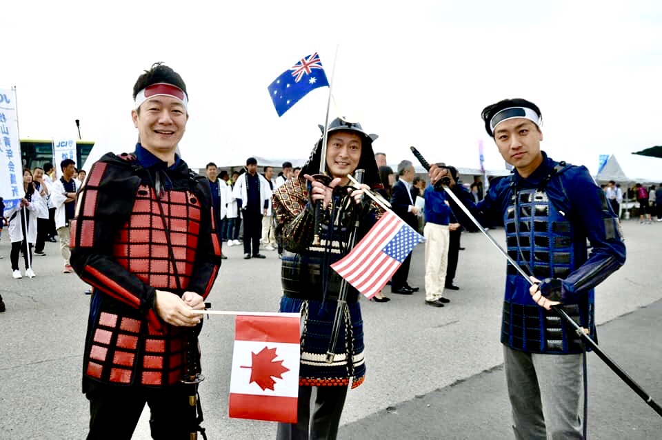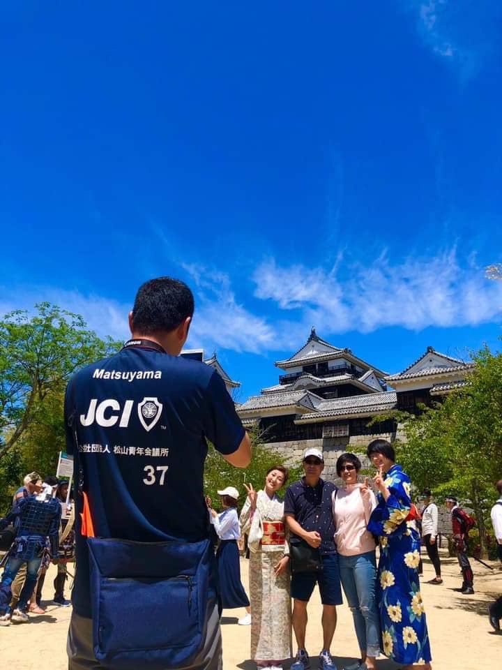 そして、松山城本丸広場では松山JCメンバーが侍の姿で外国人観光客を歓迎し、撮影フレームを持ち記念撮影をサポートしました。