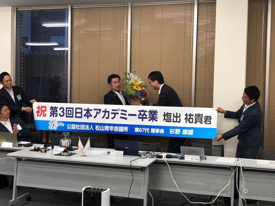 2019年6月12日(水) 第6回理事会 6月11日(月) 理事会を行いました。 今回の理事会では、総務渉外委員会 幹事 塩出 祐貴 君に「第3回日本アカデミー」の報告をしていただきました。 第3回日本アカデミーでは、 【共に変化を起こそう!】というテーマのもと、この地域のリーダーになるための3日間の研修が行われ、松山青年会議所からは総務渉外委員会 幹事 塩出 祐貴 君が参加し、カリキュラムを経て卒業致しました。 塩出 祐貴君、日本アカデミー卒業おめでとうございます!!